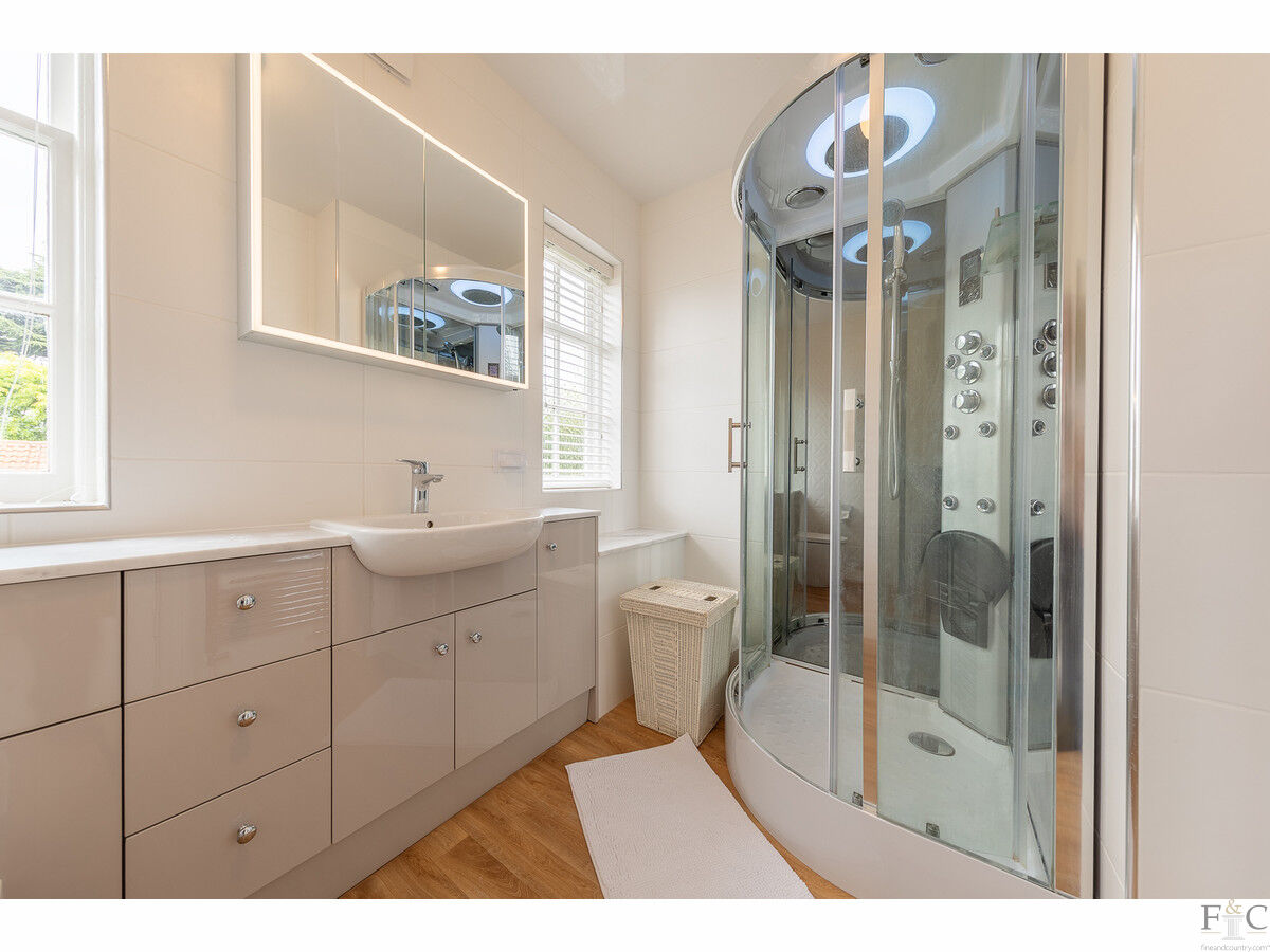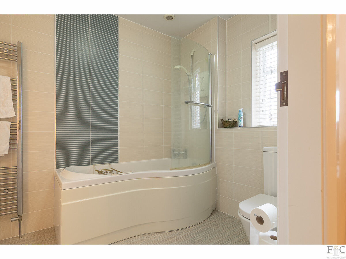 The guest large double bedroom features Jack and Jill access to a bathroom with a bath, also accessible from the hallway. Three further well-proportioned bedrooms share a modern shower room, updated with a luxurious hydro shower cubicle and floor-to-ceiling tiling, ensuring every comfort is met.