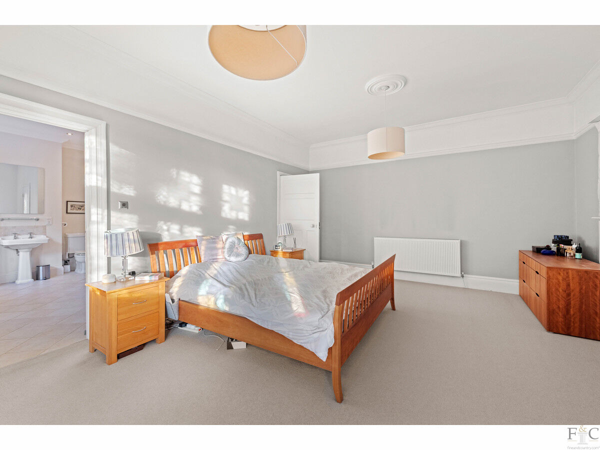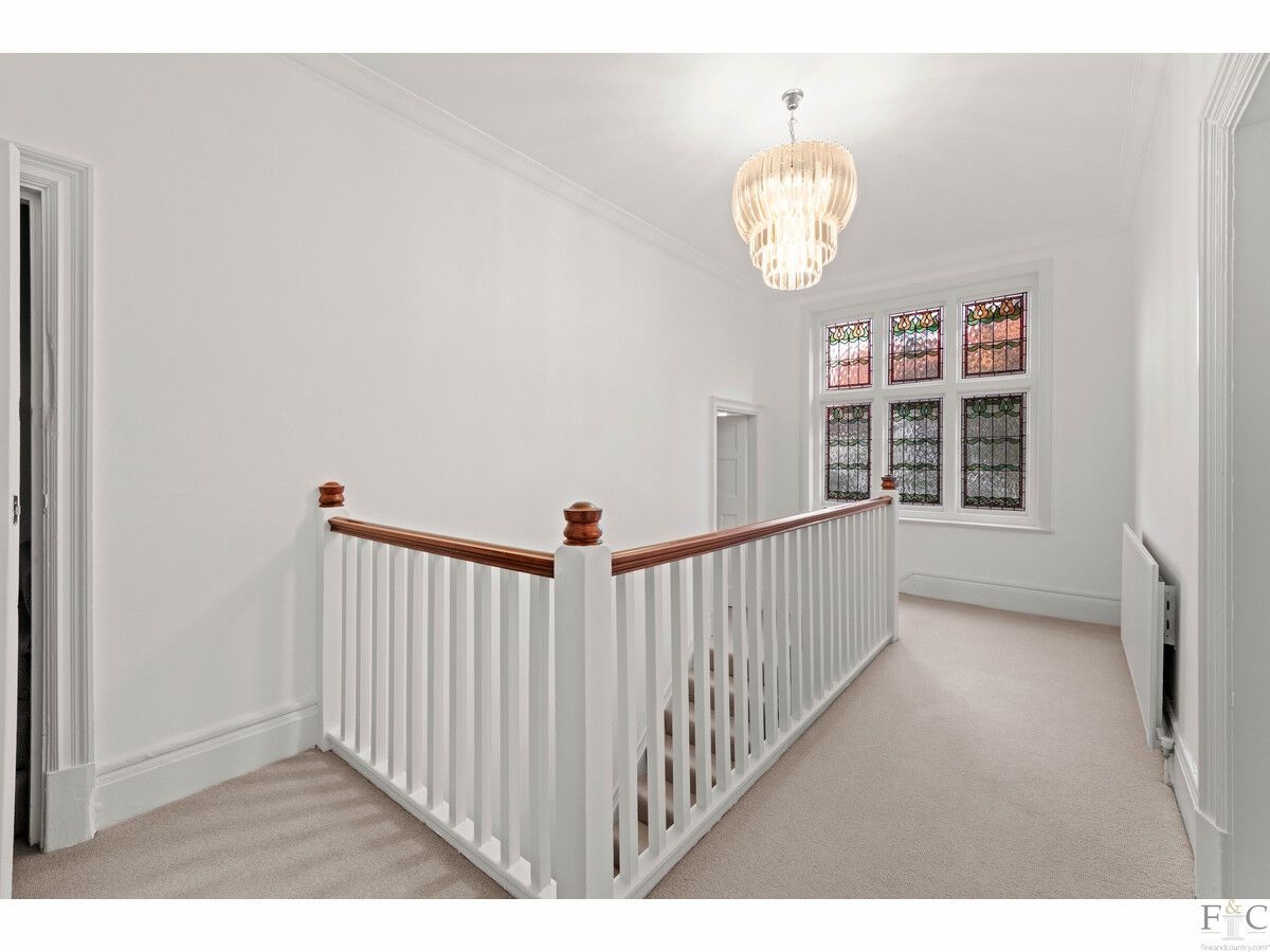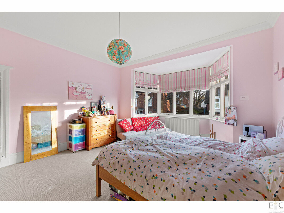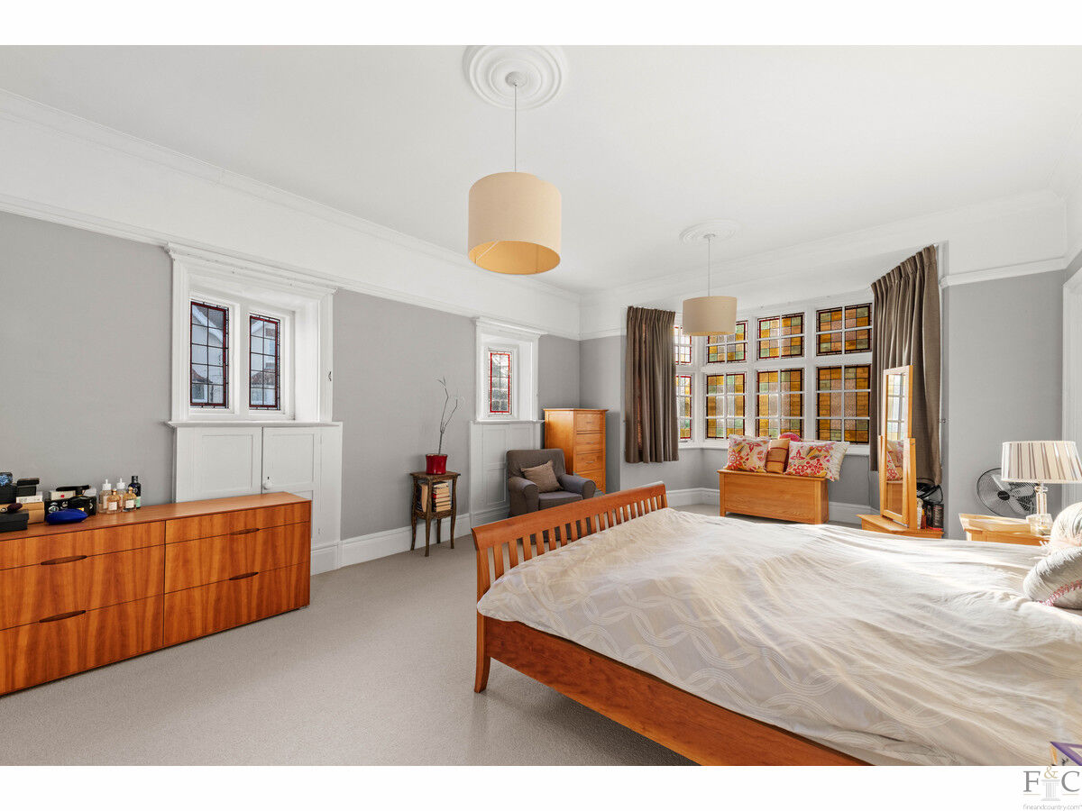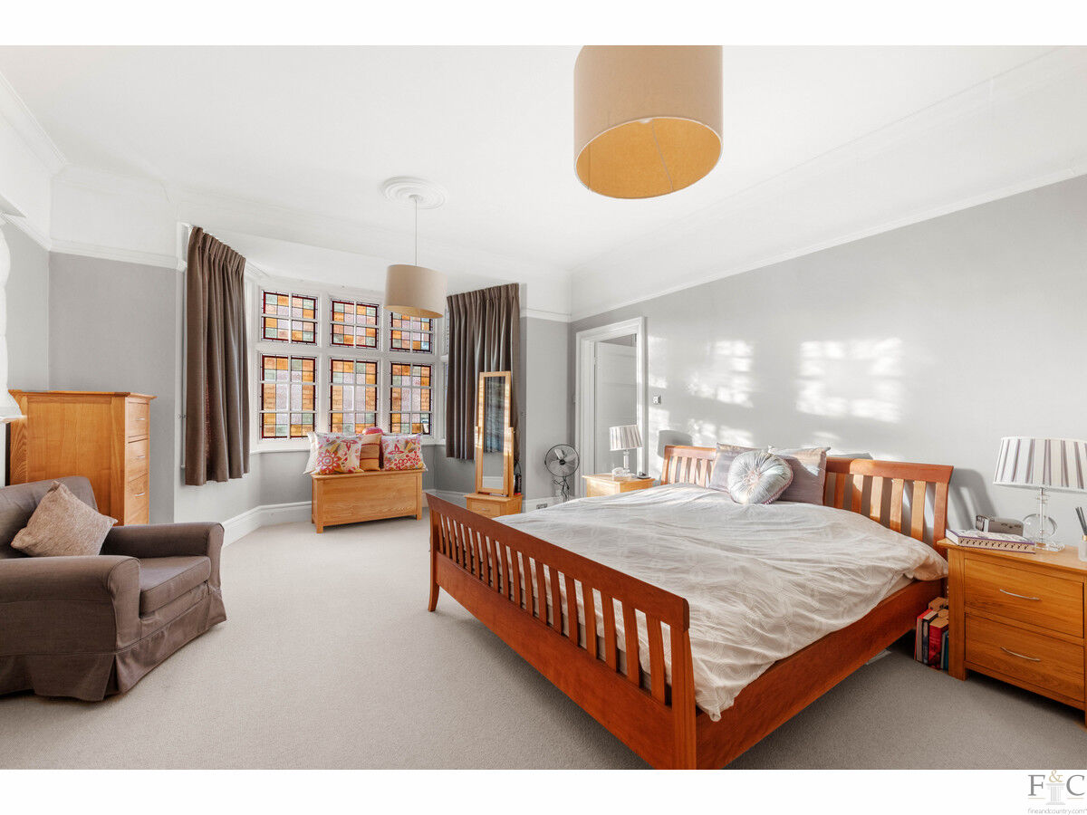 Ascending the original staircase, a private retreat awaits on the first floor. The master bedroom dazzles with a bay window, complemented by an ensuite bathroom adorned with underfloor heating, a bath, shower, sink, and a separate WC. The walk-in wardrobe ensures ample storage and a touch of luxury. Another spacious bedroom with a bay window and a captivating stained glass large window complete this floor.