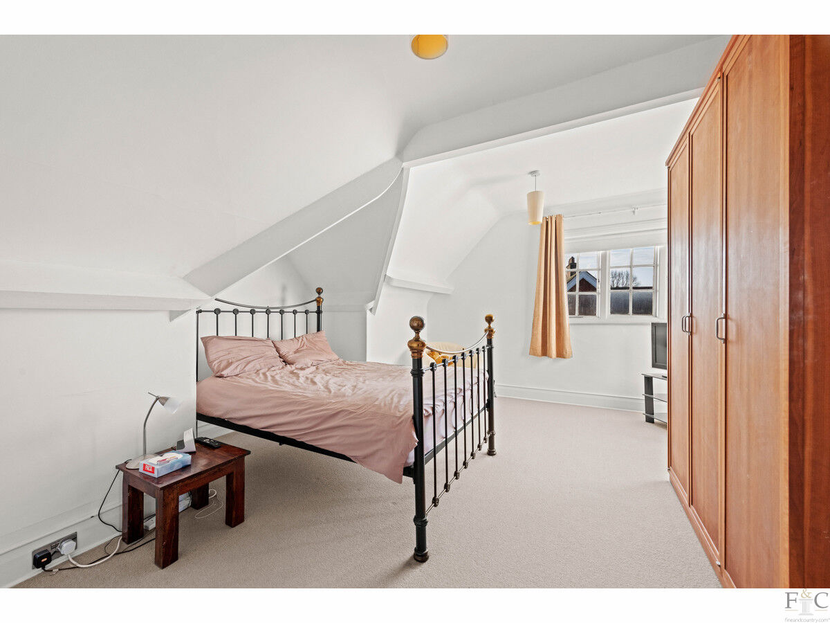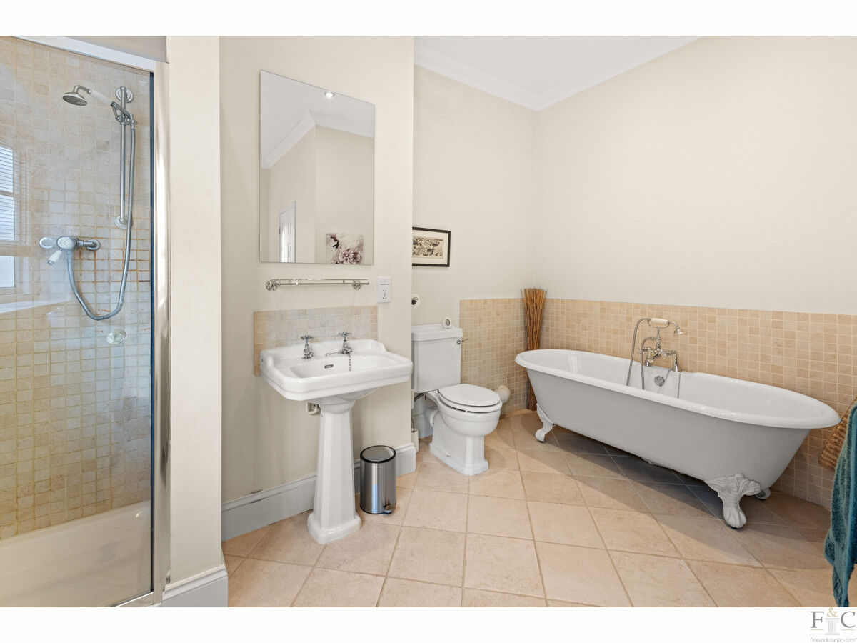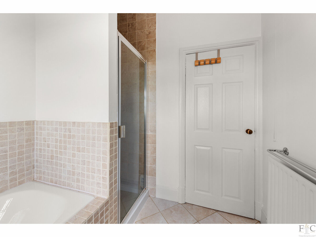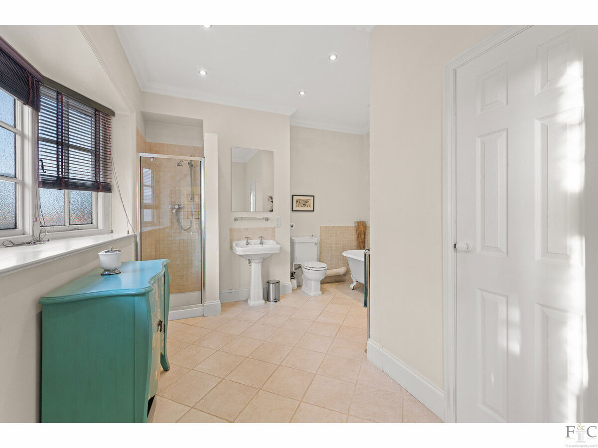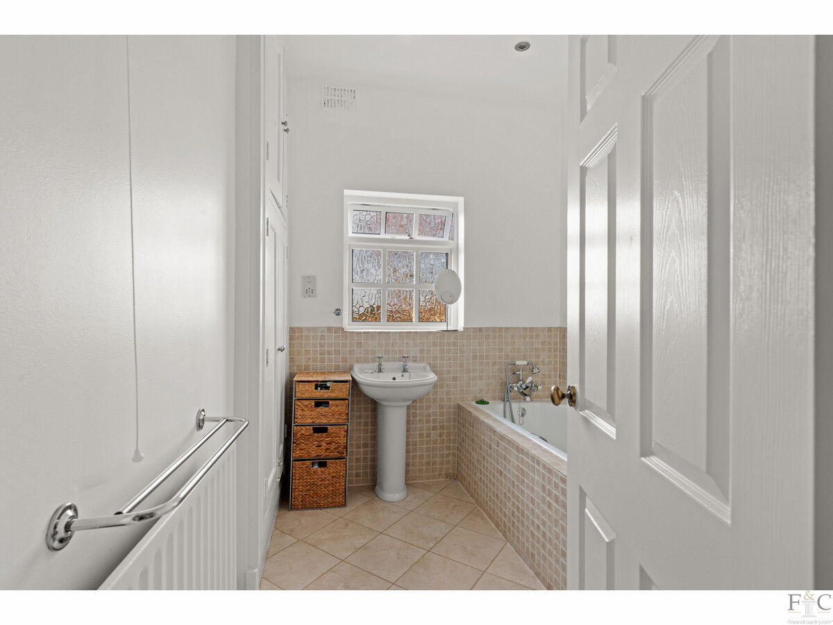 Ascending the original staircase, a private retreat awaits on the first floor. The master bedroom dazzles with a bay window, complemented by an ensuite bathroom adorned with underfloor heating, a bath, shower, sink, and a separate WC. The walk-in wardrobe ensures ample storage and a touch of luxury. Another spacious bedroom with a bay window and a captivating stained glass large window complete this floor.