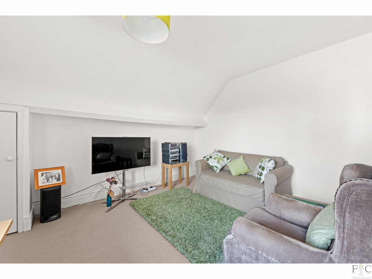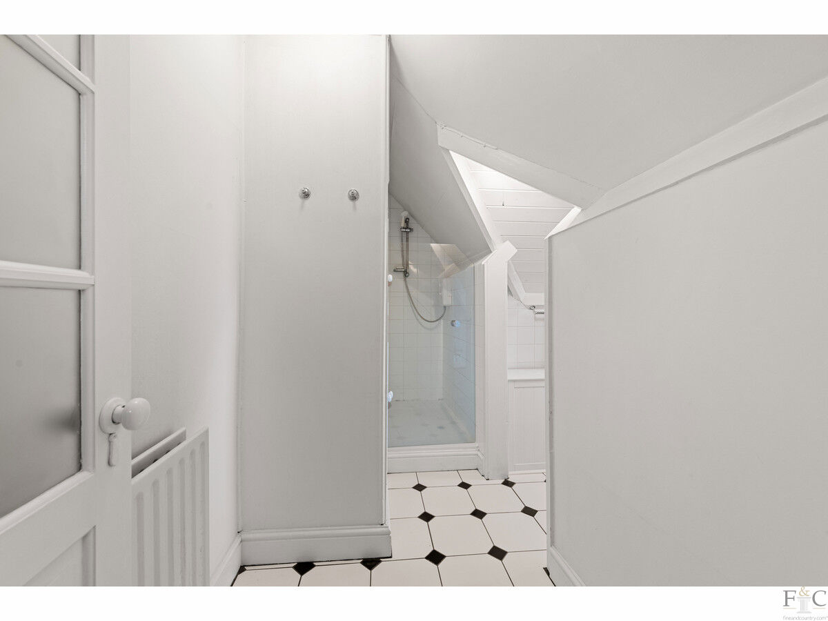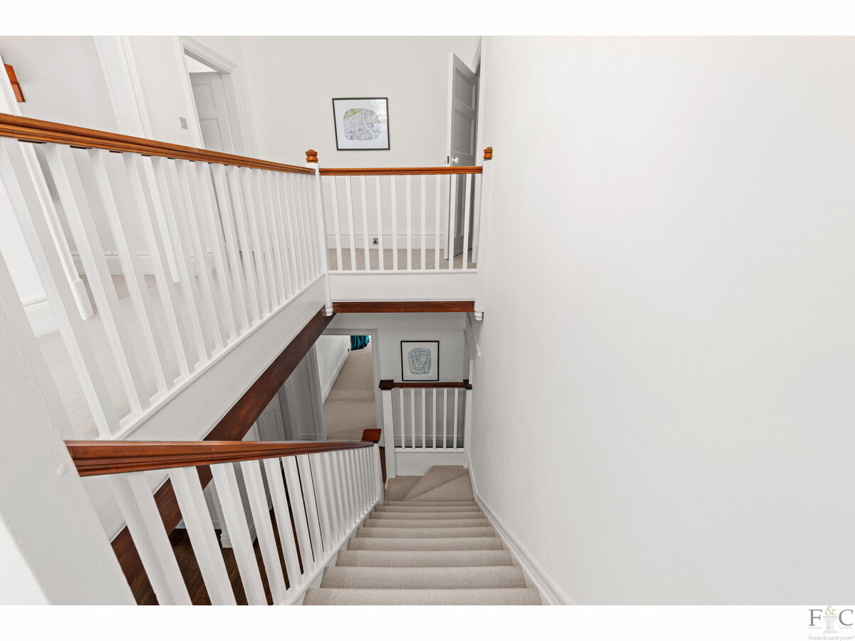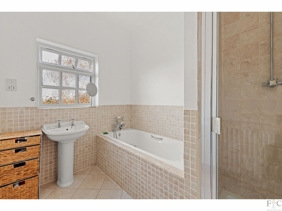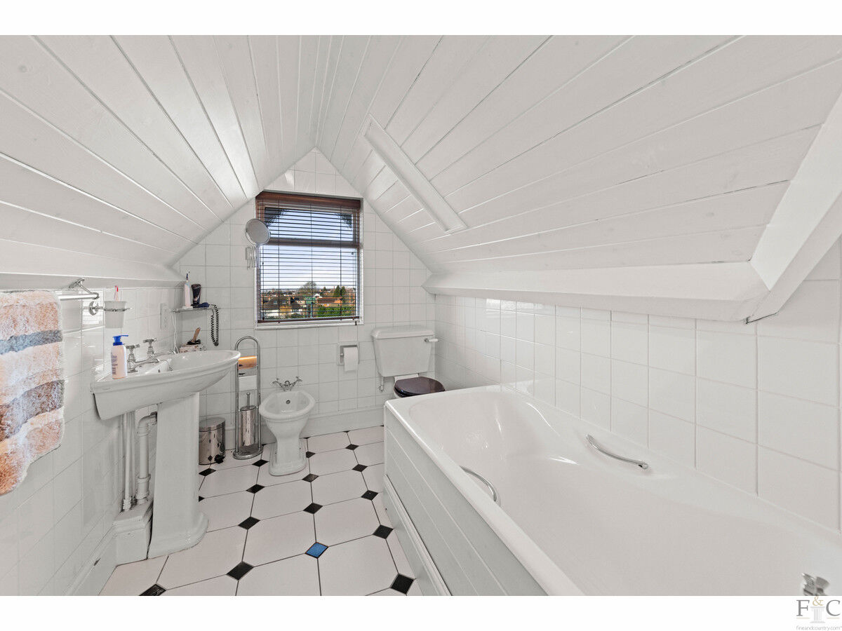 Ascending the original staircase, a private retreat awaits on the first floor. The master bedroom dazzles with a bay window, complemented by an ensuite bathroom adorned with underfloor heating, a bath, shower, sink, and a separate WC. The walk-in wardrobe ensures ample storage and a touch of luxury. Another spacious bedroom with a bay window and a captivating stained glass large window complete this floor.