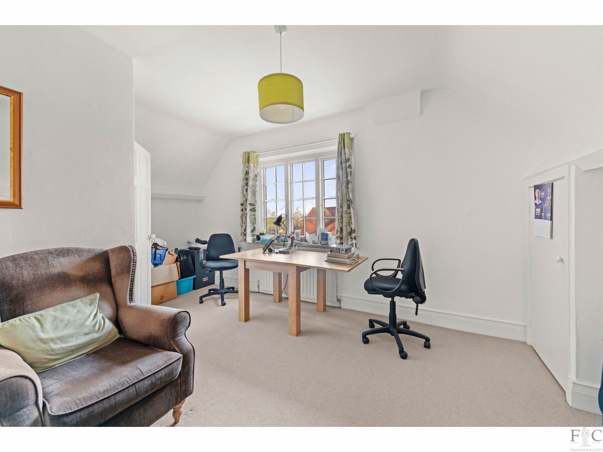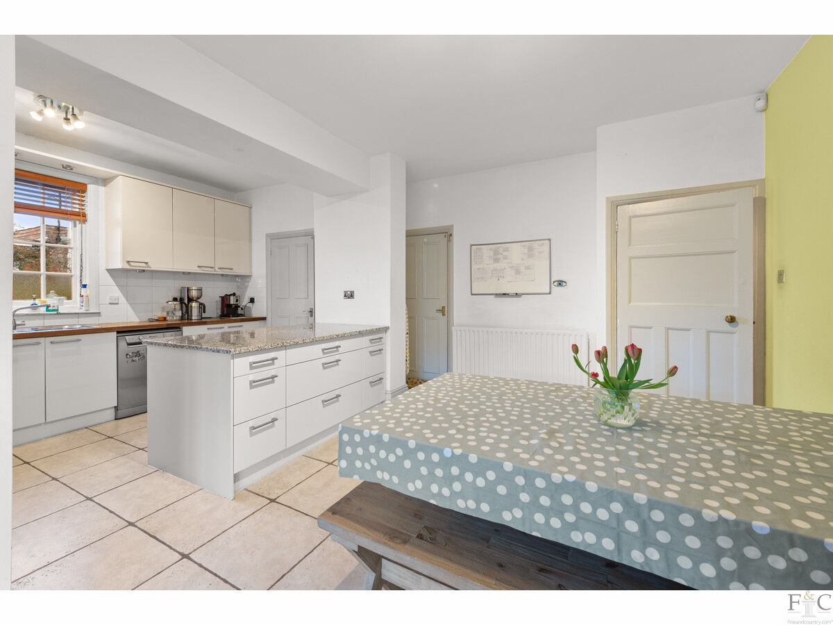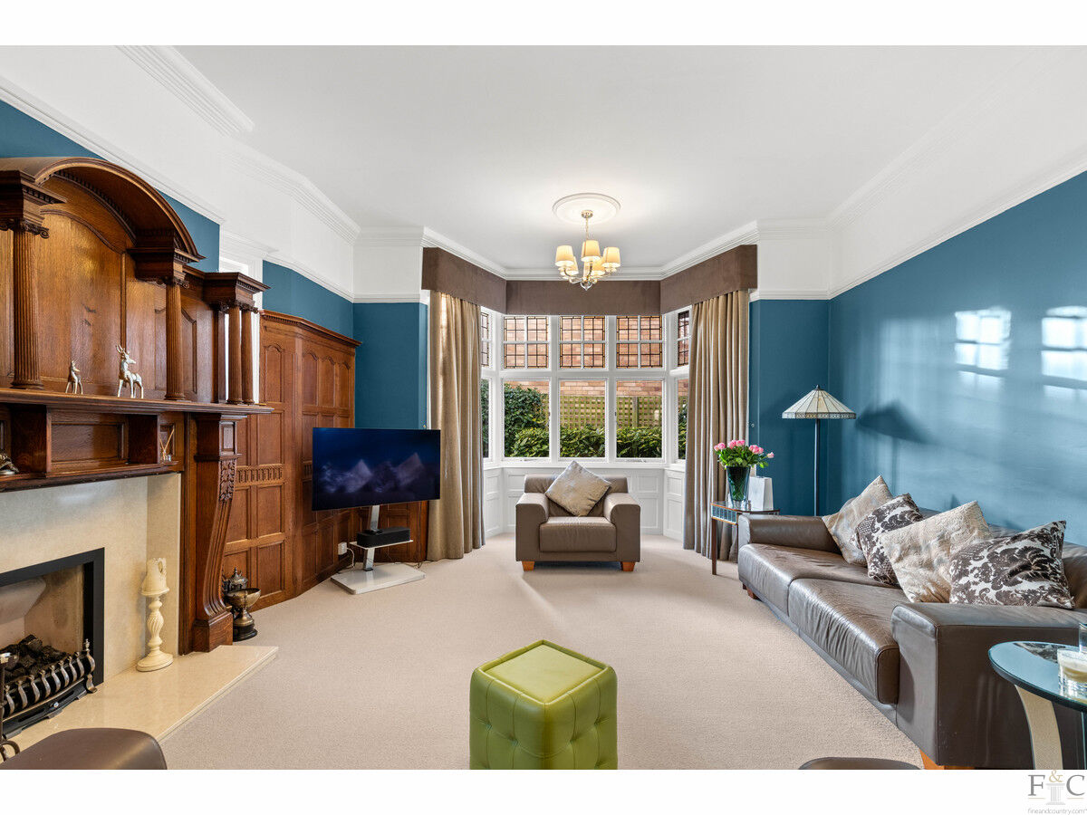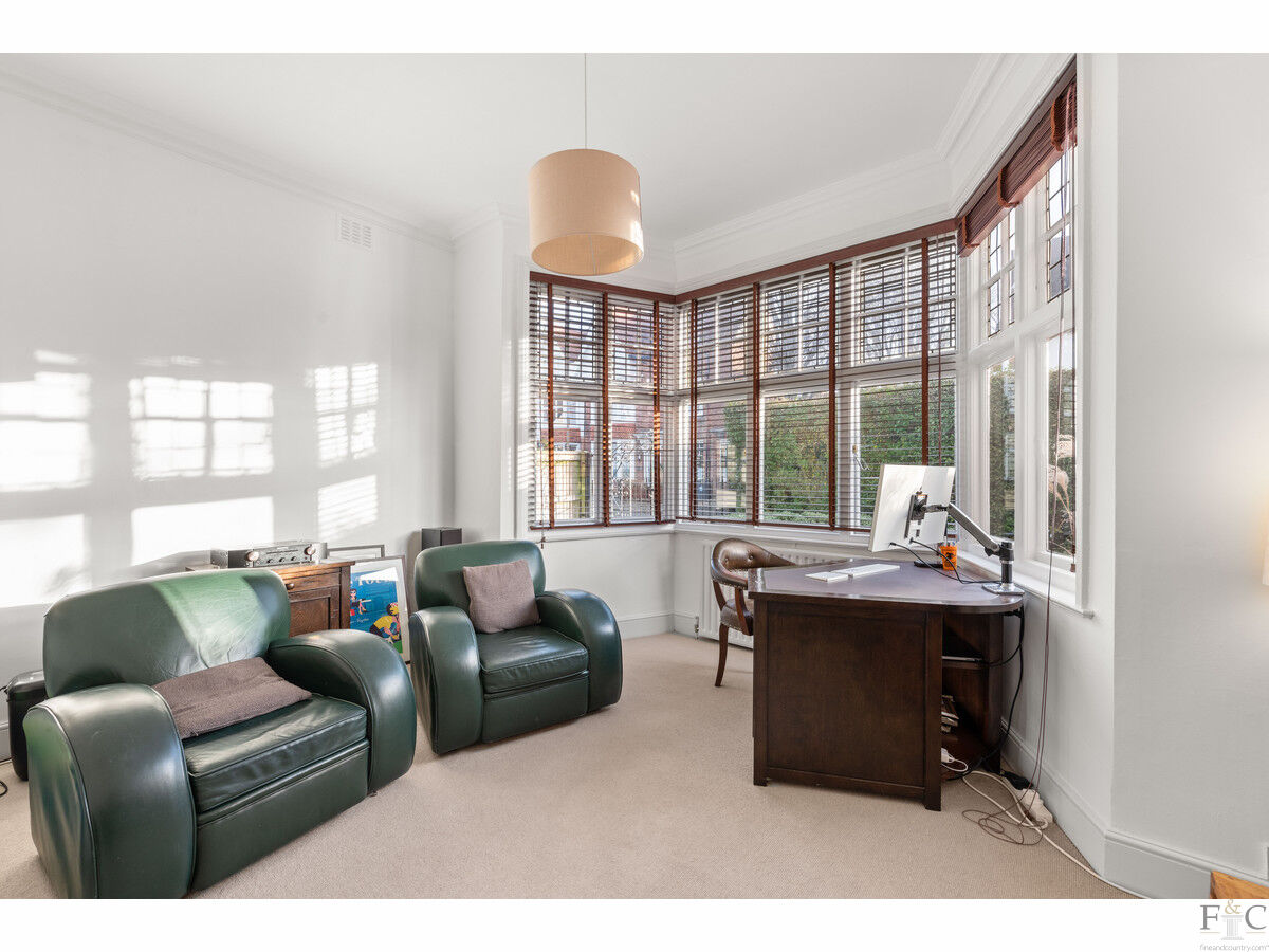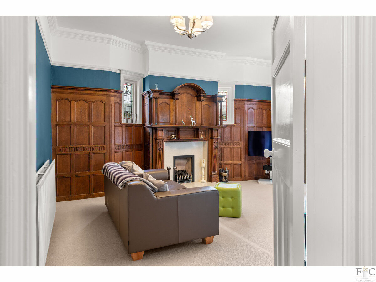 The distinguished aura of this residence is immediately evident upon entering the porch and proceeding to the entrance hall, where original features captivate with striking flooring, lofty ceilings, and stained glass windows, bathing the space in natural light. To the left, a resplendent study beckons, offering a peaceful retreat with its large bay window and views of the front garden, a sublime backdrop for productive endeavours.