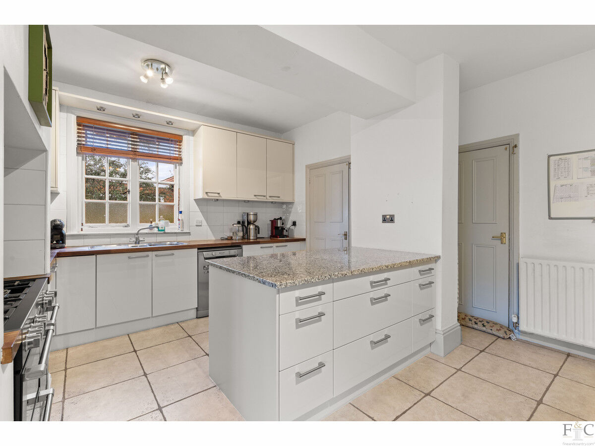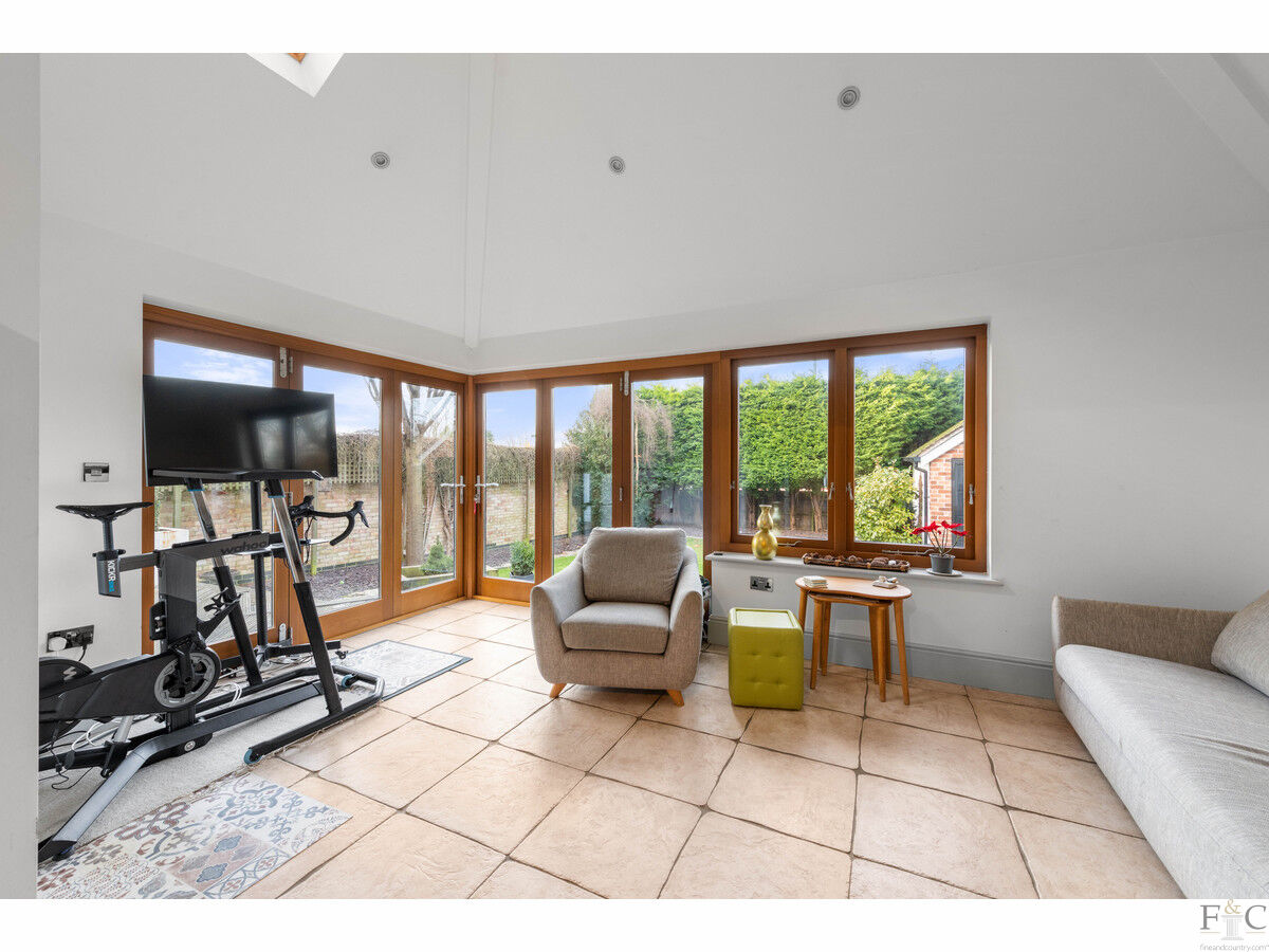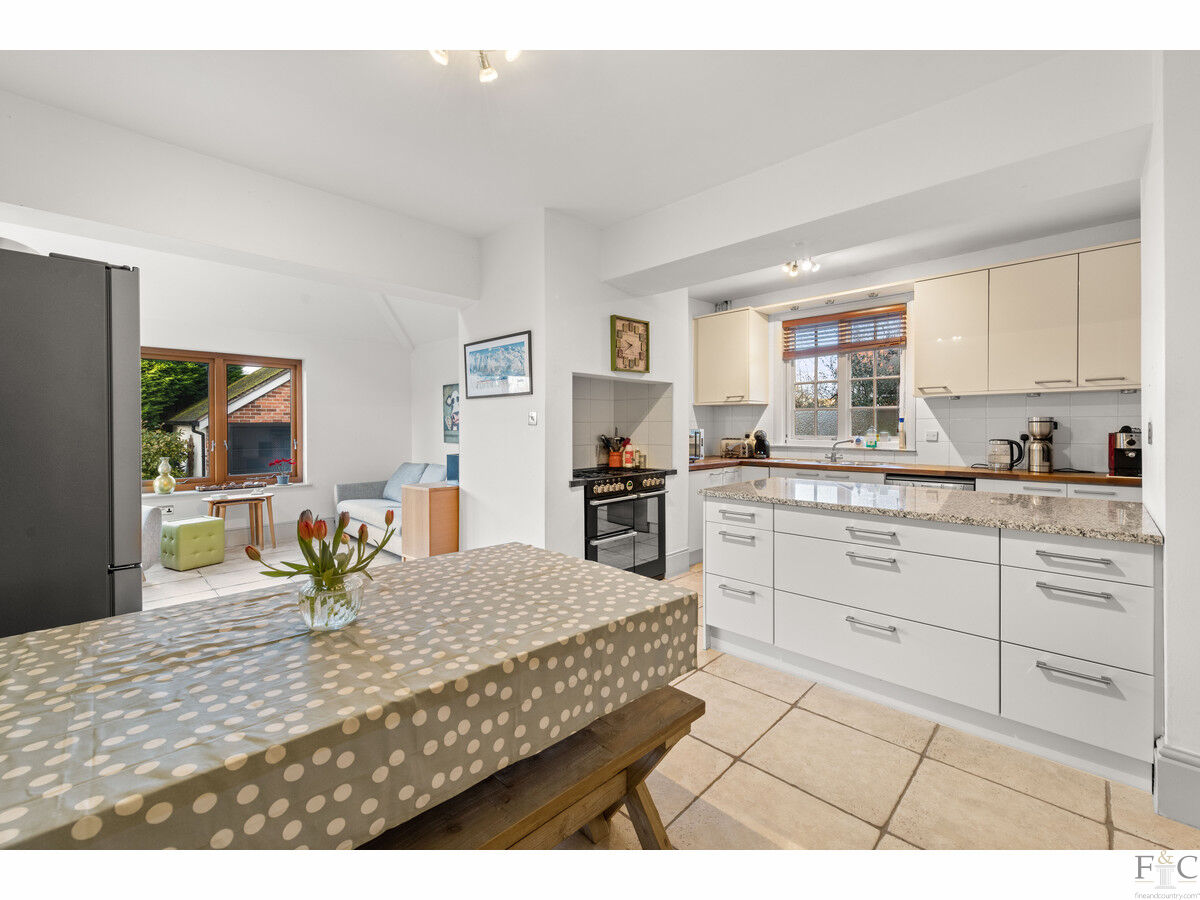 The heart of the home lies in the thoughtfully designed kitchen, seamlessly blending functionality with aesthetics. Renovated to perfection, this open-plan space boasts underfloor heating, floor-to-ceiling windows, and bifolding doors that effortlessly connect the interior with the delightful patio, an ideal setting for gatherings under the sun or stars. A utility room and a cloak area add practicality to this culinary space, while a pantry and cellar offer additional storage or conversion possibilities.