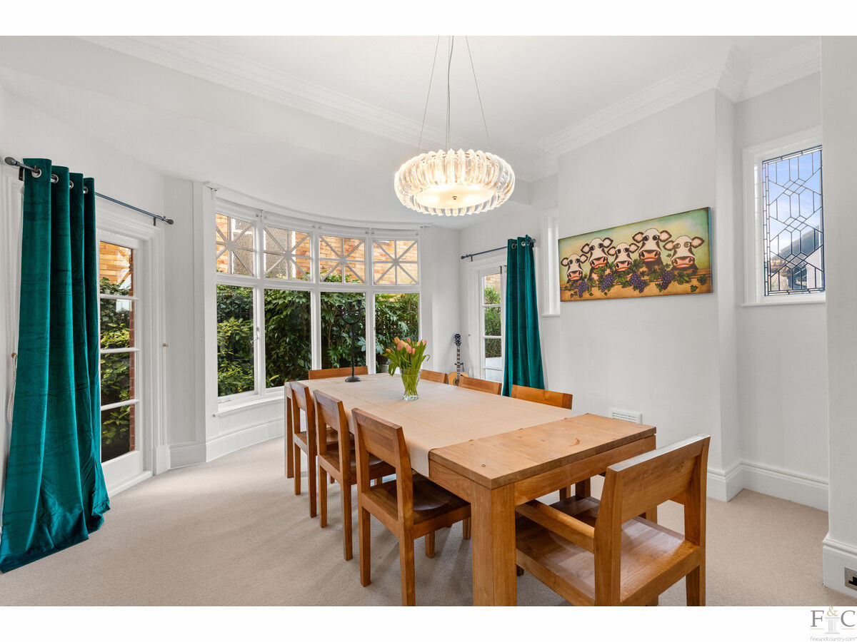 Continuing through the entrance hall, the formal lounge unfolds, an expansive room exuding timeless character with its original wooden fireplace, towering ceilings, and abundant space for tasteful furnishings. Adjacent to the lounge, a formal dining room invites al fresco moments with its bay window leading to the patio and vibrant garden.
