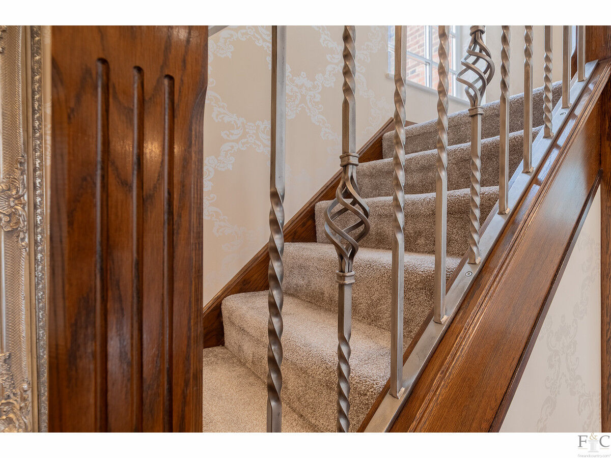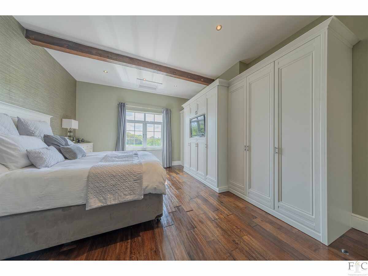 The first floor is both impressive and thoughtfully laid out. The principal suite is elegant and serene, offering garden views, space for seating, and access to a beautifully appointed ensuite. Two further bedrooms enjoy their own ensuite bathrooms, making them ideal for guests or older children, while the remaining two double bedrooms are served by a luxurious family bathroom, fitted with both a walk-in shower and freestanding bath.