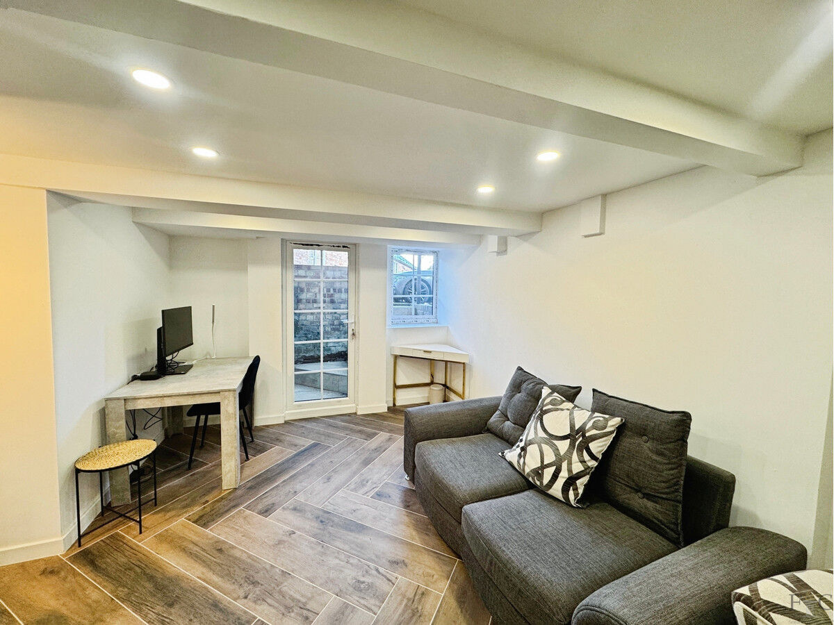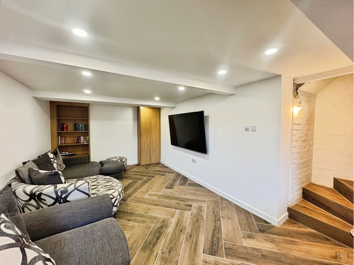 Discreetly accessed from the rear, the basement level is a beautifully finished, flexible space—ideal as a private cinema room, office, or quiet retreat.