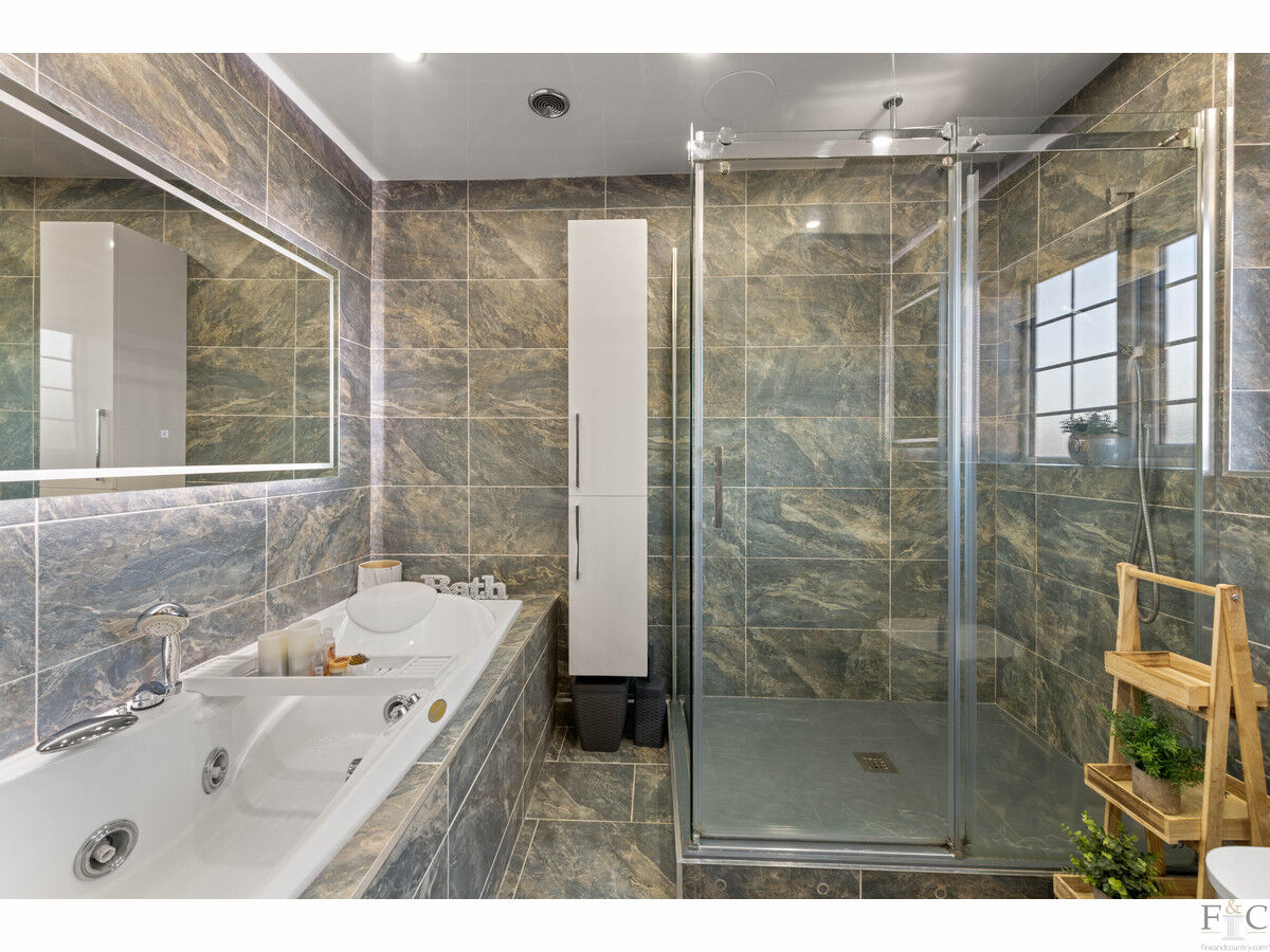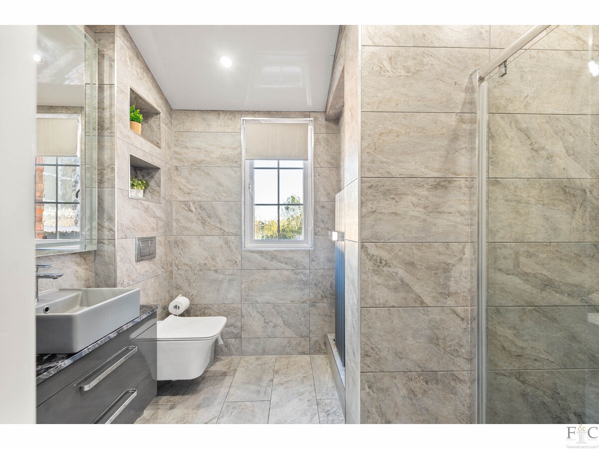 Rising to the first floor, the principal suite is a haven of indulgence, featuring a walk-in dressing area, garden views, and a luxurious en-suite with high-end fittings. Four further bedrooms are thoughtfully arranged across the floor—each radiating warmth and character, and three benefitting from charming garden or village views. A fifth bedroom enjoys its own en-suite, while the beautifully appointed family bathroom offers a jacuzzi bath, separate shower, and vanity fittings wrapped in stylish tiling.
