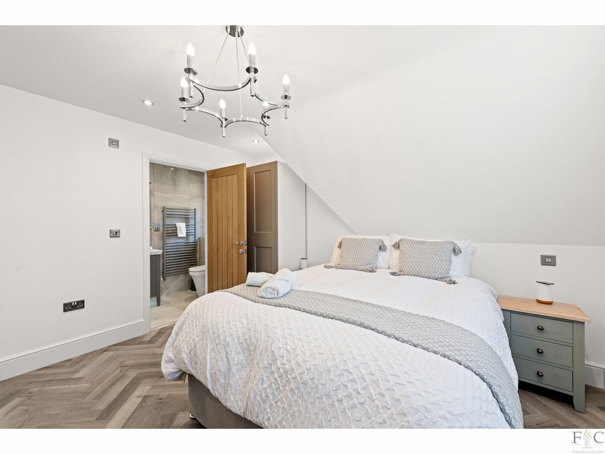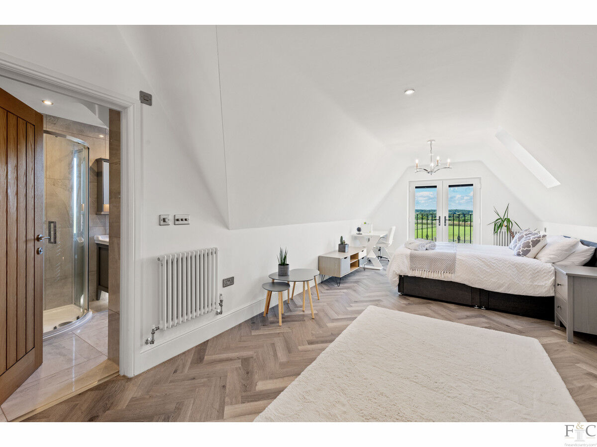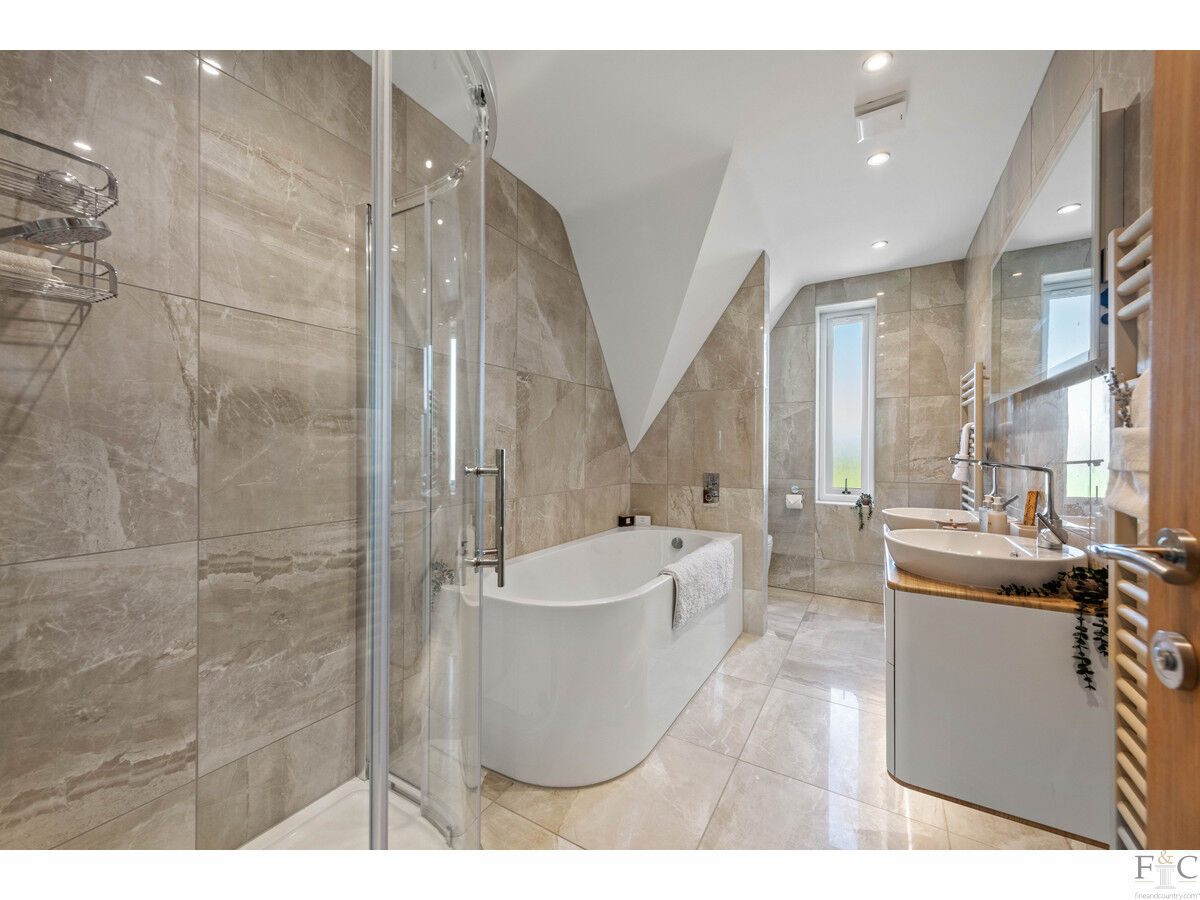 The first floor consists of a carpeted landing leading to the spacious primary suite of bedroom and ensuite, another four double bedrooms, two with ensuite bathing and finally, a large family bathroom. The spacious bedrooms have unique features dependent on size and shape. They all feature solid flooring and some have Velux windows in the elevated parts of the slanting walls and two of them, including the master room, have Juliette balconies overlooking the amazing views into the south facing garden and beyond. They are all tastefully decorated with coordinating fixtures and white painted walls.