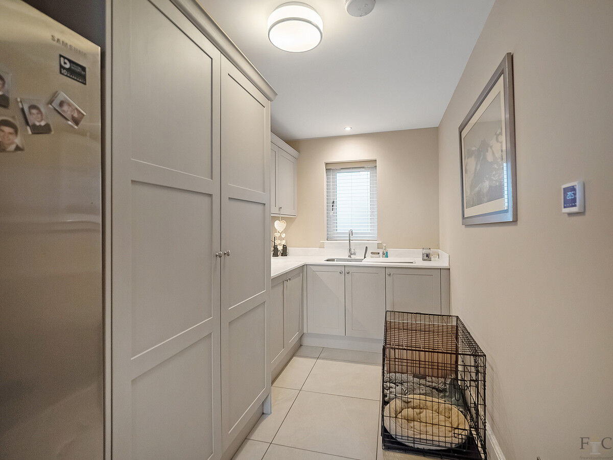 The natural materials and colours highlighted in the reception rooms continue here with light floor tiles, Purbeck Stone polished work surfaces and a mixture of Shaker style cabinetry, in contrasting white or blue to dramatic effect. Multiple wall and floor units provide ample, streamlined storage space. The central island feature and subtle lighting at floor, wall and ceiling level make this kitchen totally practical yet immediately striking. The integrated appliances bought in 2021 and included in the sale are an induction hob, double oven, microwave, Sonos speakers, mobile phone charger and dish washer. The remaining appliances could be negotiated for and include the washing machine, tumble dryer, fridge freezer and wine cooler. The pantry room immediately next door, provides additional storage, another sink, and plumbing for laundry appliances. There is also a door from the pantry leading to an entry into the rear garden and another allowing internal access to the garage.