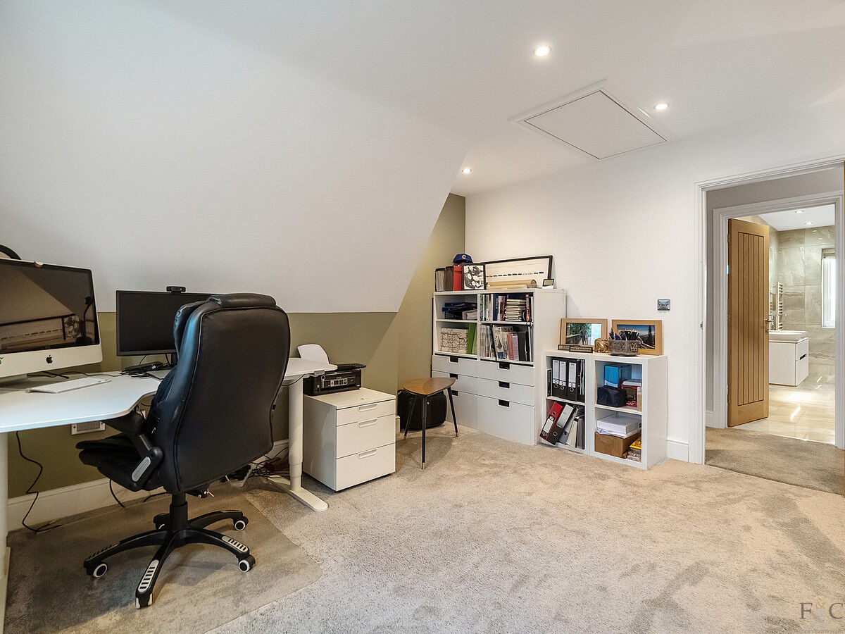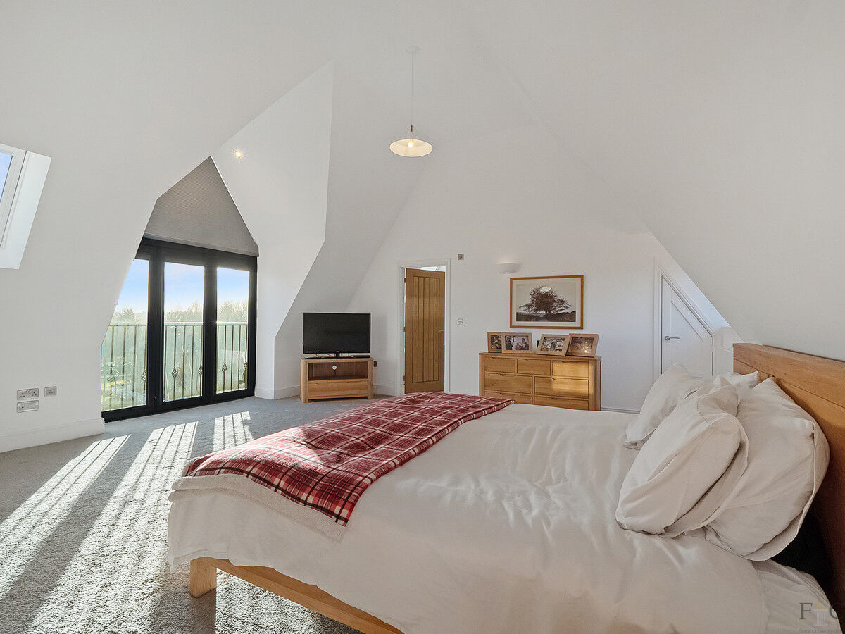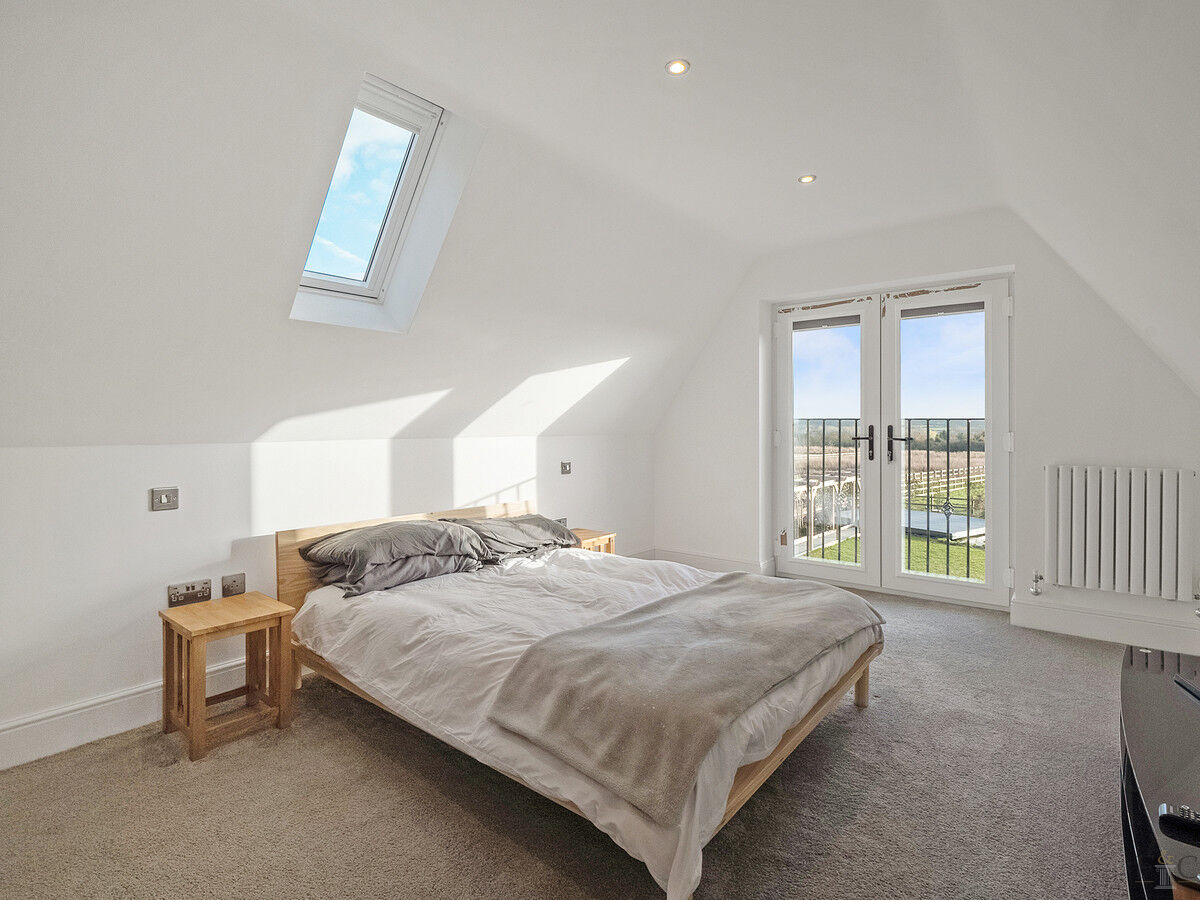 The first floor consists of the spacious primary suite of bedroom and ensuite, another four double bedrooms, two with ensuite bathing and finally, a large family bathroom. The spacious bedrooms have unique features dependent on size and shape. Some have Velux windows in the elevated parts of the slanting walls and two of them, including the master room, have Juliette balconies overlooking the amazing views into the south facing garden and beyond. They are all tastefully decorated with coordinating carpets and single feature walls of blocked painted colour.