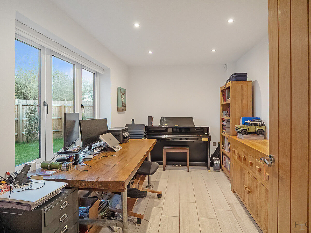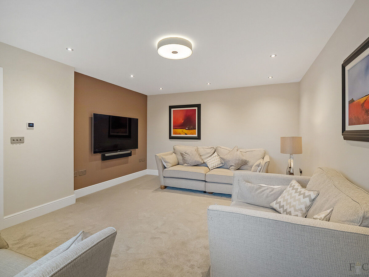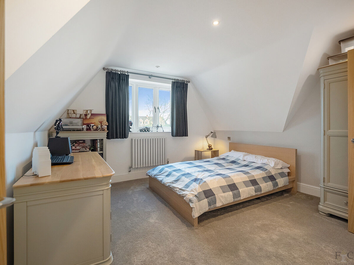 The first floor consists of the spacious primary suite of bedroom and ensuite, another four double bedrooms, two with ensuite bathing and finally, a large family bathroom. The spacious bedrooms have unique features dependent on size and shape. Some have Velux windows in the elevated parts of the slanting walls and two of them, including the master room, have Juliette balconies overlooking the amazing views into the south facing garden and beyond. They are all tastefully decorated with coordinating carpets and single feature walls of blocked painted colour.