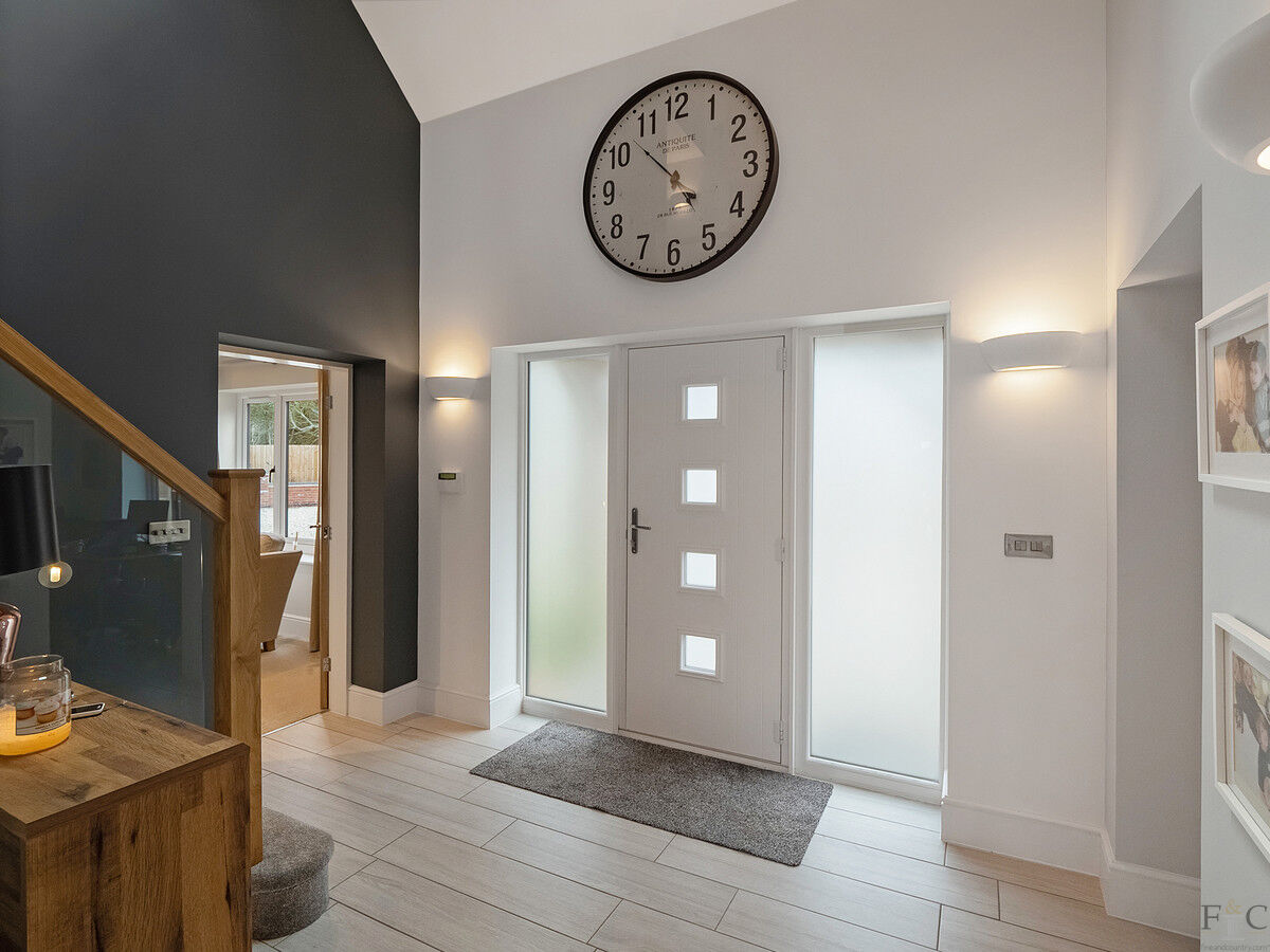 The Paddocks is approached from a private shared drive on Station Road and is entered through secure, remotely controlled electric gates that open onto a large expanse of shingled drive, stretching across the front and to the side of the house. A newly planted selection of trees will increasingly provide privacy, interest and an attractive barrier from the road. At the furthest point of the house there is a double garage, with oodles of space for several vehicles and turning on the drive. A brick wall, two grassed areas and a paved path leading to the covered porch and front door of the property, are immediately at the front, with fences at either side of the house preserving privacy to the gardens and grounds at the rear.