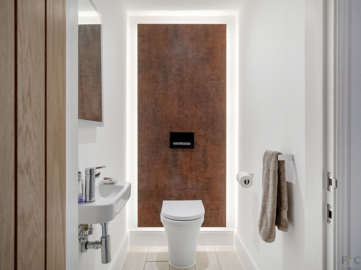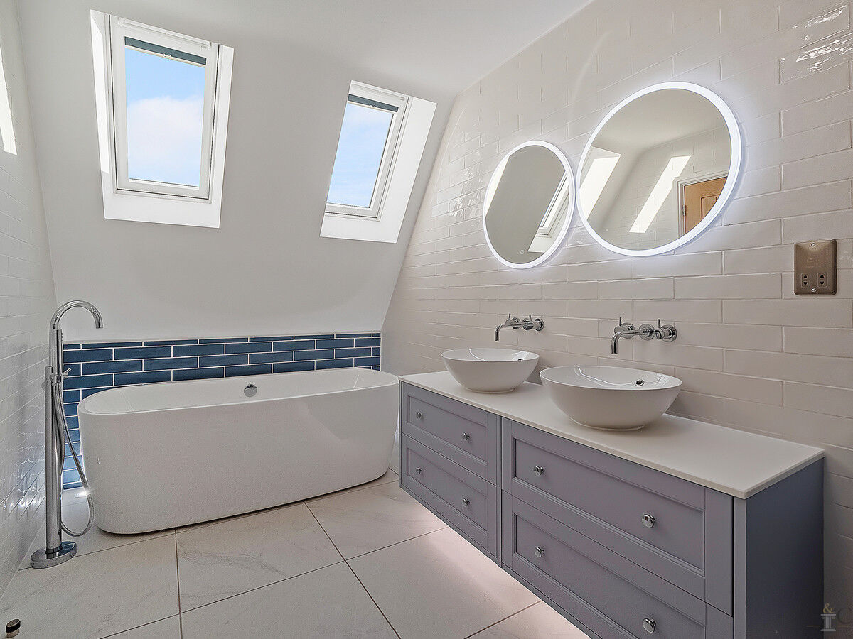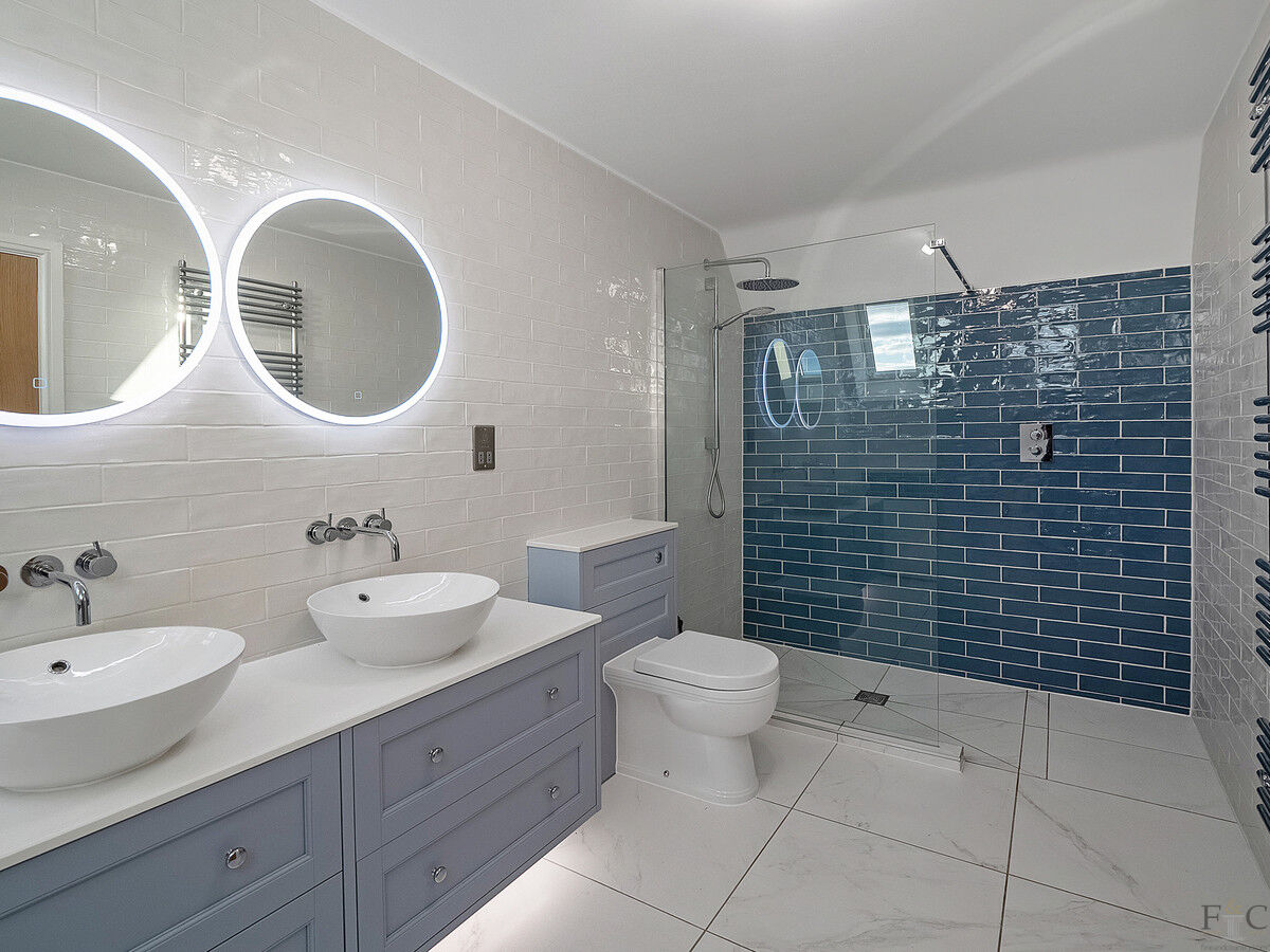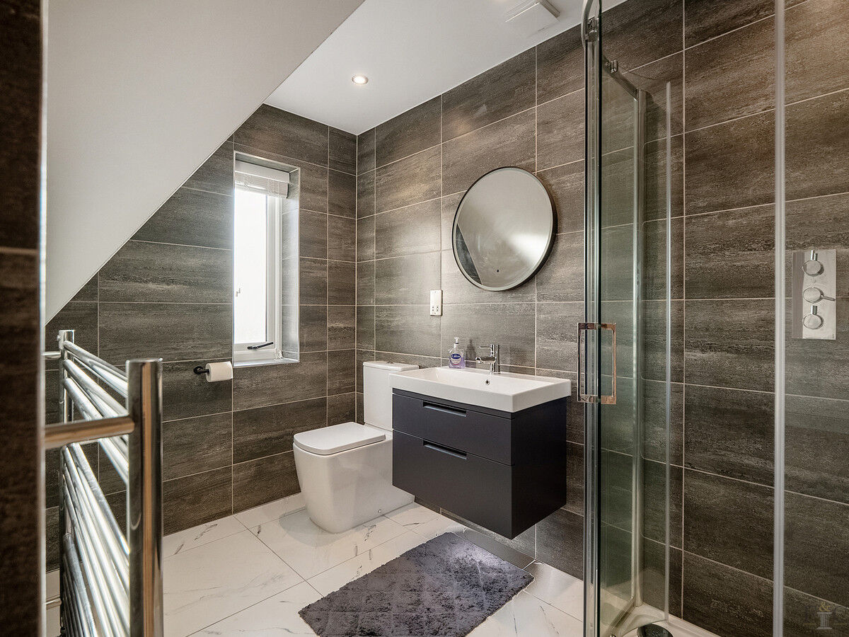 All fixtures and fittings in all the bathing areas of the house have been tastefully selected for their contemporary design and fitted to high specifications. They all impress with the continuing theme of neutrality and stunning attention to detail. The family bathroom is fitted with a double vanity unit with separate shower and bath. There are heated towel rails, illuminated mirrors and automatic lighting in all the bathing rooms.. Each ensuite has a walk in shower similarly fitted with quality sanitary ware to the highest specification. These rooms have been decorated with distinctive tiling on the floor and walls. The primary suite has an ensuite that includes a double vanity unit, walk in shower and separate shower facility to the side of the bath.