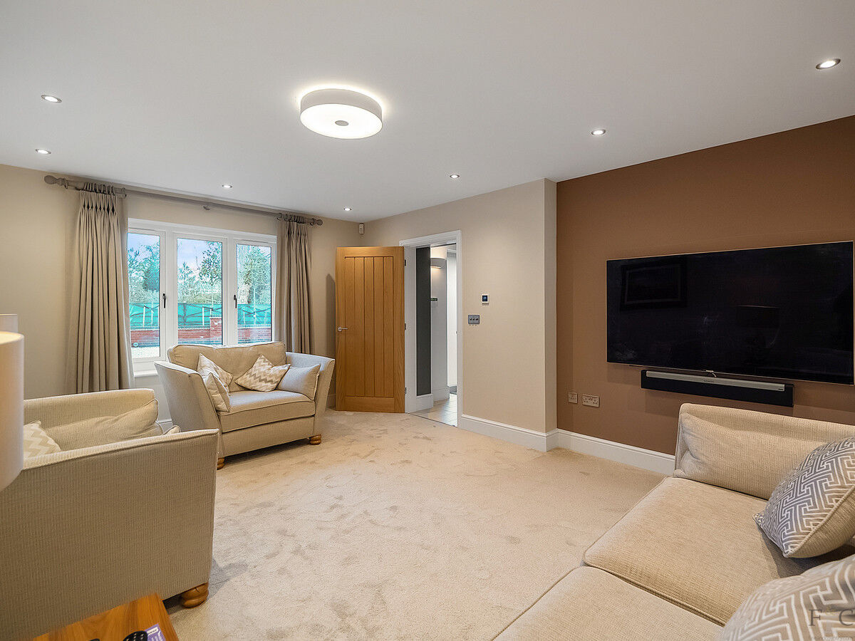 The Paddocks has been fitted with underfloor heating and benefits from lighting that can be altered to suit the mood and occasion. The living room is one of several entertaining areas and is generously proportioned to easily hold several large sofas and other pieces of furniture. It has a window overlooking the front drive and is carpeted. Across the hall the home office has been fitted out to suit its purpose with hard flooring and space for storage and technical equipment. It is also facing the front of the property and is next door to the family room.
