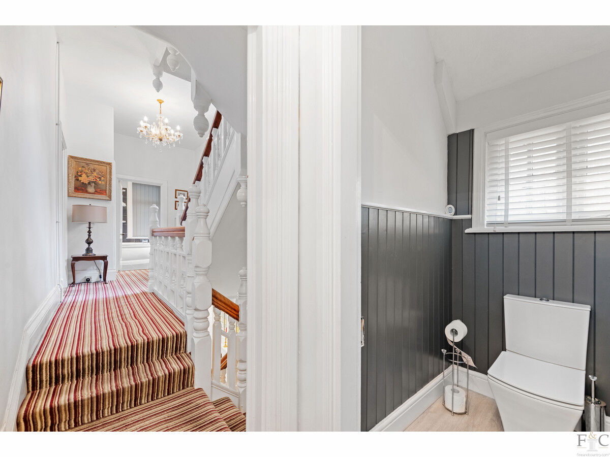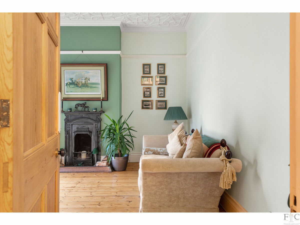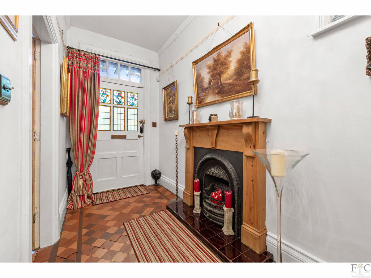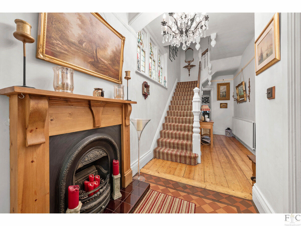 As you step through the original wooden front door, the entrance hall beckons with original Minton tiled flooring, a feature wood fireplace, and ceiling coving, providing a glimpse into the grandeur within. The dining room exudes elegance with its original sash bay window, ceiling coving, and a striking cast iron fireplace, while the sitting room, adorned with twin wooden doors, opens to the garden, revealing an original decorative ceiling and cast iron fireplace.