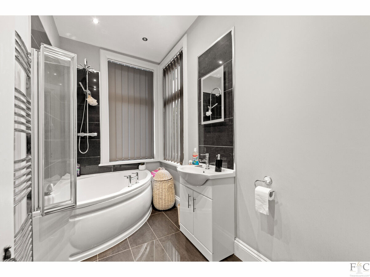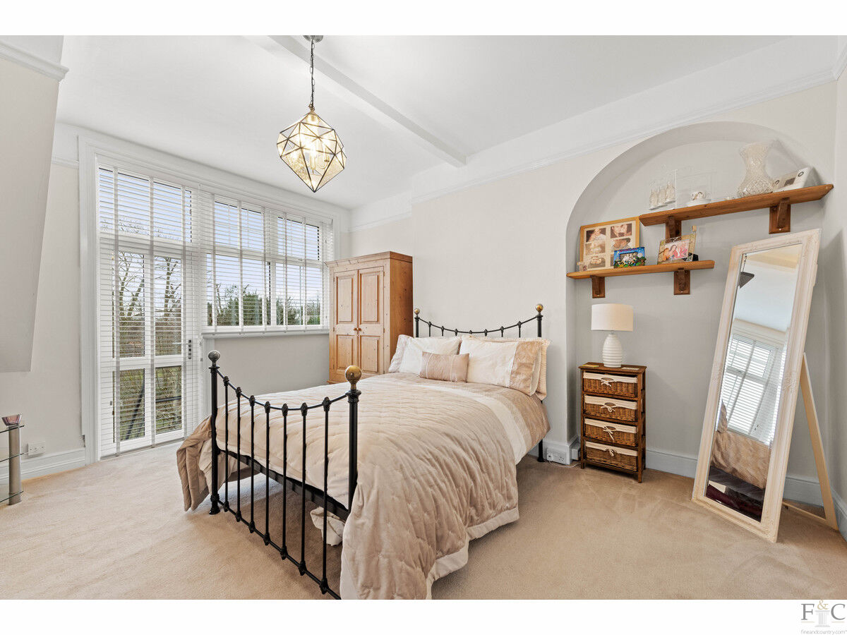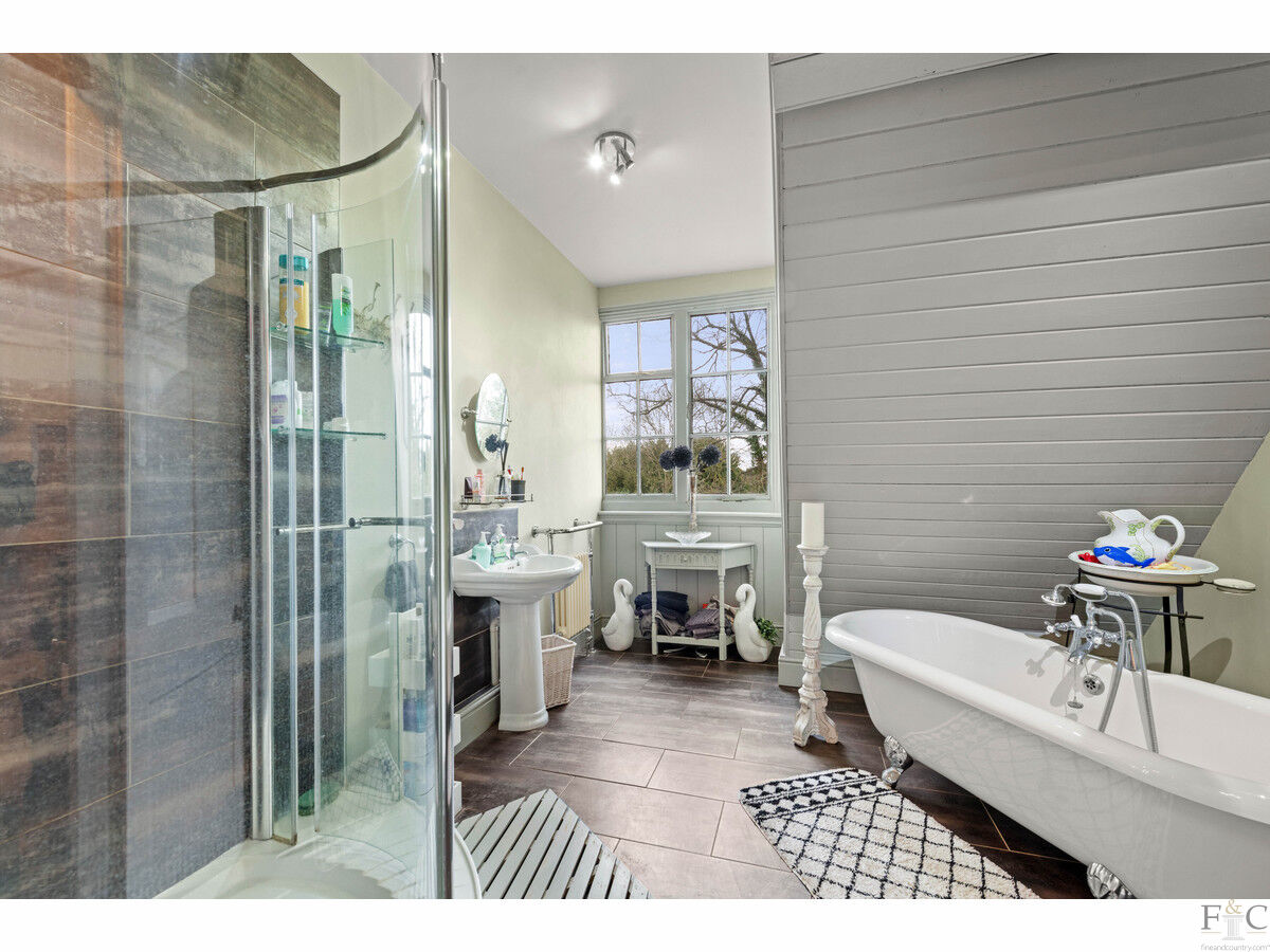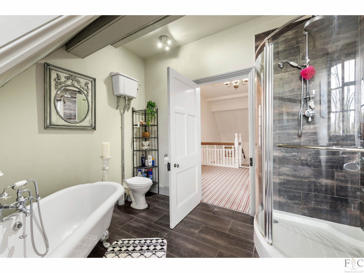 The first floor unveils a split-level landing leading to the master bedroom, bedroom two, and a luxurious bathroom with a corner bath. Bedroom three and a separate WC complete this level. The second floor offers two more bedrooms, each with distinctive features, and a stunning bathroom with a double corner shower enclosure and a freestanding ball and claw foot bath.