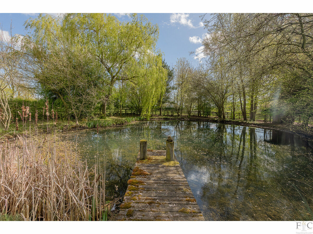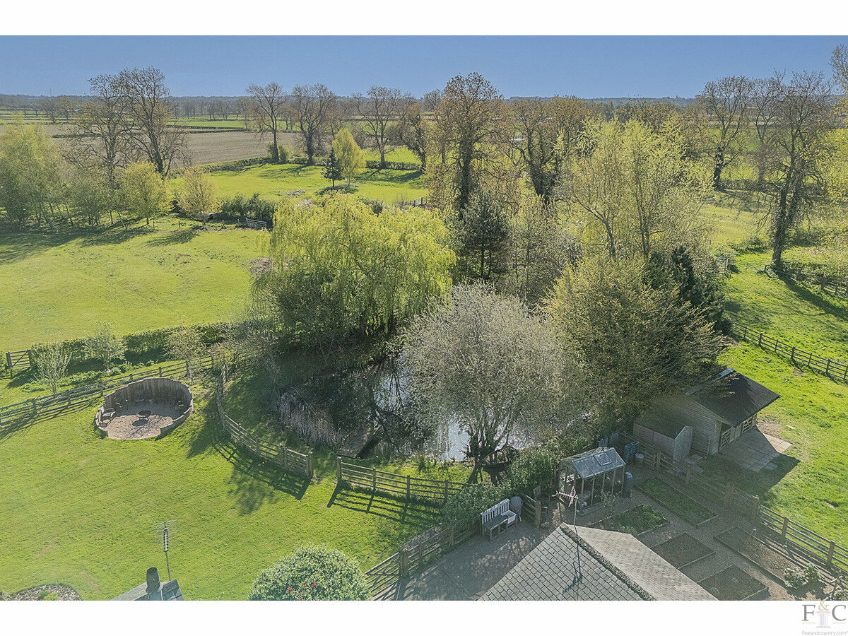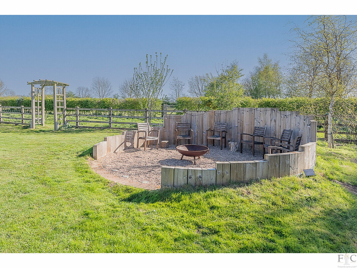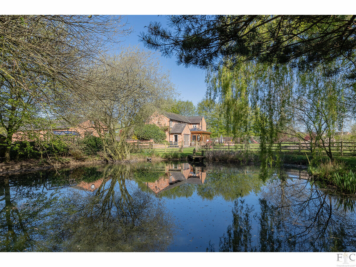 The rear garden has been landscaped to include a terrace, lawned area with shrubs and trees, pond being stream fed with pontoon. A lovely feature is a circular seating area with fire pit.