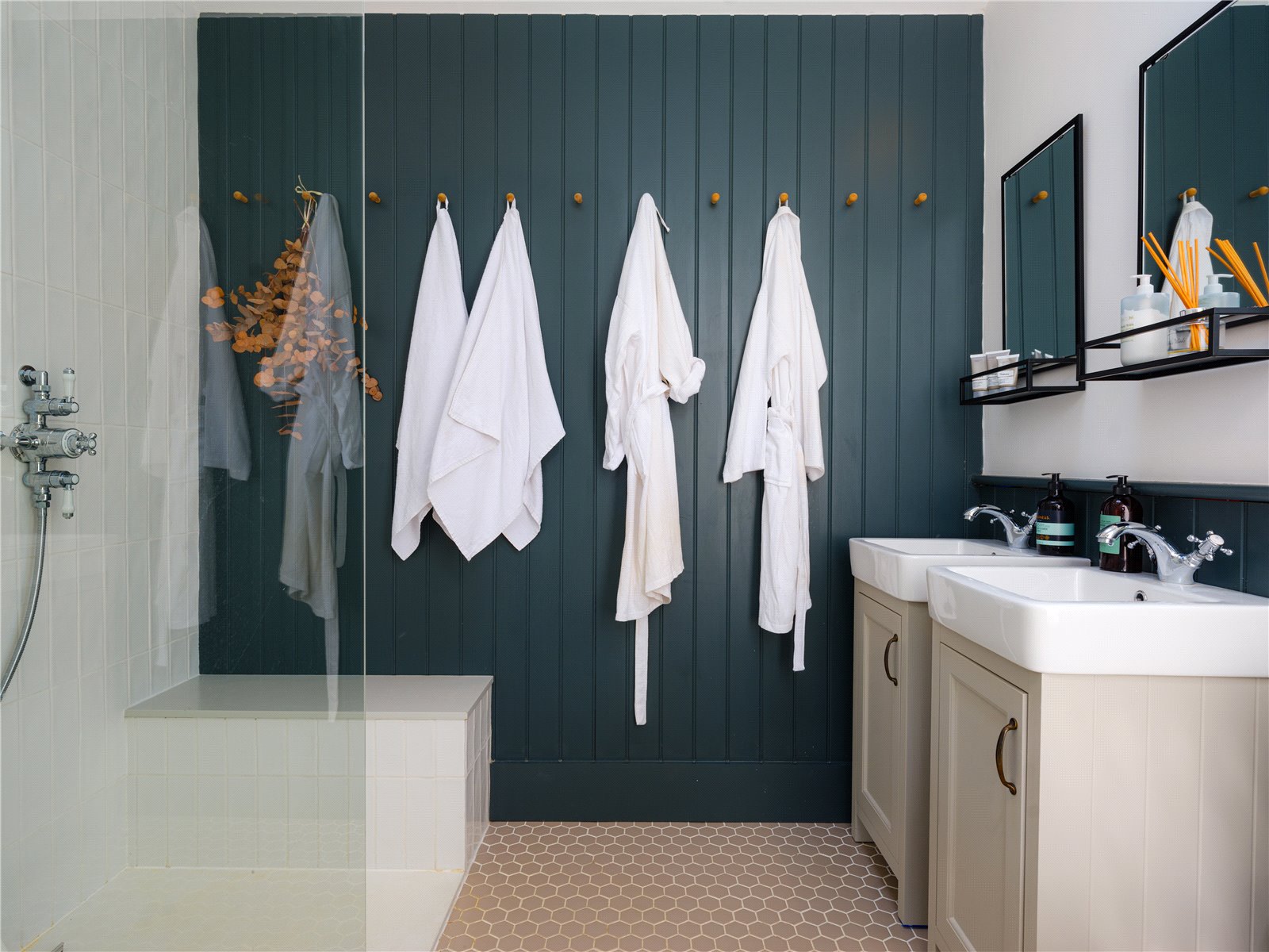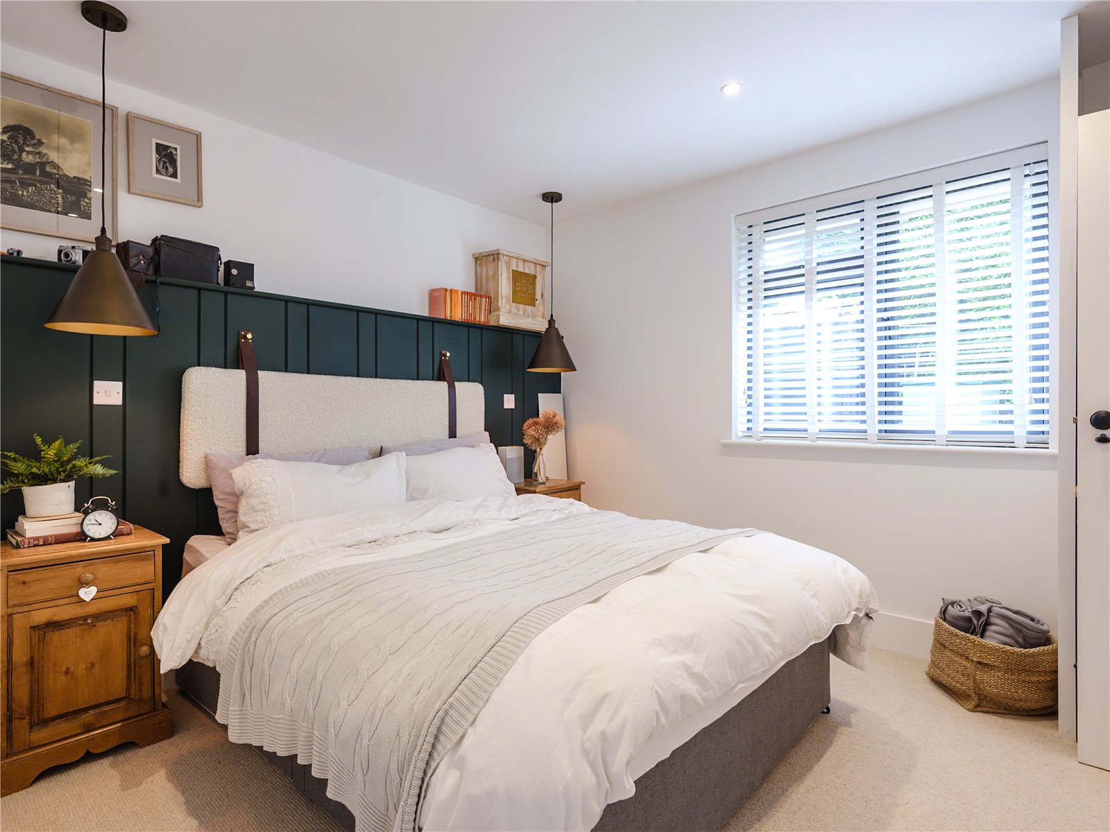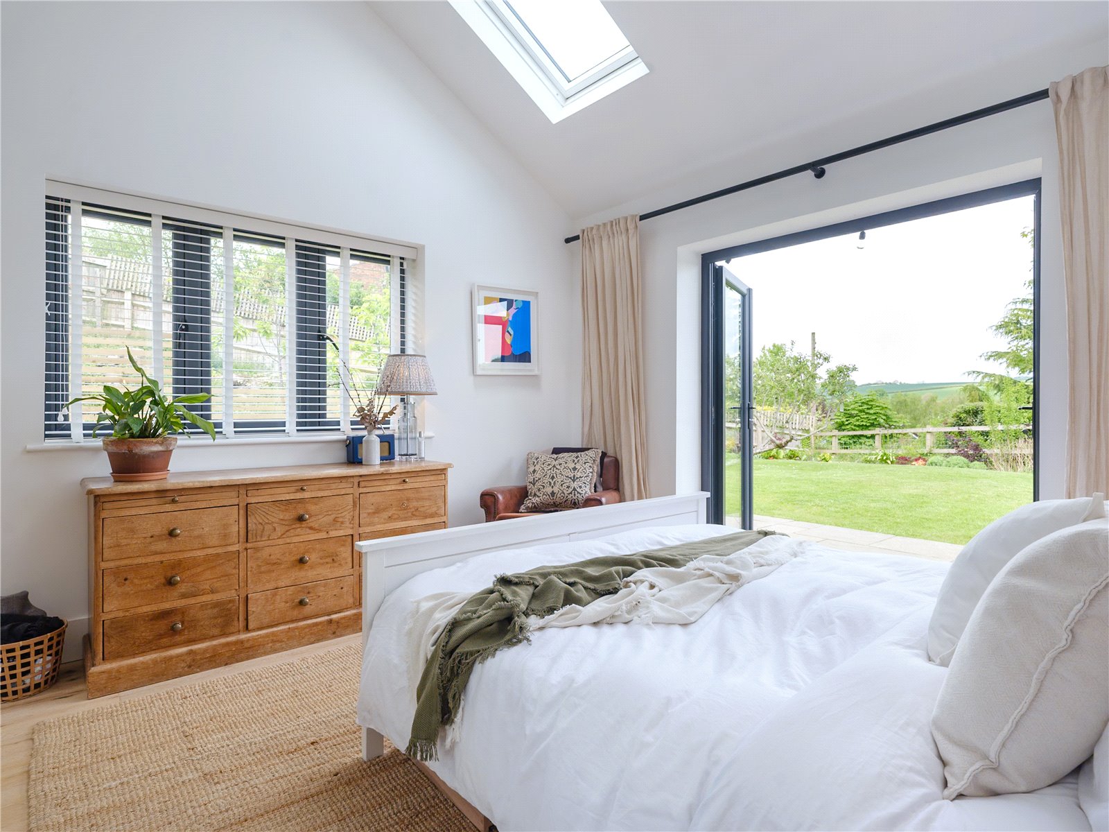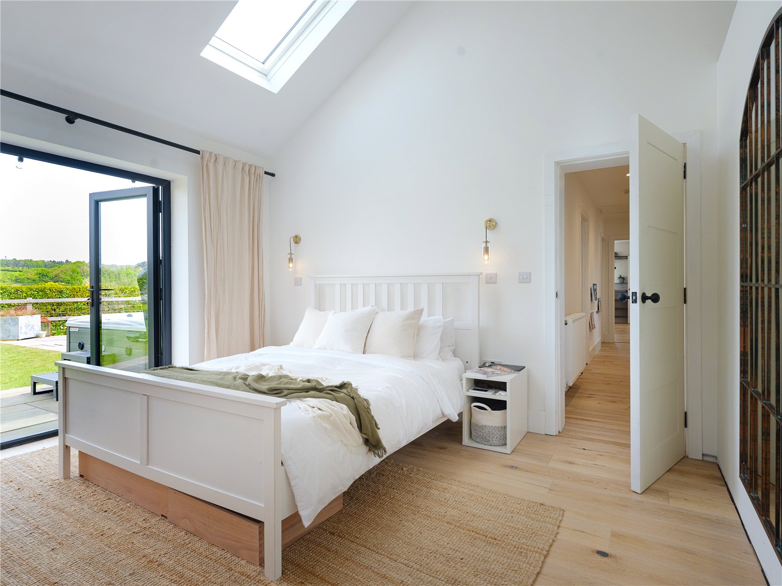 The main bedroom, with a chic ensuite and walk in wardrobe, is flooded with natural light thanks to both skylight windows in the vaulted ceiling and french doors, which lead onto the terrace and garden. The second double bedroom is equally stylish in its presentation and benefits from an ensuite shower room. The two further bedrooms are served by the boutique hotel style main bathroom and match the luxurious feel of the rest of the property.