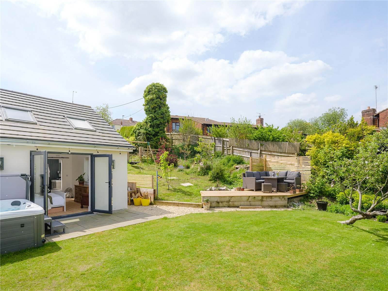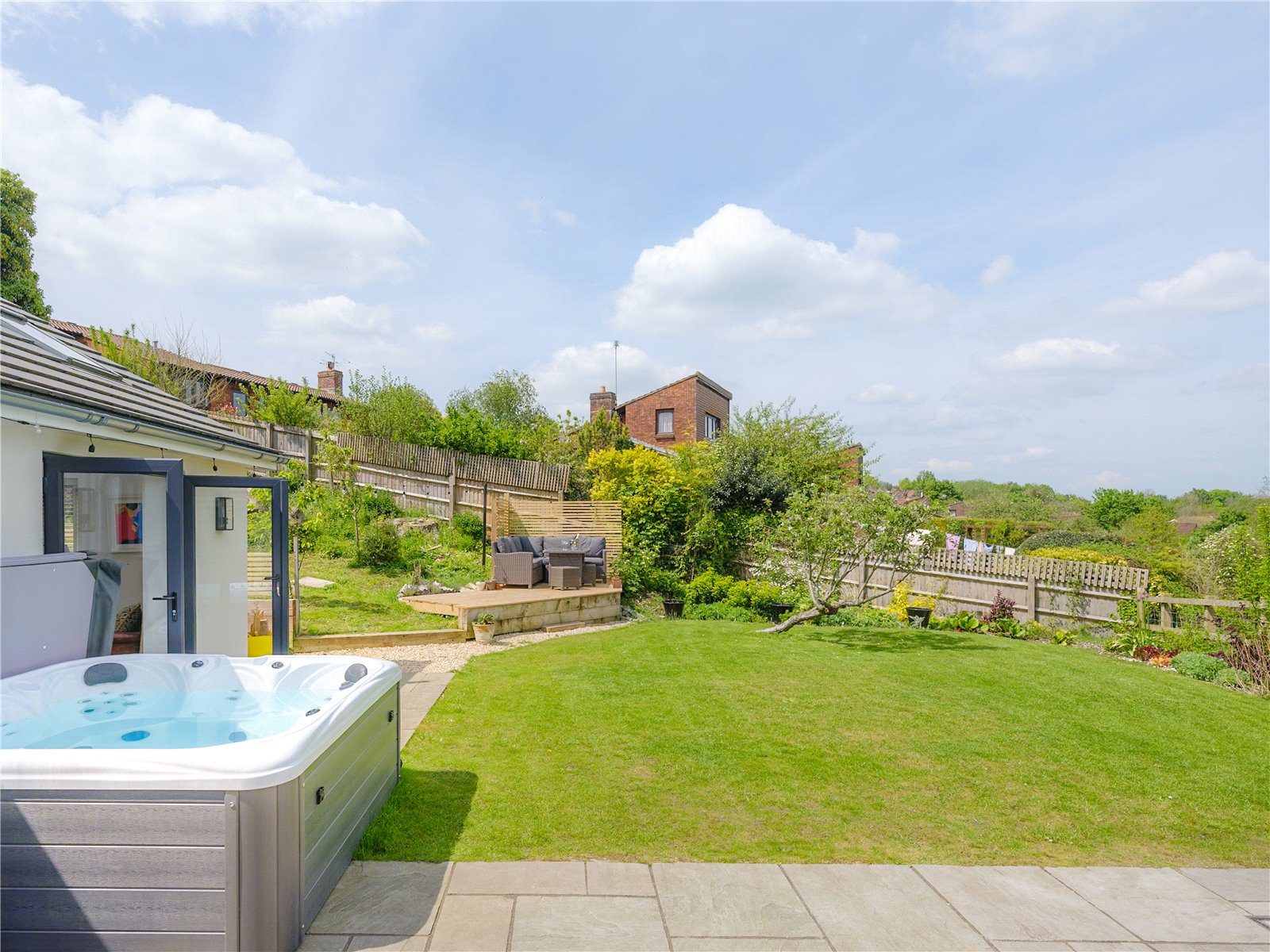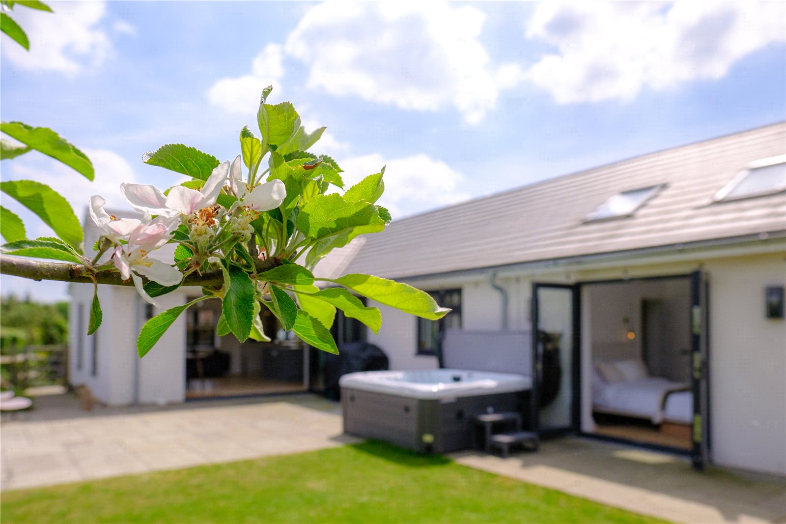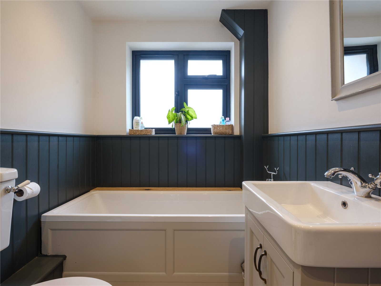 The main bedroom, with a chic ensuite and walk in wardrobe, is flooded with natural light thanks to both skylight windows in the vaulted ceiling and french doors, which lead onto the terrace and garden. The second double bedroom is equally stylish in its presentation and benefits from an ensuite shower room. The two further bedrooms are served by the boutique hotel style main bathroom and match the luxurious feel of the rest of the property.
