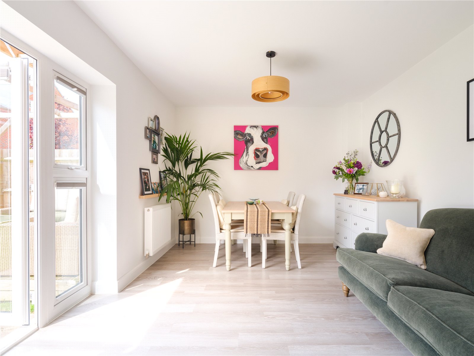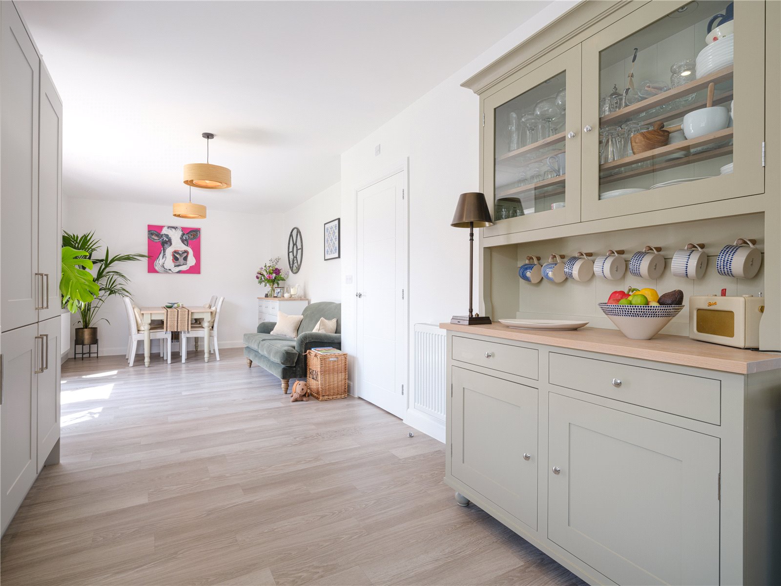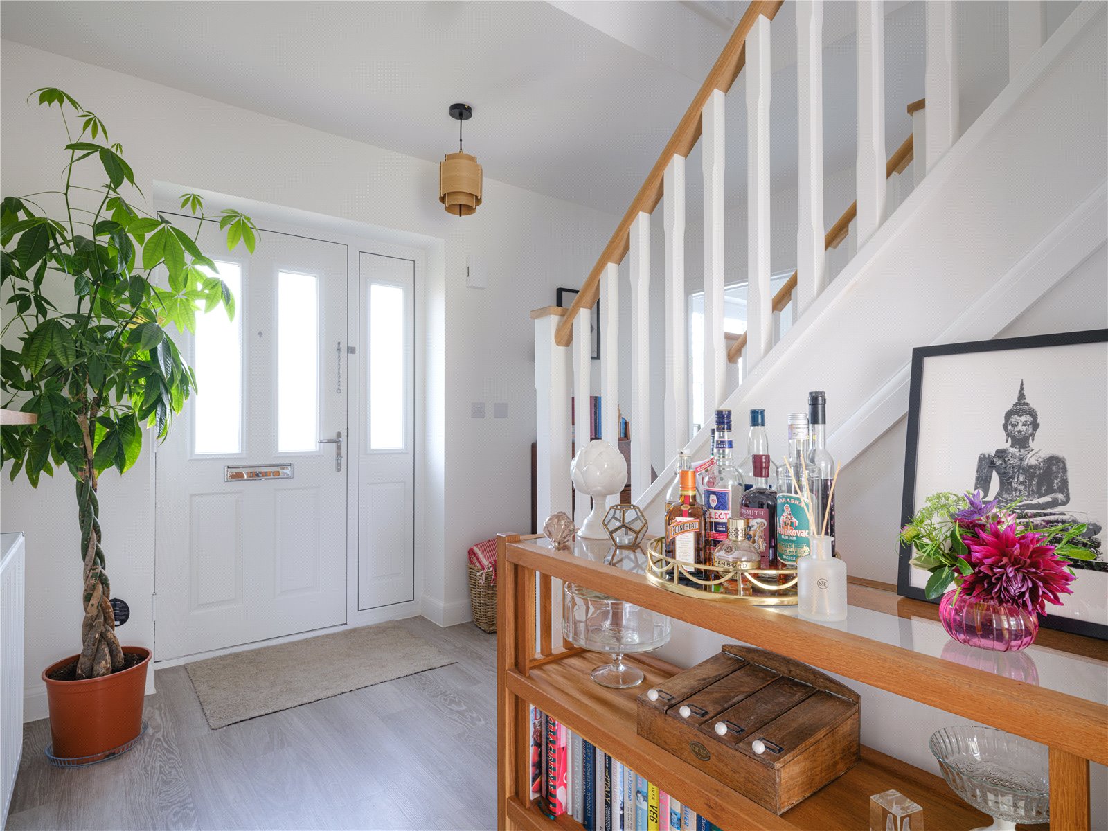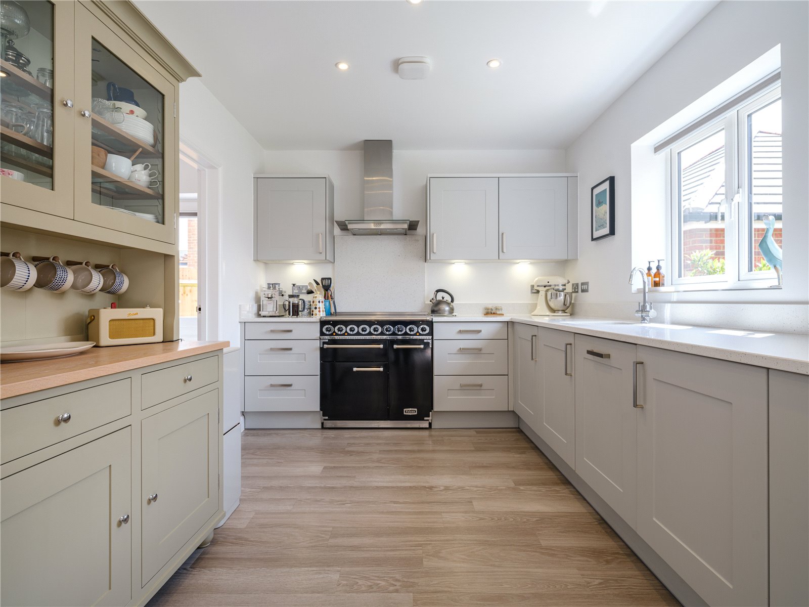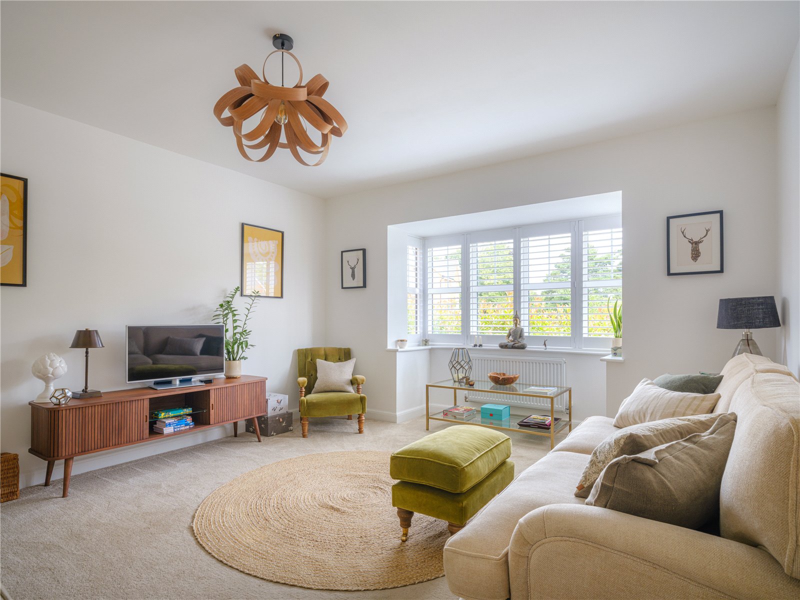 The open and spacious light-filled entrance hall welcomes you into the property, with this light and airy ambiance continuing throughout this lovely home. Off the hallway you have a study and downstairs WC. Leading on to a generous sized sitting room with a delightful view through the large bay window onto the green in front. The property is finished to a high specification throughout, with wooden shutter blinds through the entirety of the house.