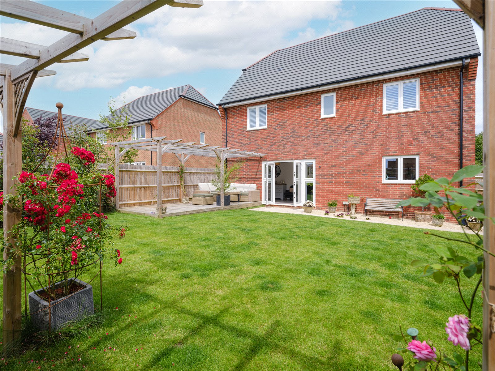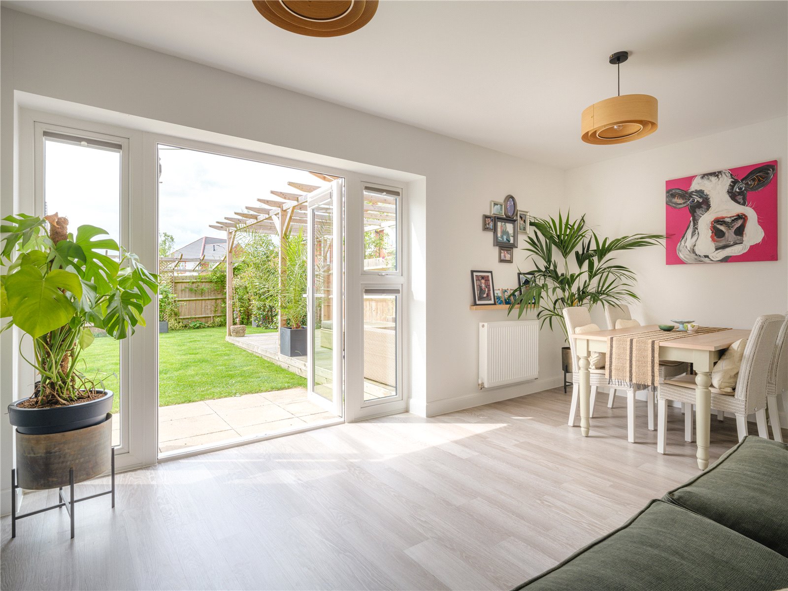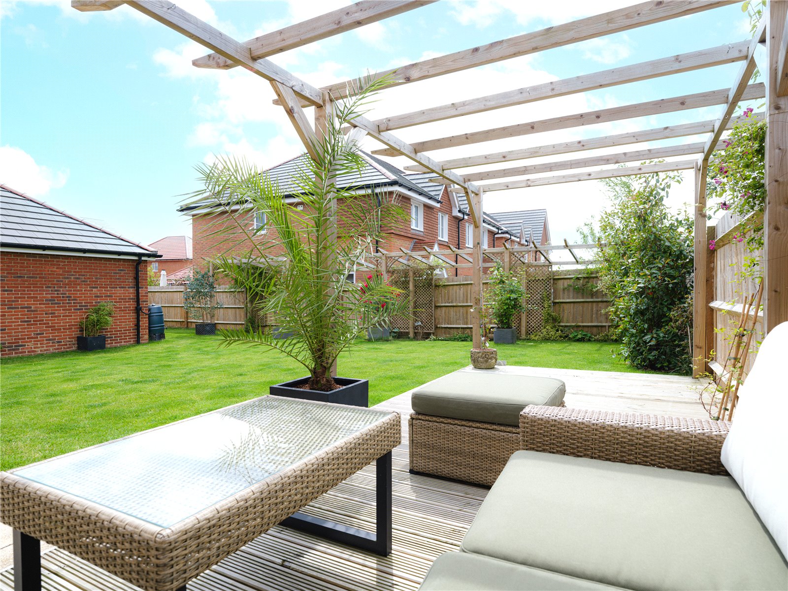 French doors from the Kitchen/Diner open out onto the sunny south facing garden to the decked seating area, where you can enjoy views of the well presented garden and budding pergola walk-way with various beautiful climbing plants, roses and shrubbery. The garden also benefits from a side access gate.