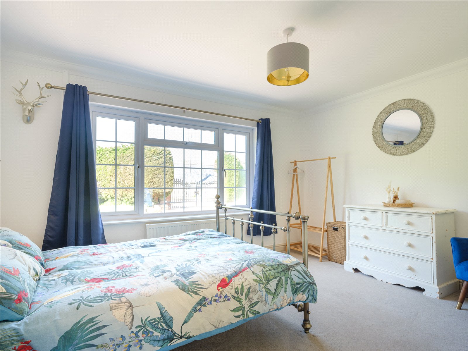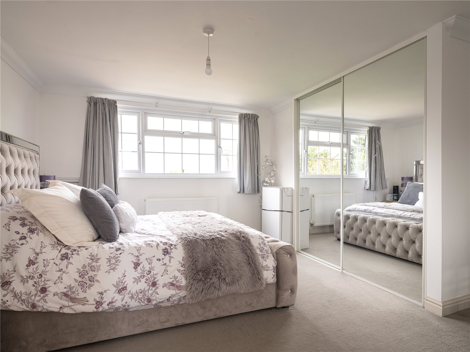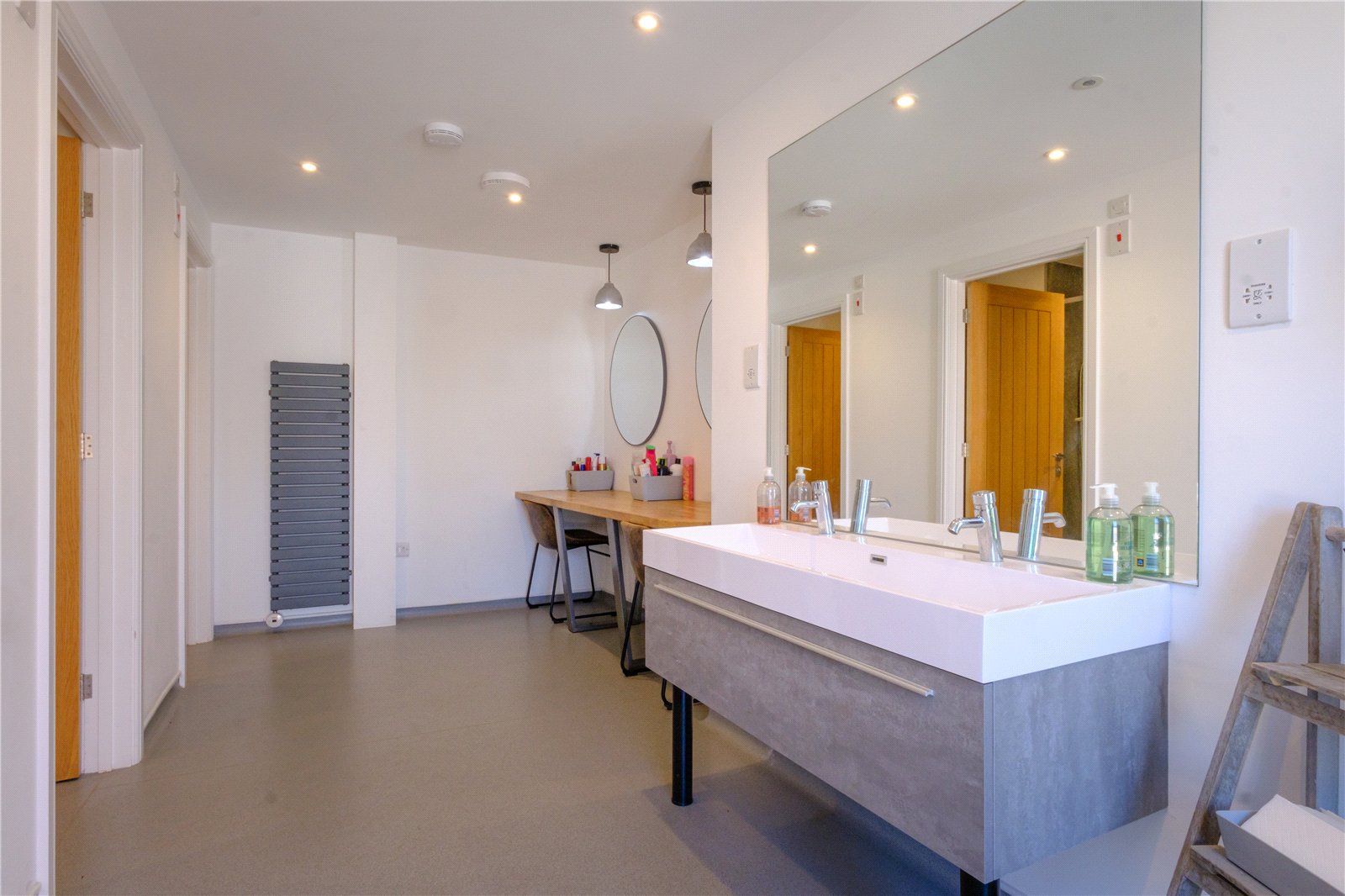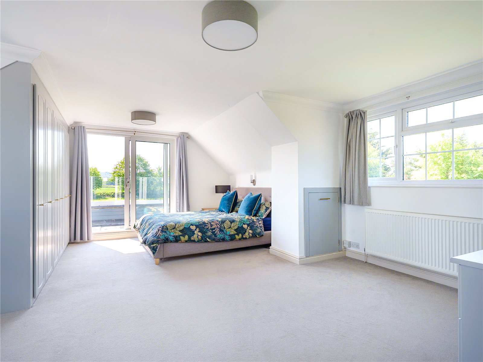 Located on the first floor are the master and principal guest bedrooms. The guest bedroom is a spacious double room with fitted wardrobes and space to add an ensuite bathroom if required. The impressive master bedroom has an ensuite shower room, multiple built-in wardrobes and sliding doors which allow access onto the wrap-around balcony where you can enjoy the beautiful, uninterrupted views over the private grounds and surrounding rolling countryside towards the Ridgeway.