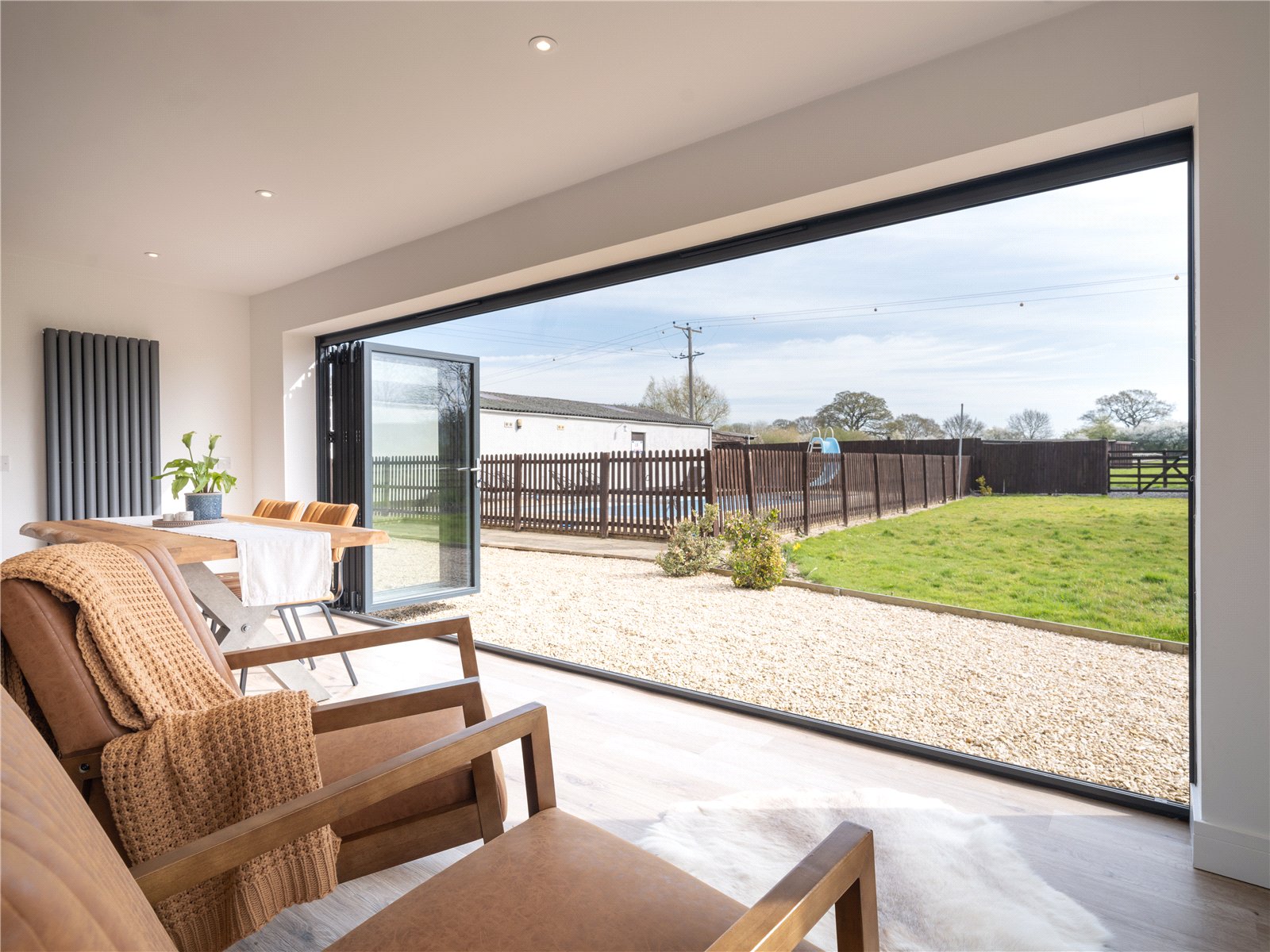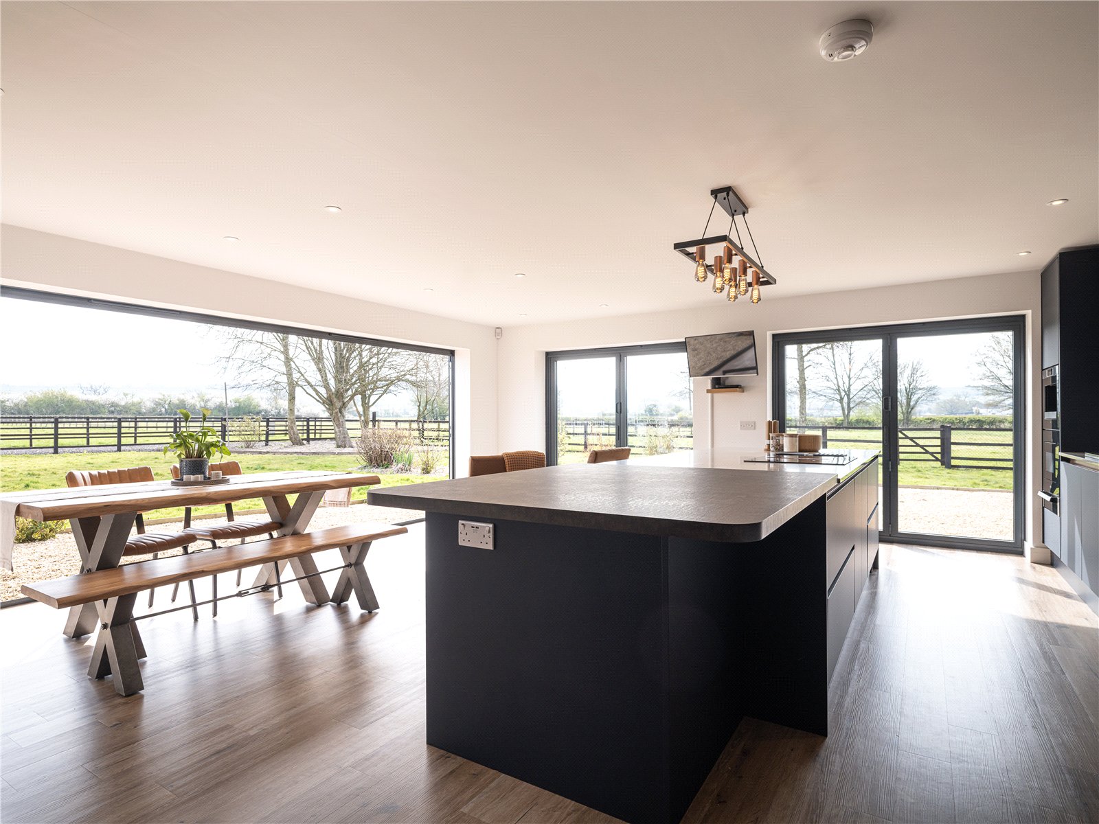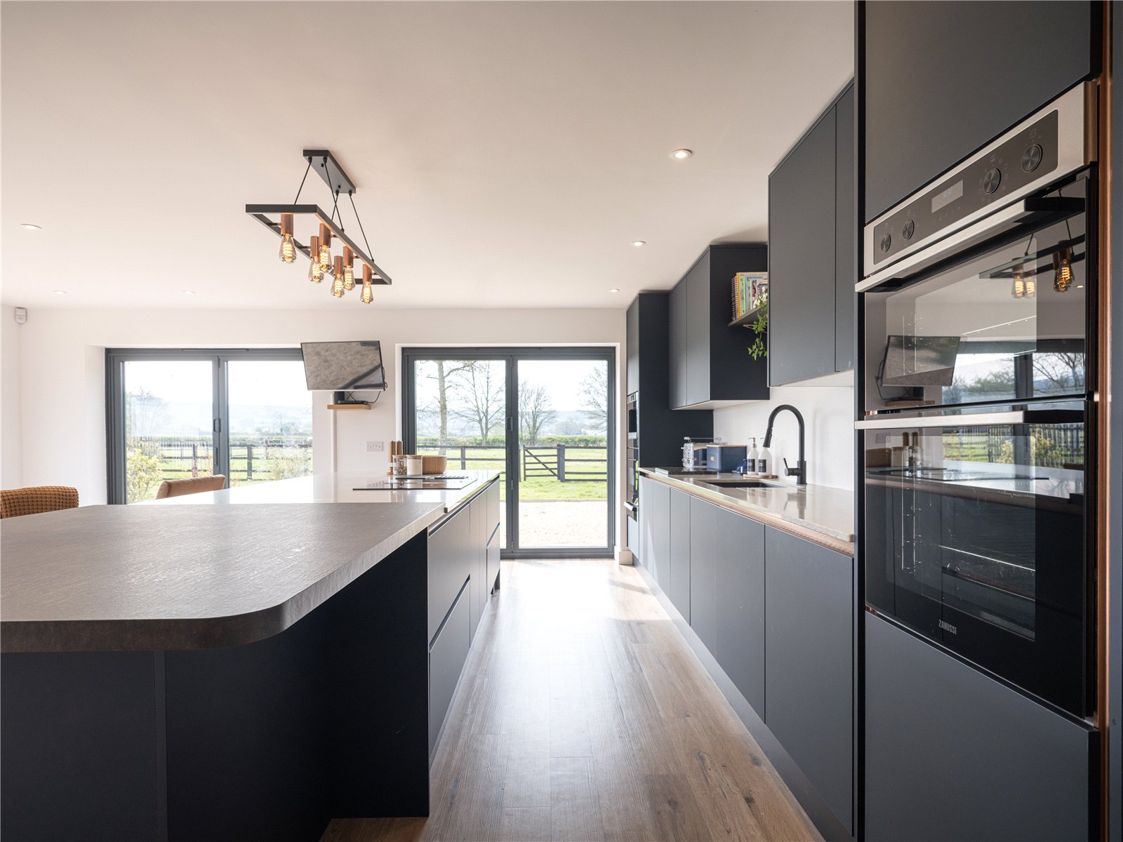 The sleek and stylish kitchen/breakfast room has been fitted with ample storage options and smart integrated appliances including a coffee machine, microwave, dishwasher and ovens with an additional plate warming tray. Three sets of bi-fold doors open out onto the wrap-around gardens and outdoor seating areas and allow panoramic views over the surrounding grounds from all viewpoints. During the summer months, the doors can be open to the gardens allowing a fabulous flow between inside and out. In the colder months, there is a further, more relaxed seating area to enjoy a peaceful moment in front of the log burner.