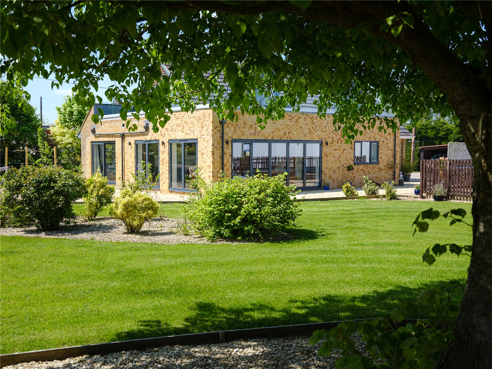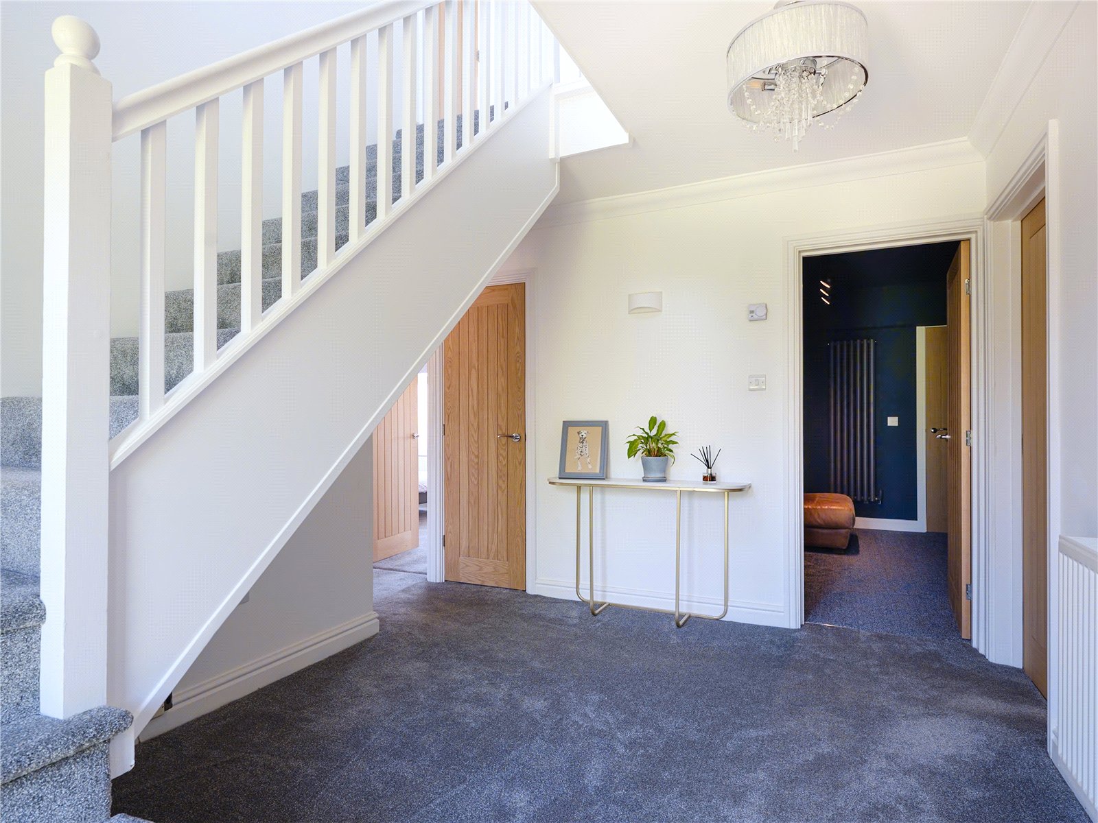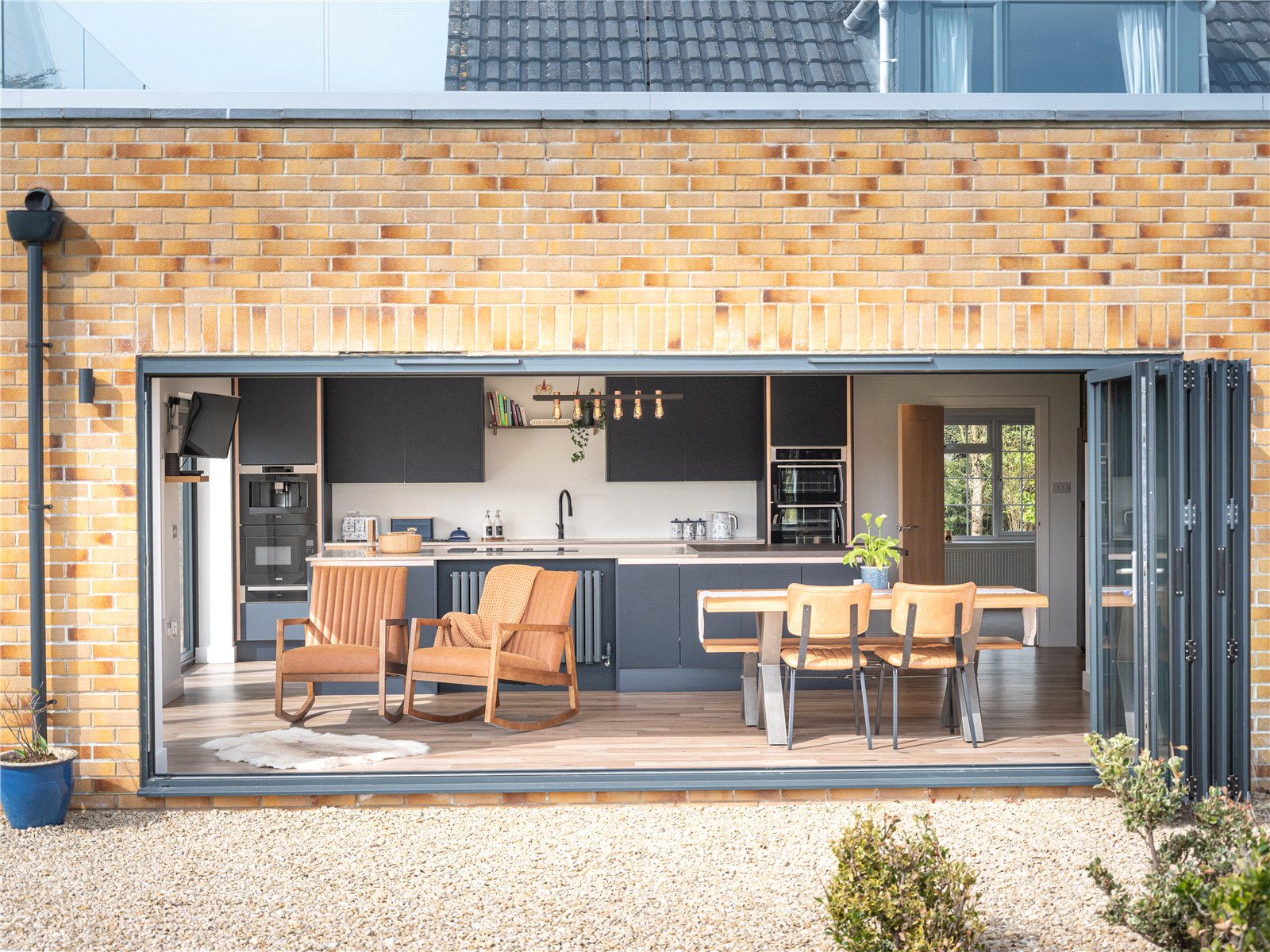 The sleek and stylish kitchen/breakfast room has been fitted with ample storage options and smart integrated appliances including a coffee machine, microwave, dishwasher and ovens with an additional plate warming tray. Three sets of bi-fold doors open out onto the wrap-around gardens and outdoor seating areas and allow panoramic views over the surrounding grounds from all viewpoints. During the summer months, the doors can be open to the gardens allowing a fabulous flow between inside and out. In the colder months, there is a further, more relaxed seating area to enjoy a peaceful moment in front of the log burner.