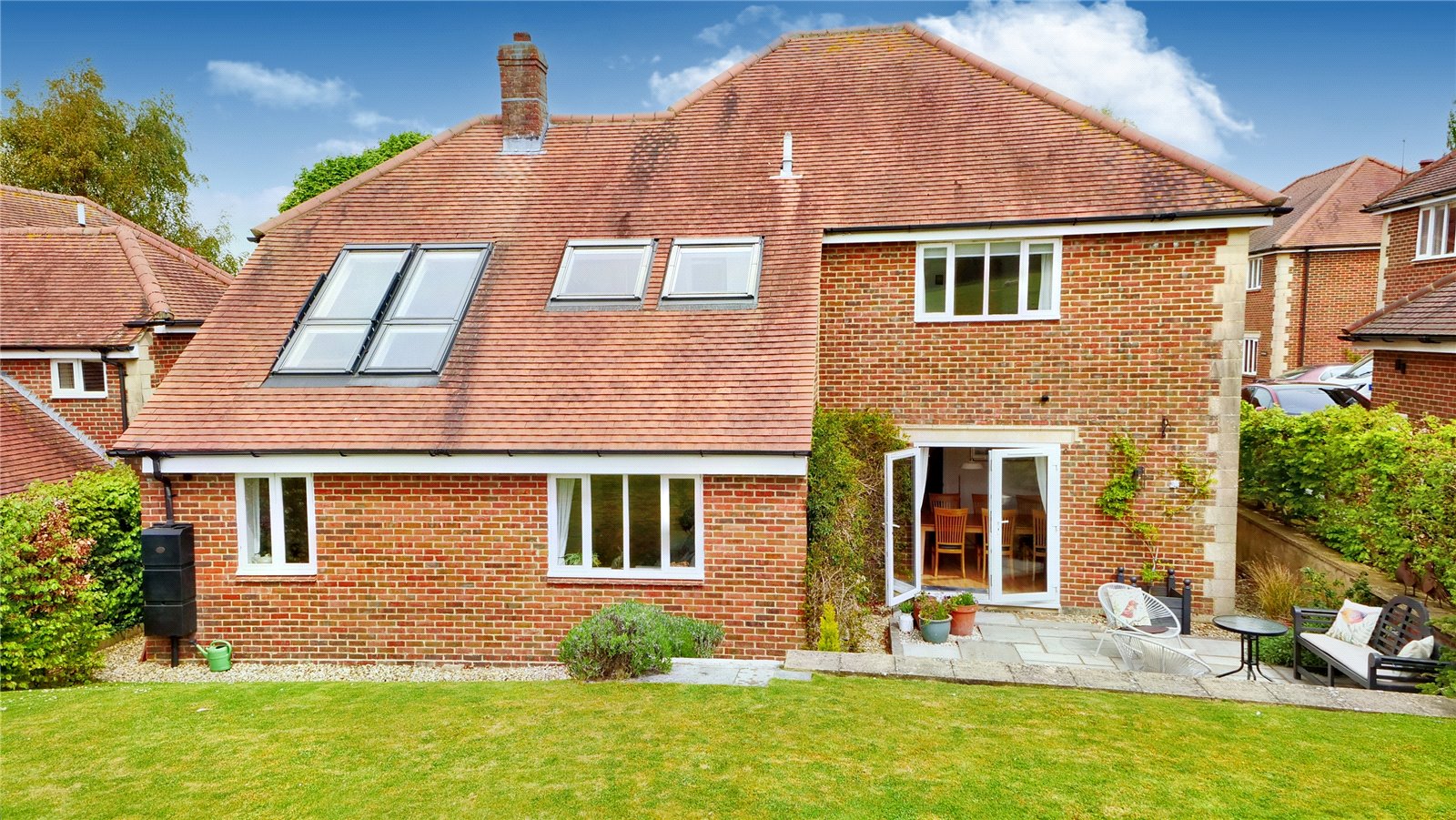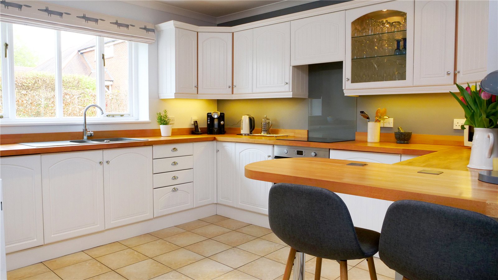 The spacious and light reception room has direct views to the garden behind and links through to the dining room and kitchen. The built-in log burner provides an attractive central focal point, and the room can be laid out in many configurations and would suit a wide range of furniture. Double doors from the dining room lead out to a patio and the garden beyond. The kitchen offers plenty of built-in units and a breakfast bar, in addition to a range of built-in appliances. The next-door utility room provides a useful side entrance and room for further white goods too. All the interiors have been decorated in a neutral palate and has been maintained in excellent condition. A downstairs WC, study and externally accessed garage complete the ground floor.