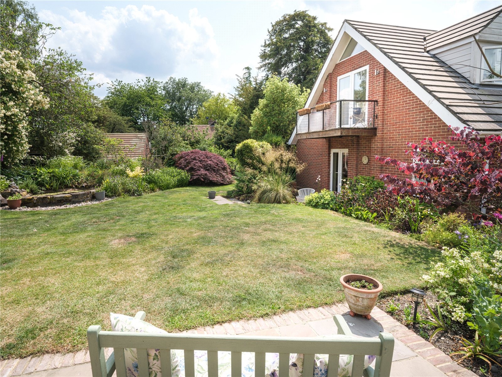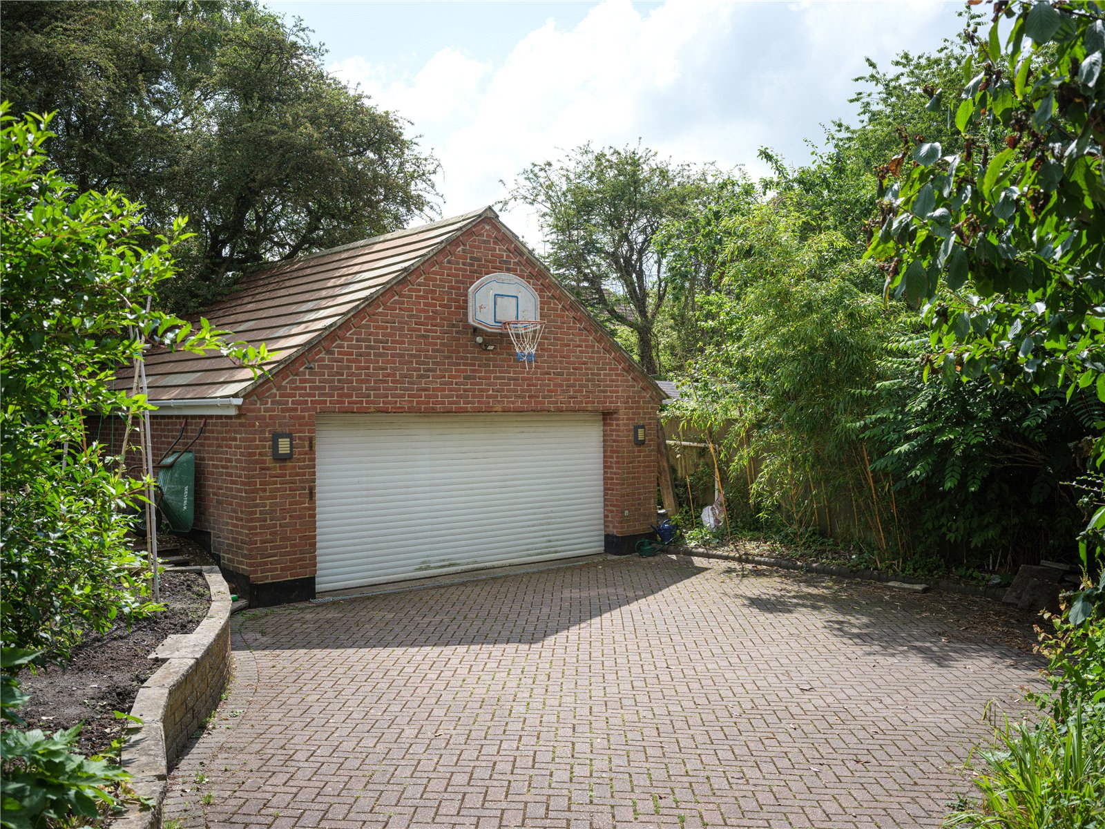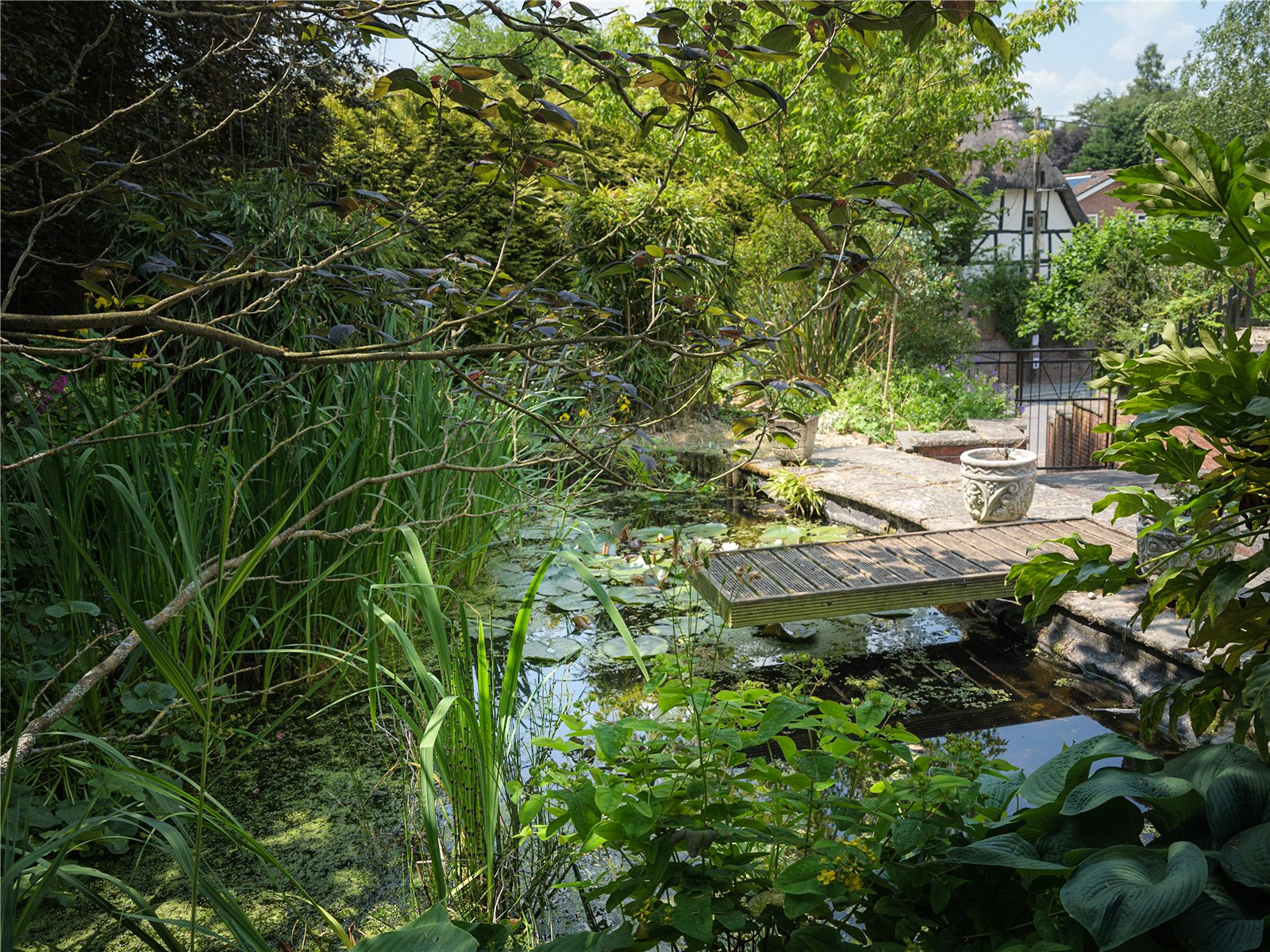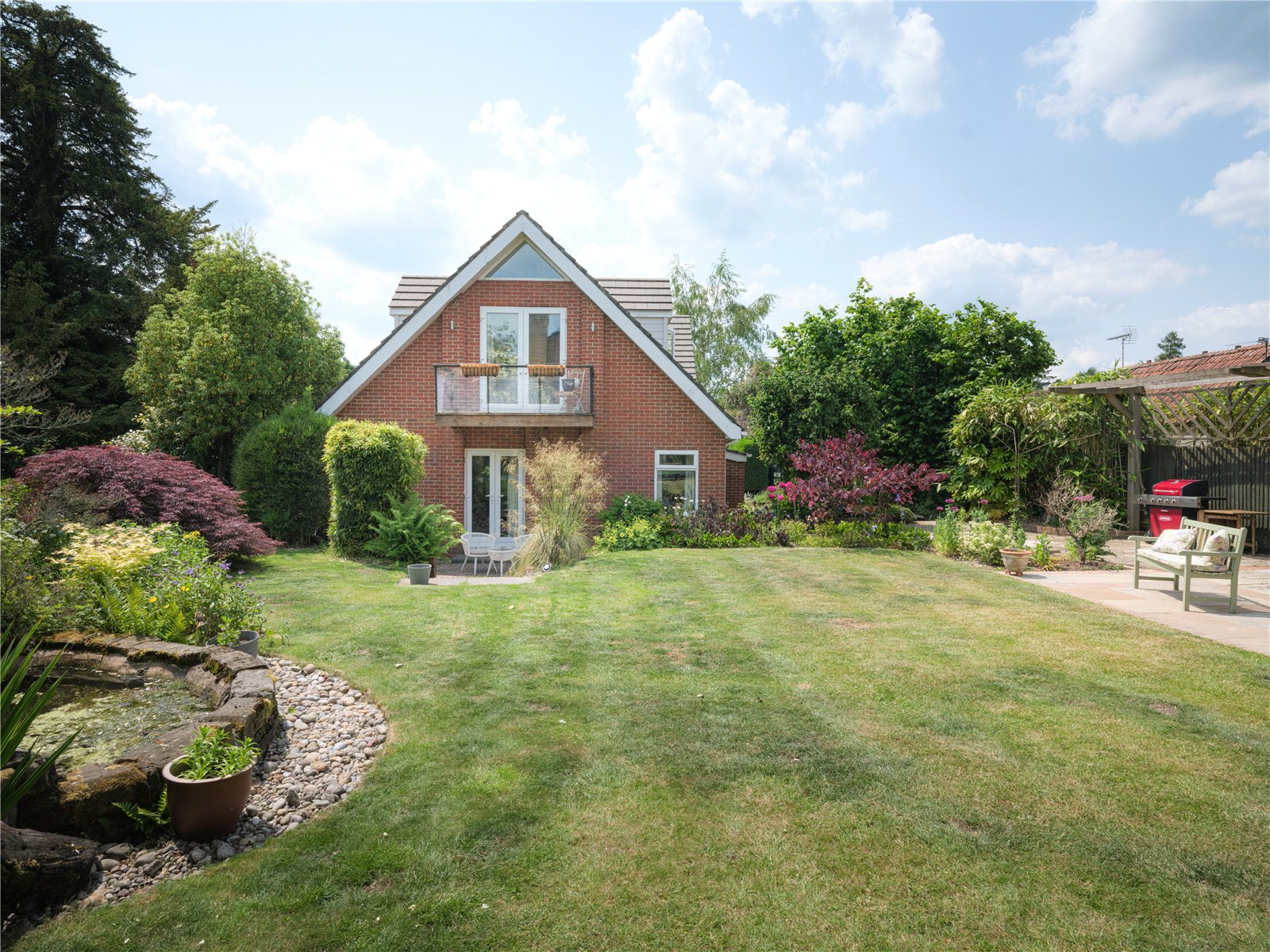 Bordered by a large patio on one side, including storage access to the side of the property, the North-East facing garden is lush with all manner of flora infusing the outdoors with glorious scents of freshness and natural English beauty. Flower beds guide the edges of the lawn to one of three beautiful water features, creating an idyllic countryside scene, ideal for entertaining and outdoor dining. Gardening enthusiasts will delight in the presence of Malvern roses and Generous Gardener amongst other flowers that populate the garden, seasonally entwined in the lattice archway leading to the vegetable patch; reached by the paved and woodchipped paths that weave beneath the cover of coniferous trees. When respite and reflection is required, the miniature zen bridge over the rock pebble stream provides relief, adjacent to the two larger ponds, beneath the canopy of another majestic pine, the perfect thoughtful spot to embrace mindfulness. The Yew tree at the front of the property is thought to be over 500 years old. On a practical note there are external electrical and water supplies, with several rainwater harvesting points, a greenhouse and 2 garden sheds.