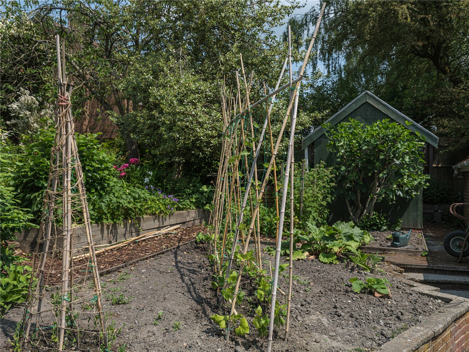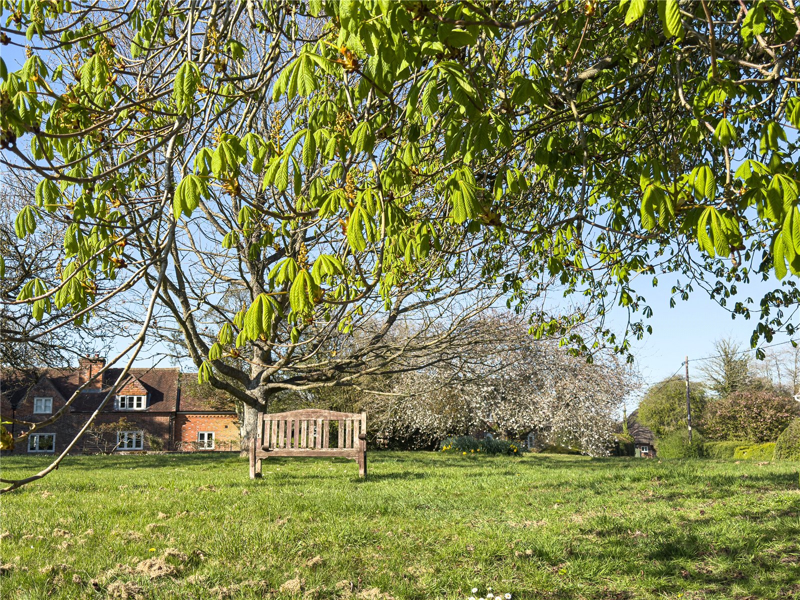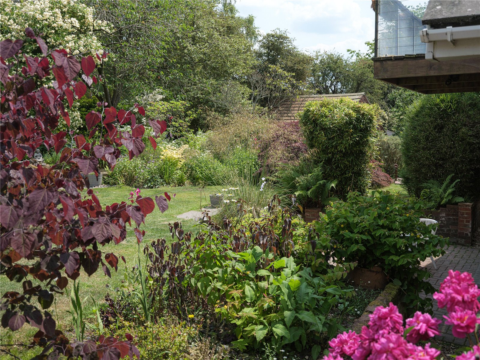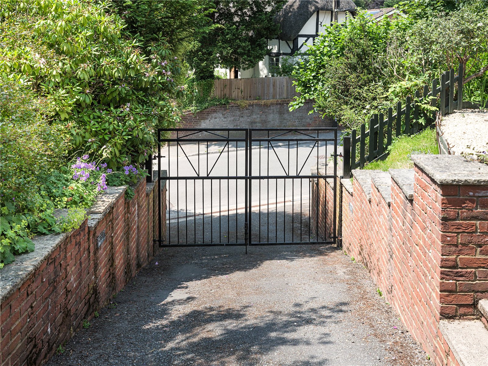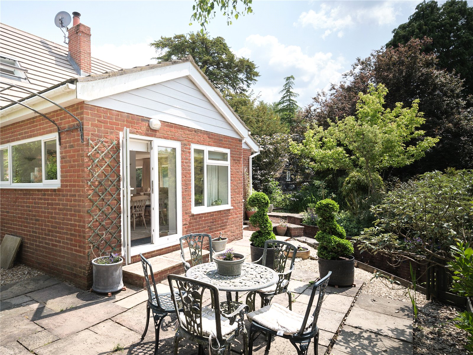 Bordered by a large patio on one side, including storage access to the side of the property, the North-East facing garden is lush with all manner of flora infusing the outdoors with glorious scents of freshness and natural English beauty. Flower beds guide the edges of the lawn to one of three beautiful water features, creating an idyllic countryside scene, ideal for entertaining and outdoor dining. Gardening enthusiasts will delight in the presence of Malvern roses and Generous Gardener amongst other flowers that populate the garden, seasonally entwined in the lattice archway leading to the vegetable patch; reached by the paved and woodchipped paths that weave beneath the cover of coniferous trees. When respite and reflection is required, the miniature zen bridge over the rock pebble stream provides relief, adjacent to the two larger ponds, beneath the canopy of another majestic pine, the perfect thoughtful spot to embrace mindfulness. The Yew tree at the front of the property is thought to be over 500 years old. On a practical note there are external electrical and water supplies, with several rainwater harvesting points, a greenhouse and 2 garden sheds.