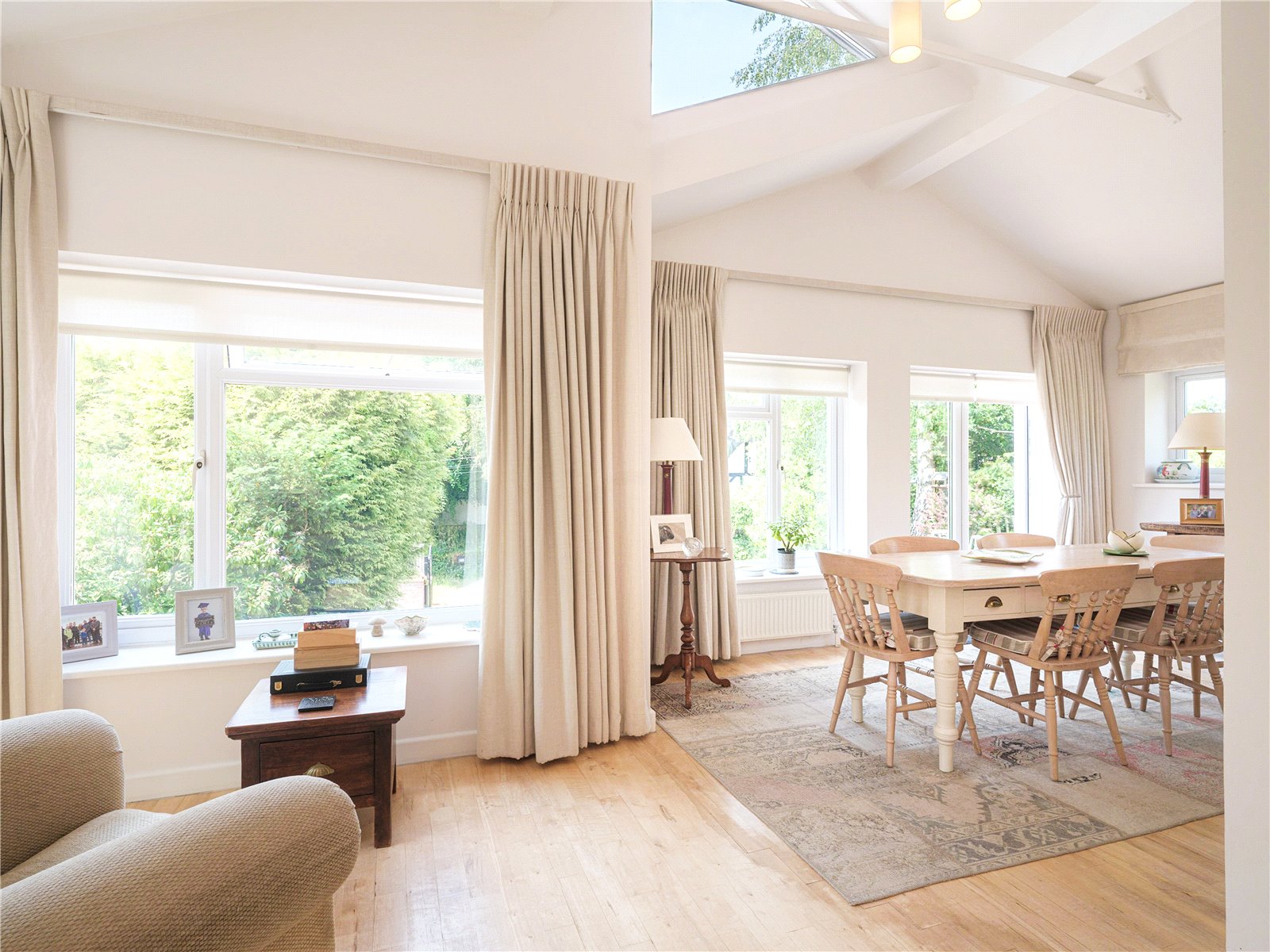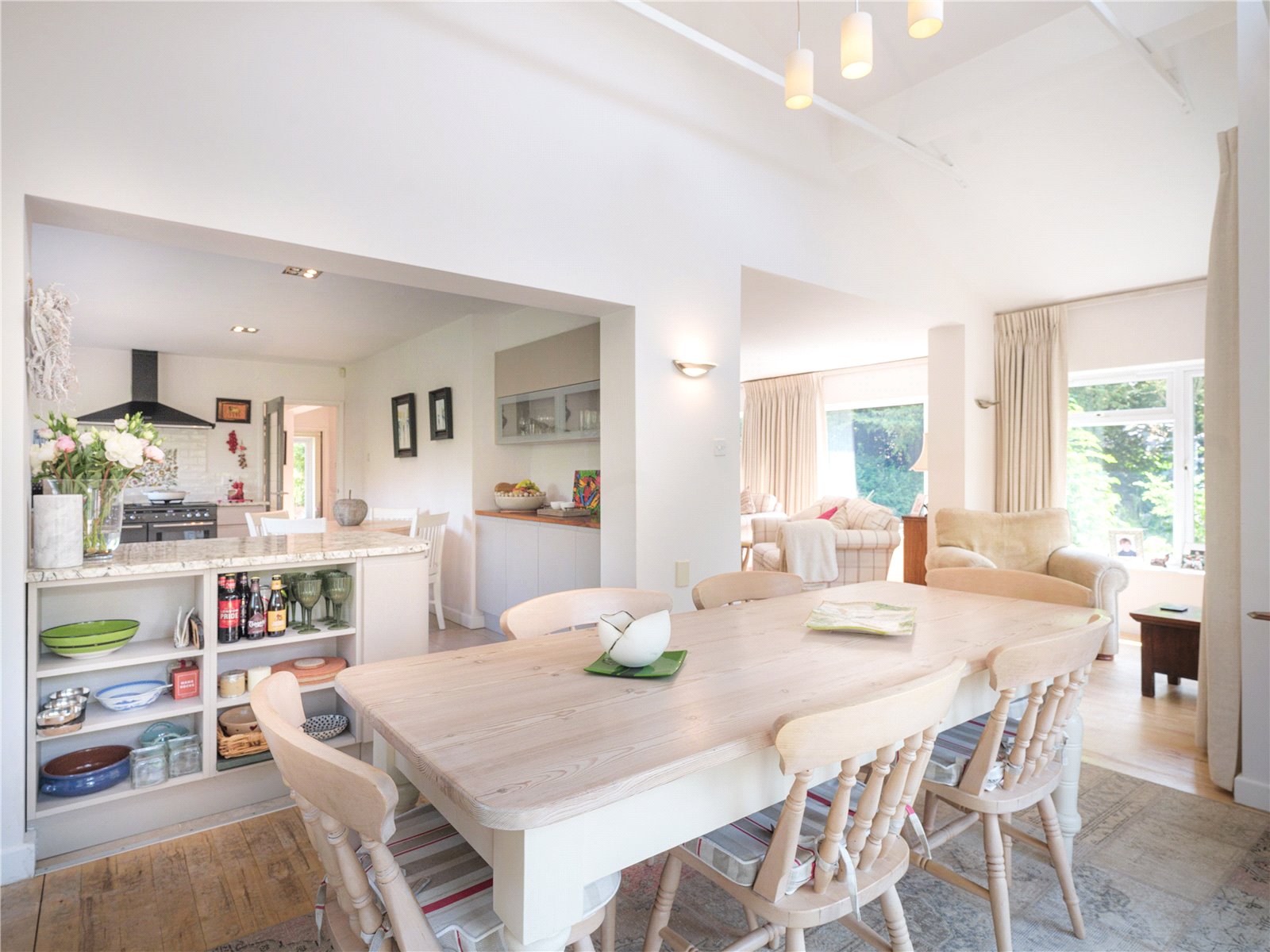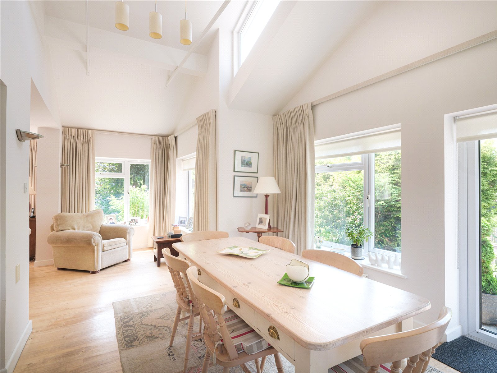 The communal layout is perfect for families and guests to enjoy, starting with the living room which includes a Jøtul stove for the colder months. The open layout flows elegantly around the property, blending into the dining room and finishes with the recently remodelled open plan kitchen designed by John Lewis, alongside modern appliances including a Rangemaster cooker. This generous space enjoys plenty of light due to the surrounding windows, complemented by the dining room's vaulted ceiling and French doors opening onto the front patio. Of the two double bedrooms on the ground floor, one benefits from a discreet ensuite bathroom including a rainfall shower. The second ground floor bedroom has a garden view, with French doors out to the rear of the property, meaning this room can be flexibly used if not required as bedroom space. A spacious family bathroom is also available with room for utilities such as washer/dryer.