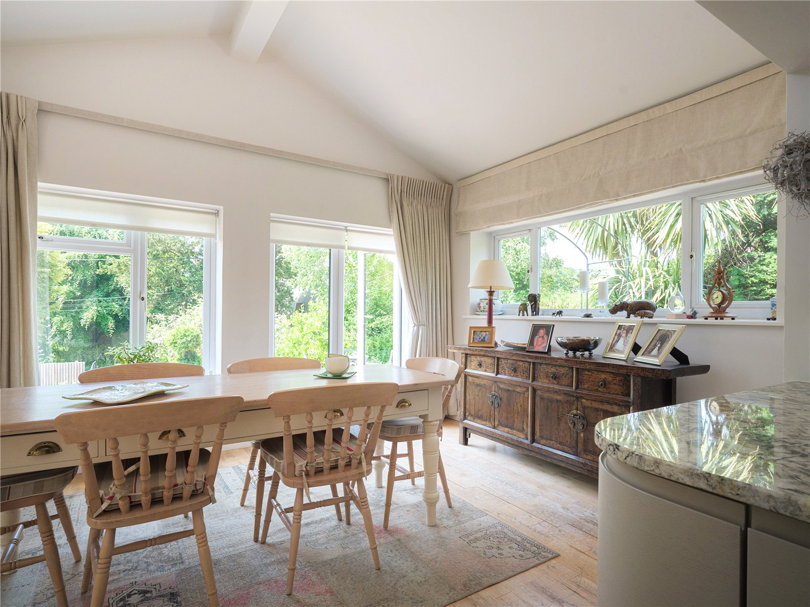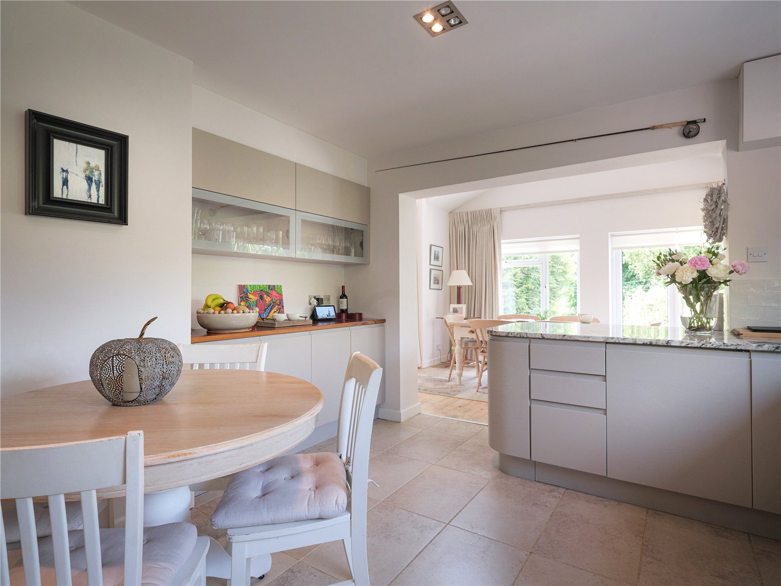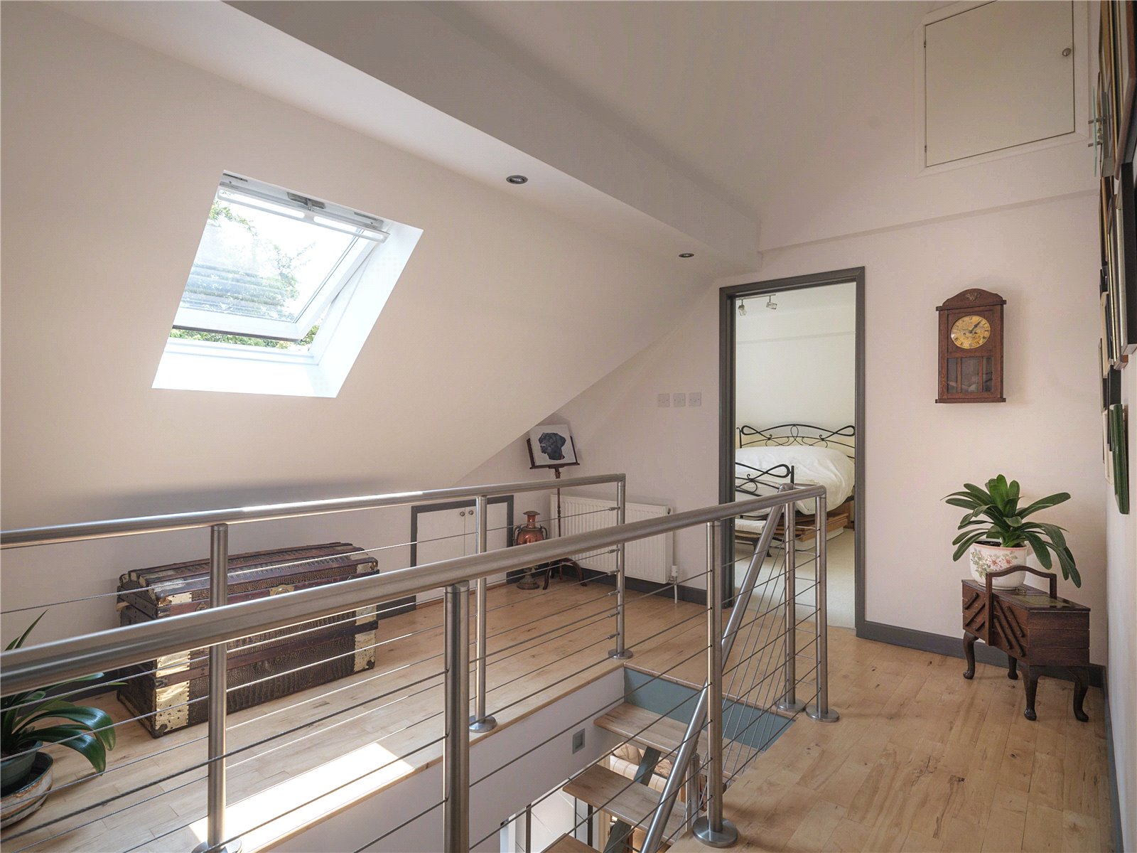 The communal layout is perfect for families and guests to enjoy, starting with the living room which includes a Jøtul stove for the colder months. The open layout flows elegantly around the property, blending into the dining room and finishes with the recently remodelled open plan kitchen designed by John Lewis, alongside modern appliances including a Rangemaster cooker. This generous space enjoys plenty of light due to the surrounding windows, complemented by the dining room's vaulted ceiling and French doors opening onto the front patio. Of the two double bedrooms on the ground floor, one benefits from a discreet ensuite bathroom including a rainfall shower. The second ground floor bedroom has a garden view, with French doors out to the rear of the property, meaning this room can be flexibly used if not required as bedroom space. A spacious family bathroom is also available with room for utilities such as washer/dryer.