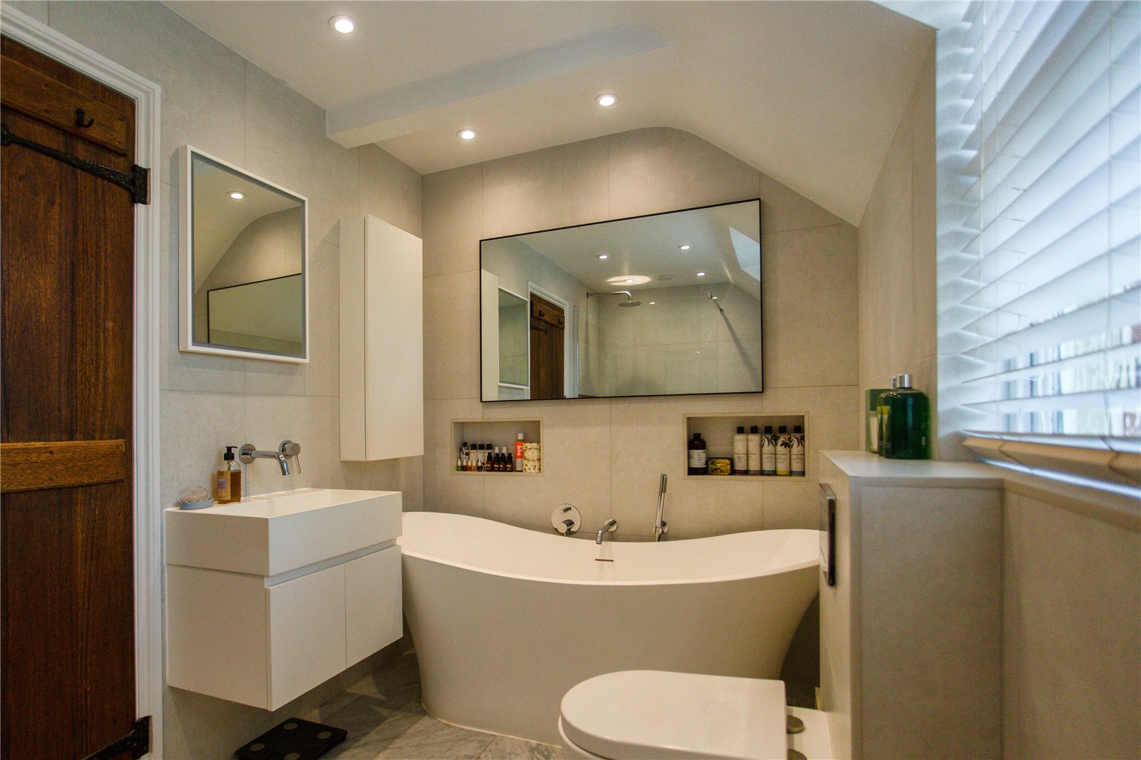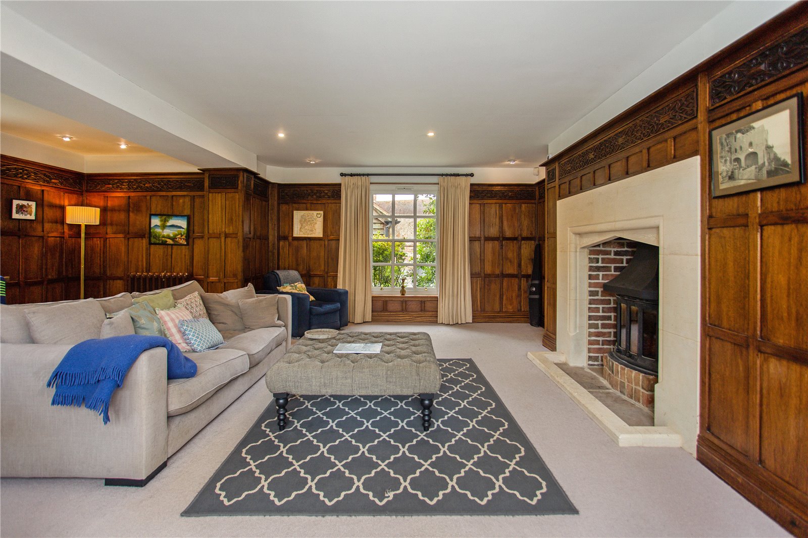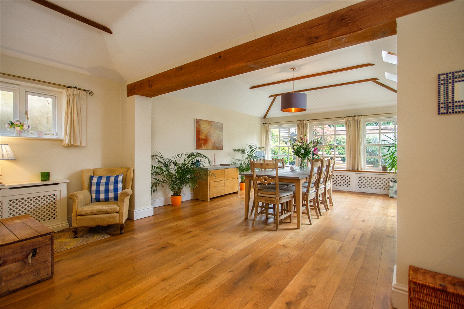 The front porch leads through to a spacious, light filled entrance hall with tiled floor. The sitting room has been fitted with beautiful wood panelling giving a traditional feel, and the Scandinavian log burner is perfect for cosy nights in front of the fireplace. The impressive kitchen space features a range of built-in cupboard spaces including large larder, as well as an Alpha range which is also an efficient gas boiler. Directly open to the kitchen, the superb dining room is a delightful airy space which seats many guests comfortably, with a vaulted ceiling and excellent views to the rear garden. A utility room is neatly tucked away by the side entrance, as is a separate cloakroom. The versatile study or family room is another large space with many possible uses and leads through to a very large bedroom. This is an ideal guest suite, which could be used independently, with an ensuite shower room - recently upgraded including underfloor heating with Italian marble floors.