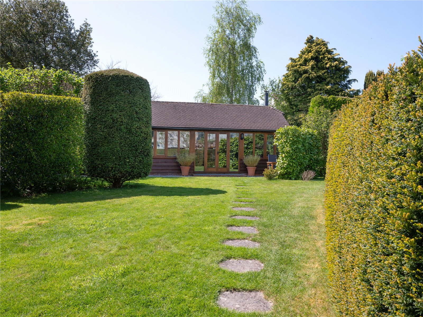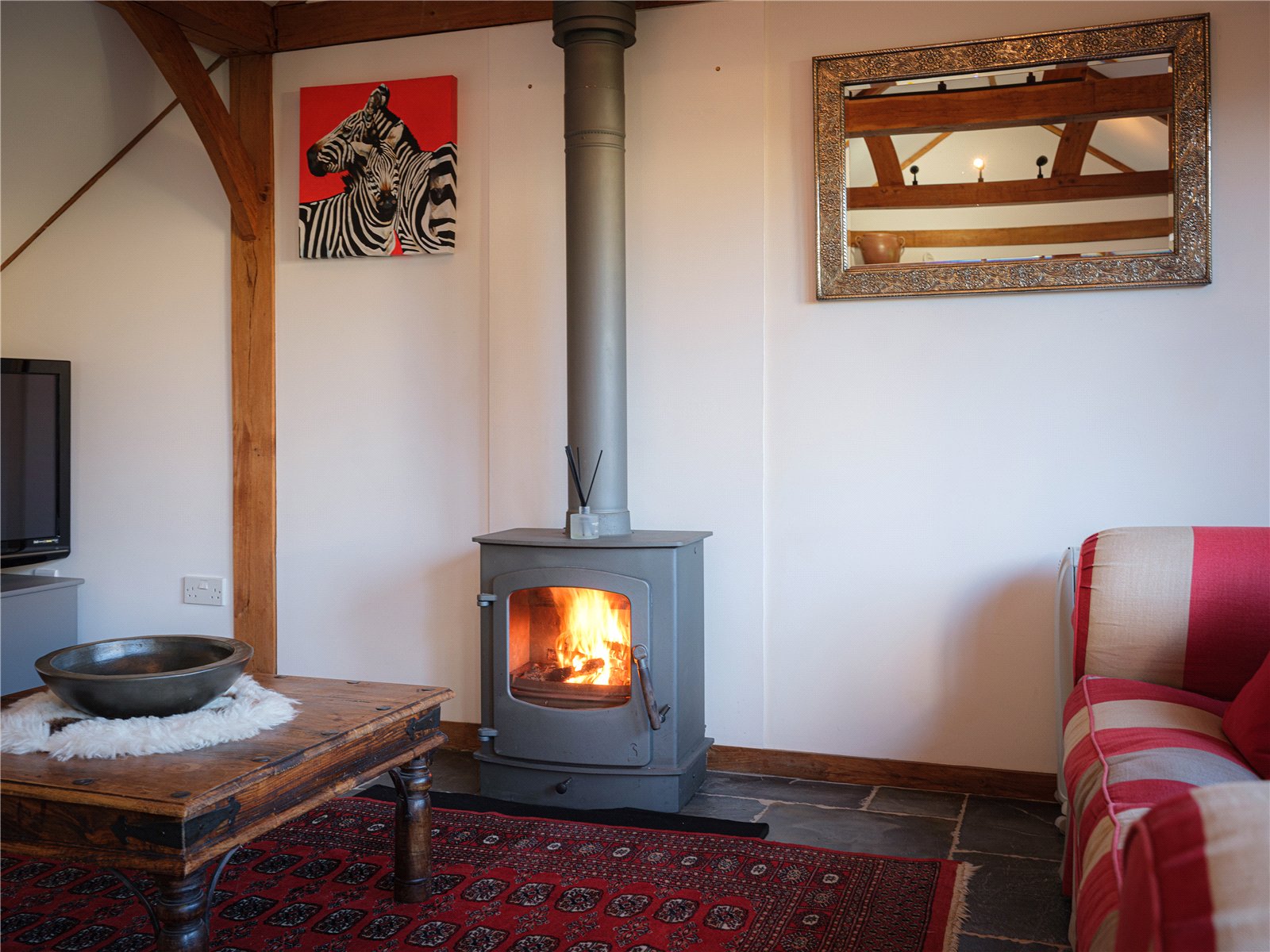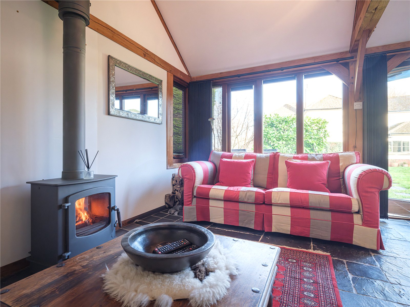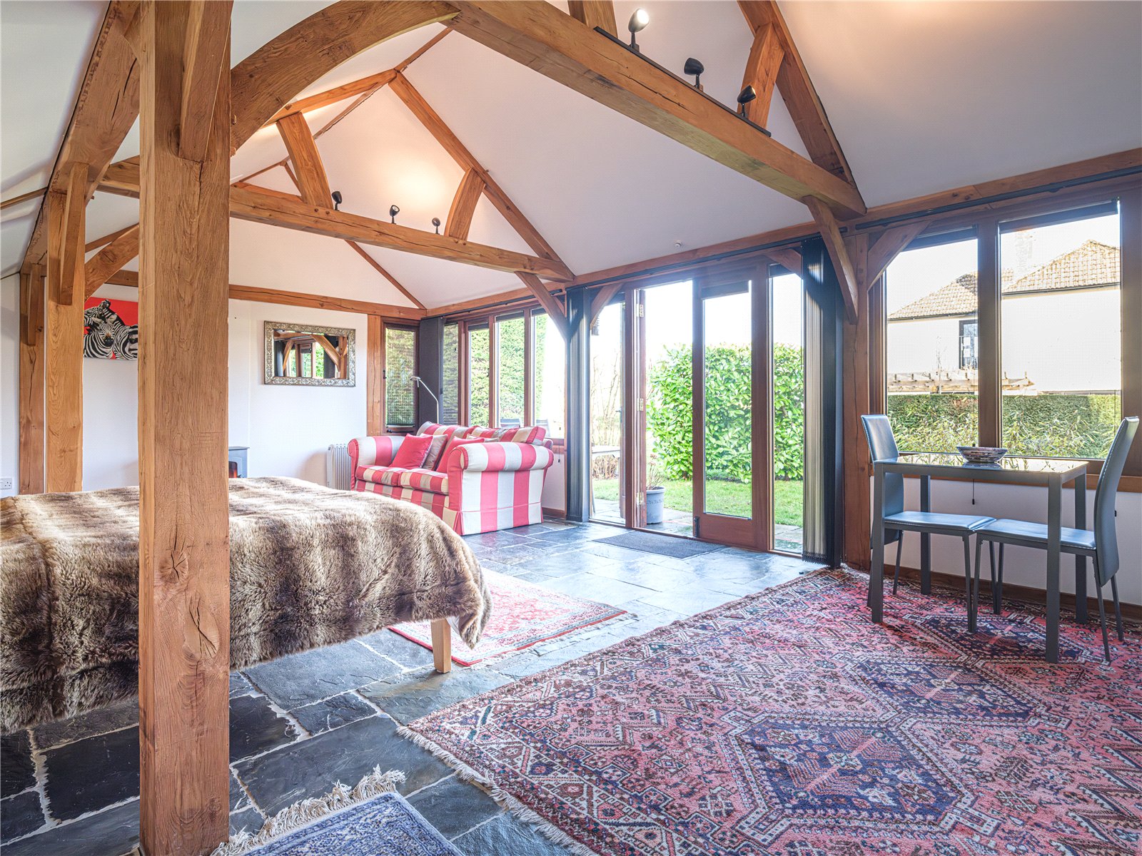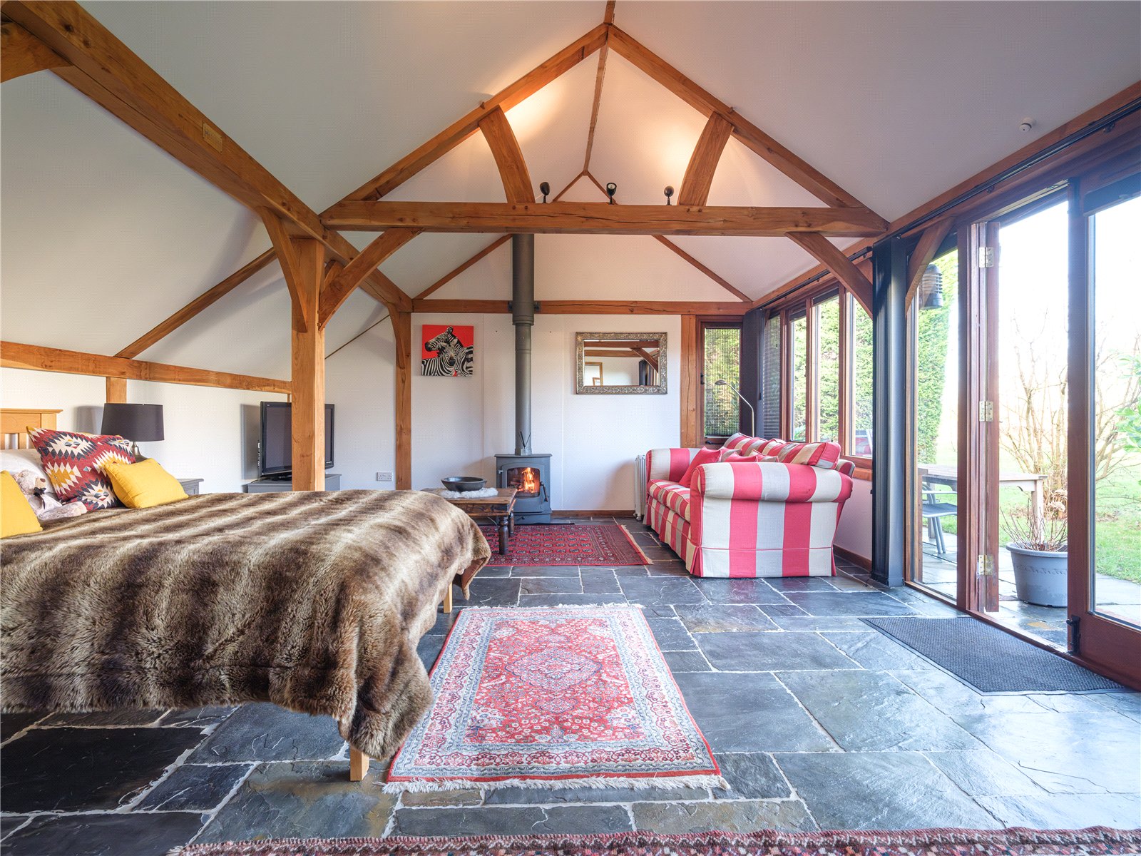 The timber framed garden annexe has beautiful, exposed beams and slate flooring, providing a really characterful space. The log burner adds to the ambience. With a separate bathroom and a kitchen area with freestanding furniture, this space could function independently as an annexe, or home office set up depending on requirements.