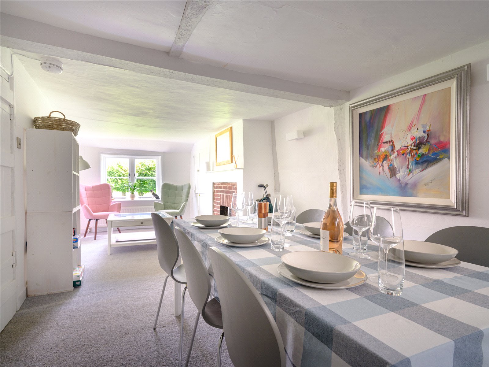 The entire property has been decorated with a beautiful neutral palate, maximising the space and light. The sitting room features a charming brick inglenook fireplace with log burner and offers views out to The Green. To the other side of the characterful entrance hall is the dining room, which again enjoys views toward the Lime trees which dissect The Green. The kitchen has been tastefully modernised and a useful utility area adjoins the downstairs WC. The cellar provides excellent storage and good standing height. Historic exposed timber beams are present throughout the house.