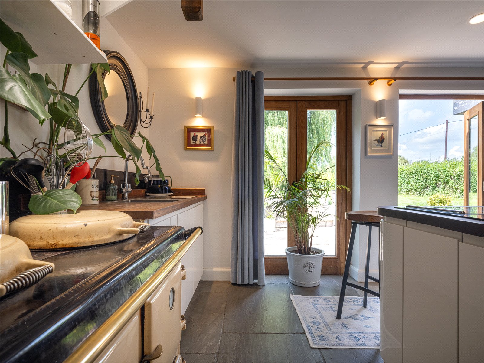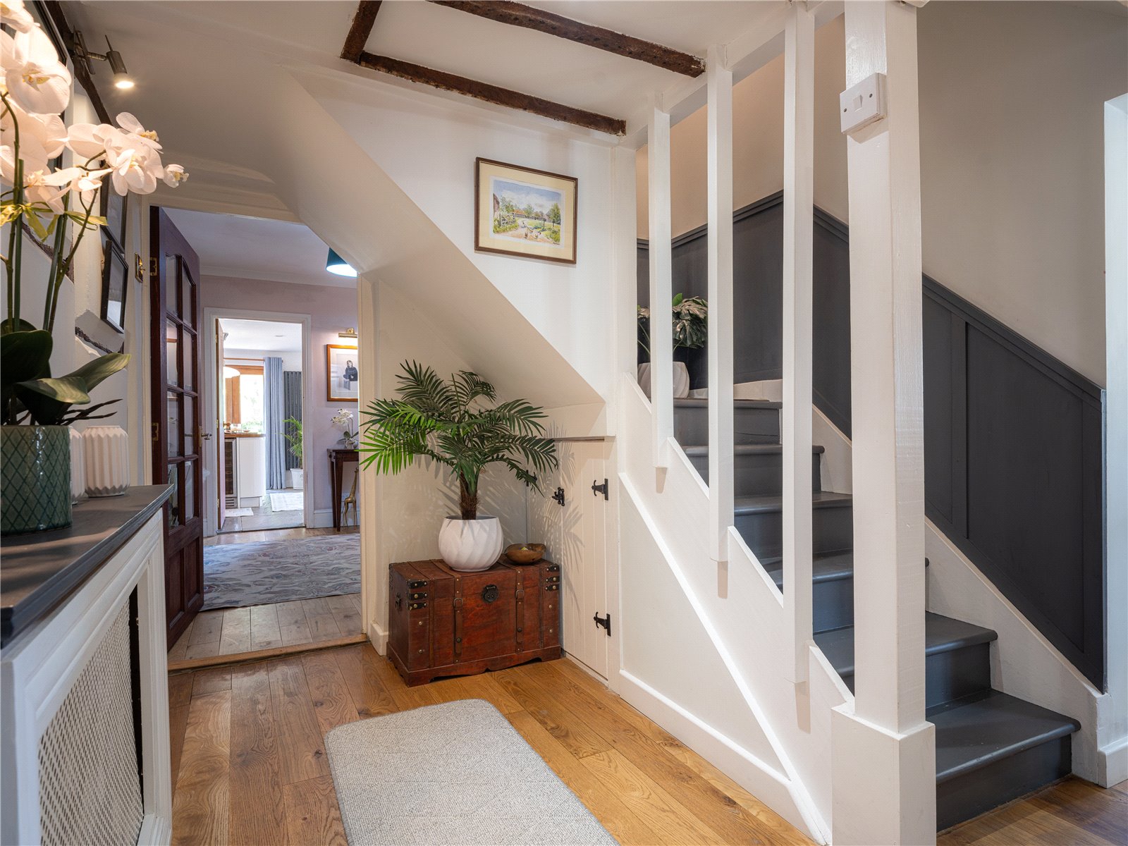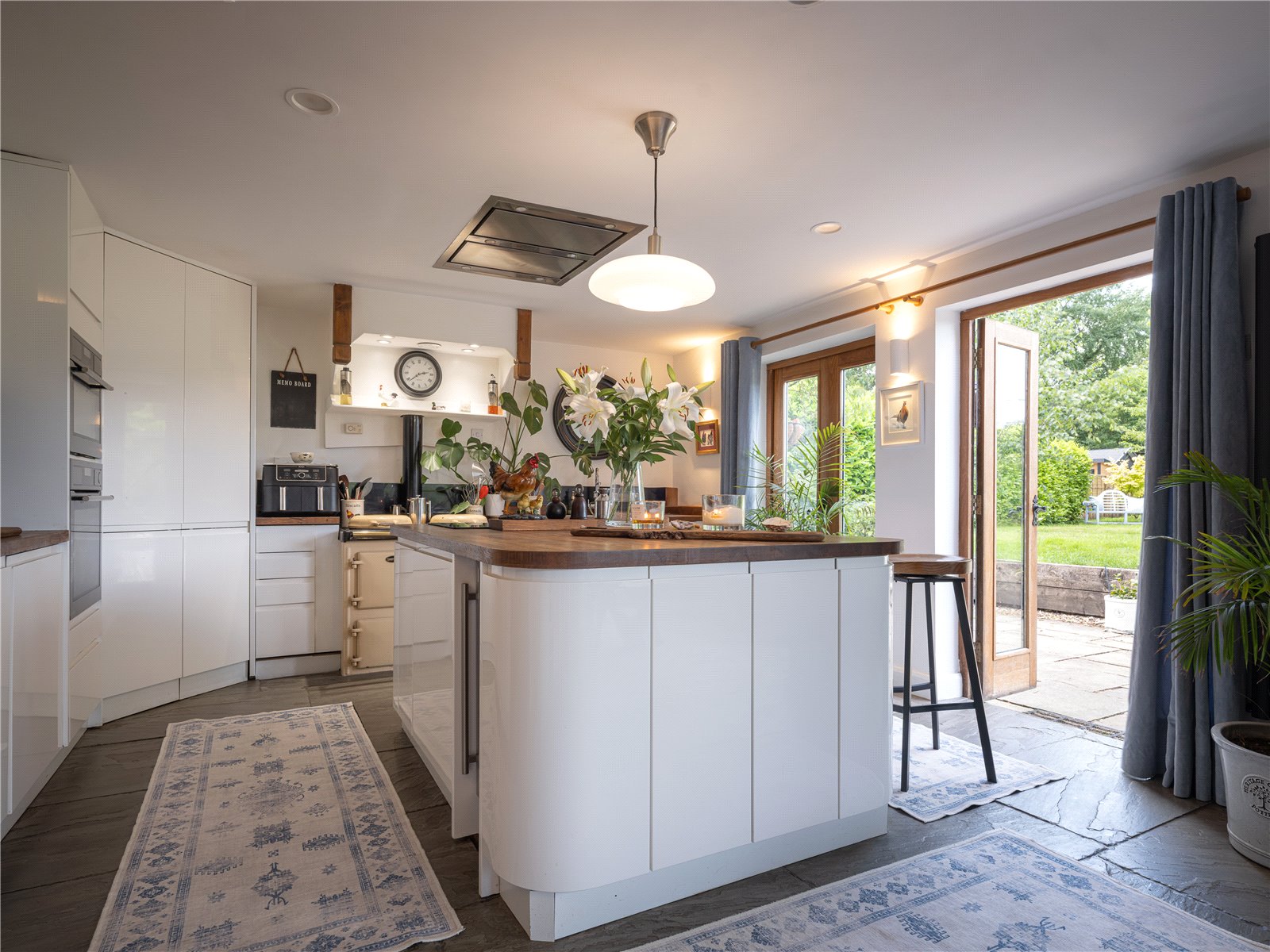 The two primary reception rooms lead off the entrance hallway, both feature open fireplaces and exposed beams with engineered oak flooring. The sitting room is flooded with light thanks to the dual aspect offering views over adjacent fields, making this a wonderful room for entertaining. The snug provides a cosier space, perfect for those winter evenings. Leading on from the interior hall is a traditional study, with bookshelves, a large storage cupboard and a discreet exterior door ideal for escaping to the garden for a break from the working day!