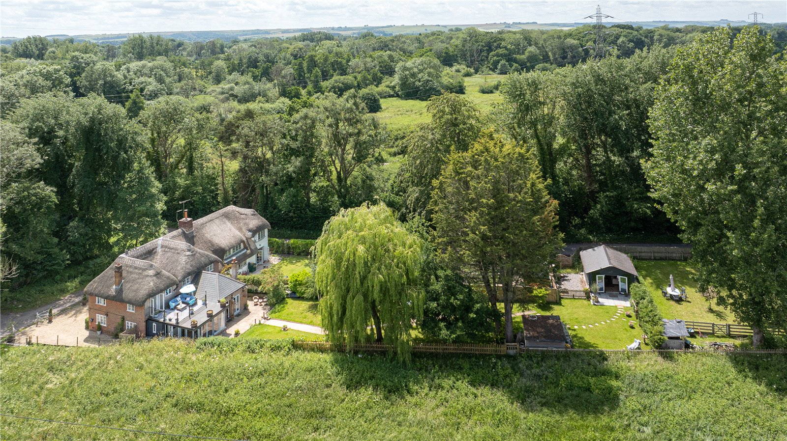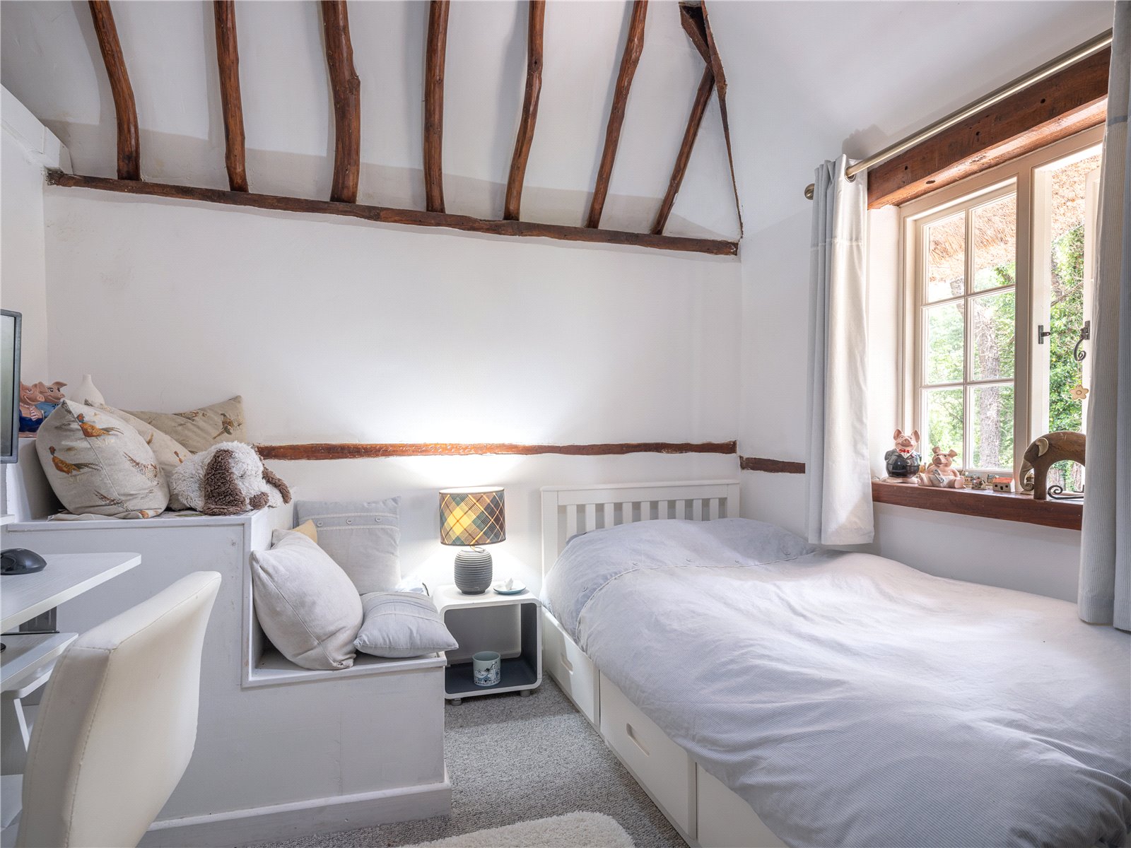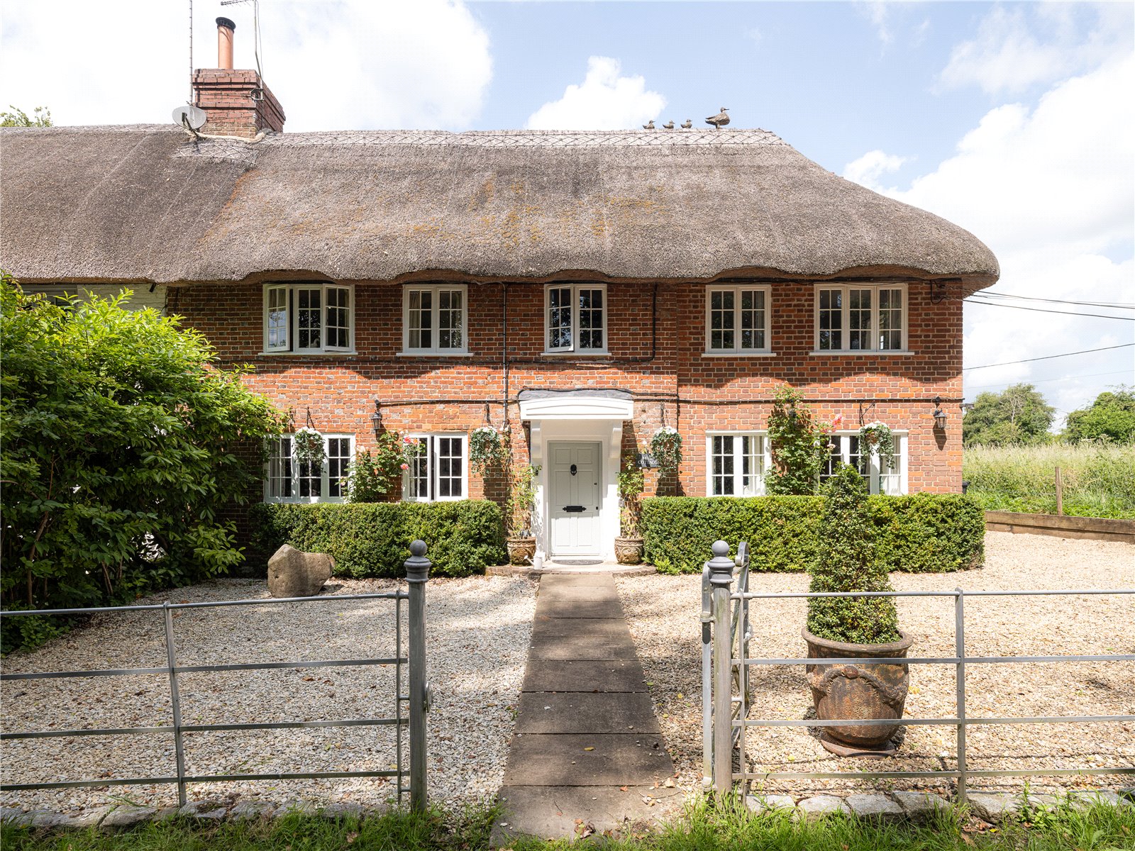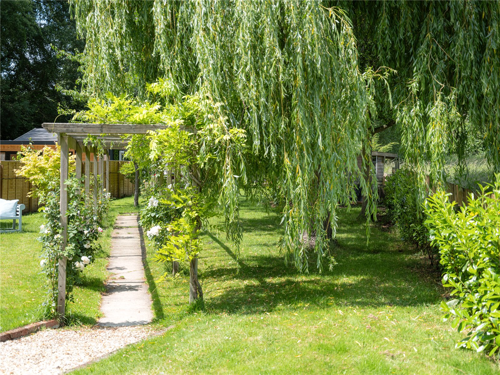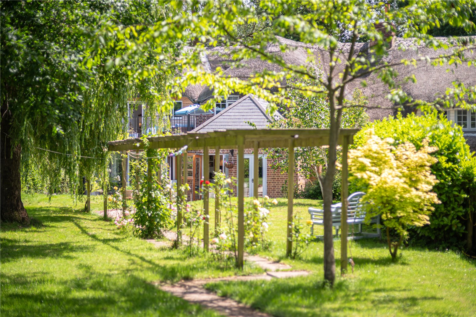 The cottage is approached via a private track, which leads onto The Mill and access to the many footpaths the area benefits from. Traditional estate fencing with both pedestrian and vehicular access allows gravelled parking for 2 cars and access to an EV charging point, with a further parking space available to the rear of the garden. Roses climb up the soft red brick façade with a roof of combed wheat reed straw thatch (re-ridged 2022). The gardens are a delight and extend from the flagstone terrace, winding through the pergola walkway, with a graceful weeping willow offering natural shade, to the spacious summer house and fruit orchard beyond once home to pygmy goats and ducks but now offering a wonderfully private space to enjoy solo or a fabulous summer entertaining spot! There are 2 further wooden stores in the garden and vehicular access to the additional parking space.