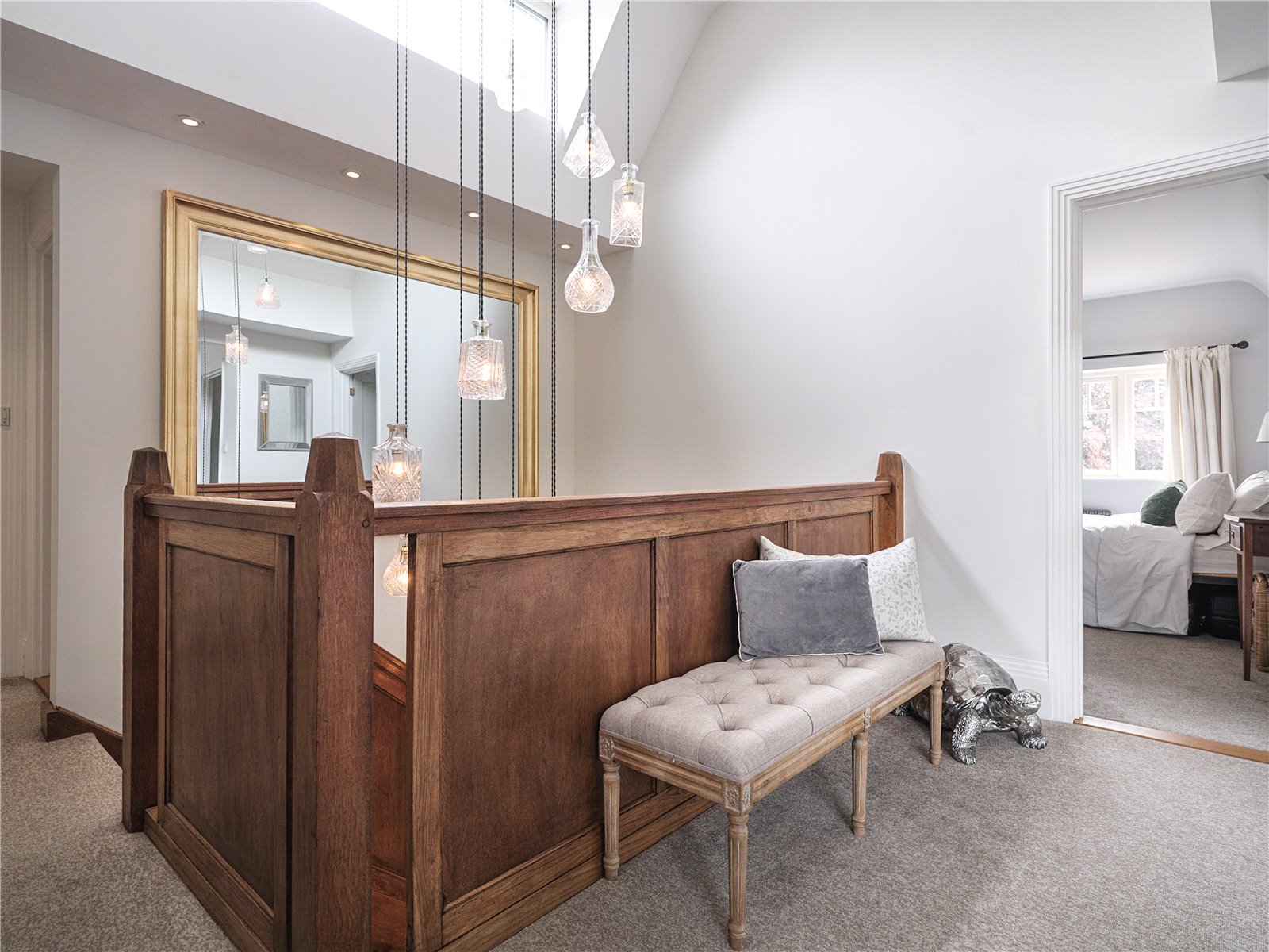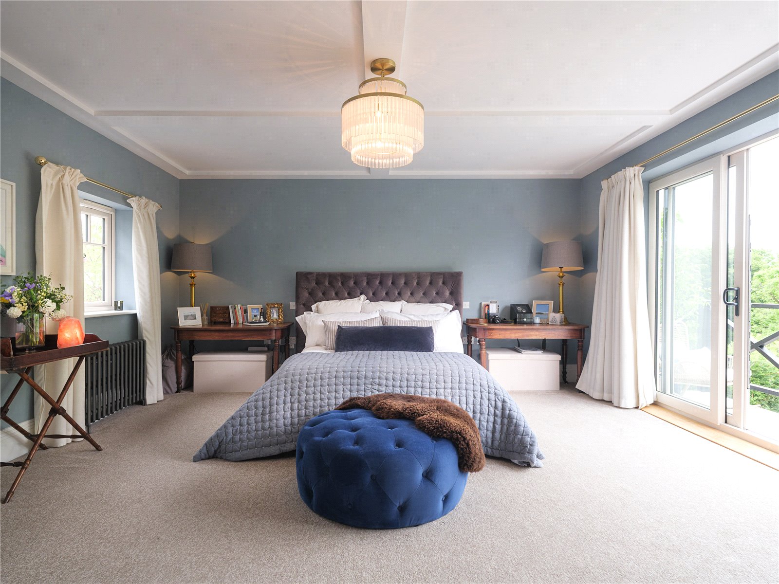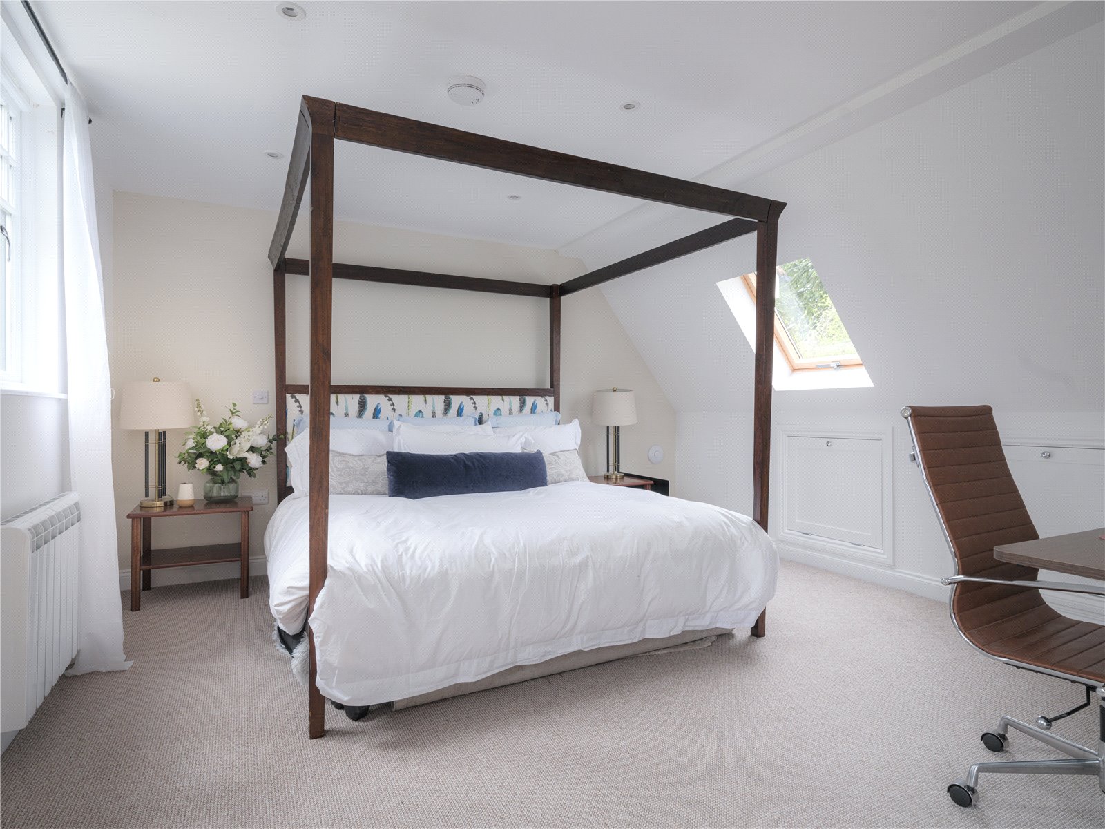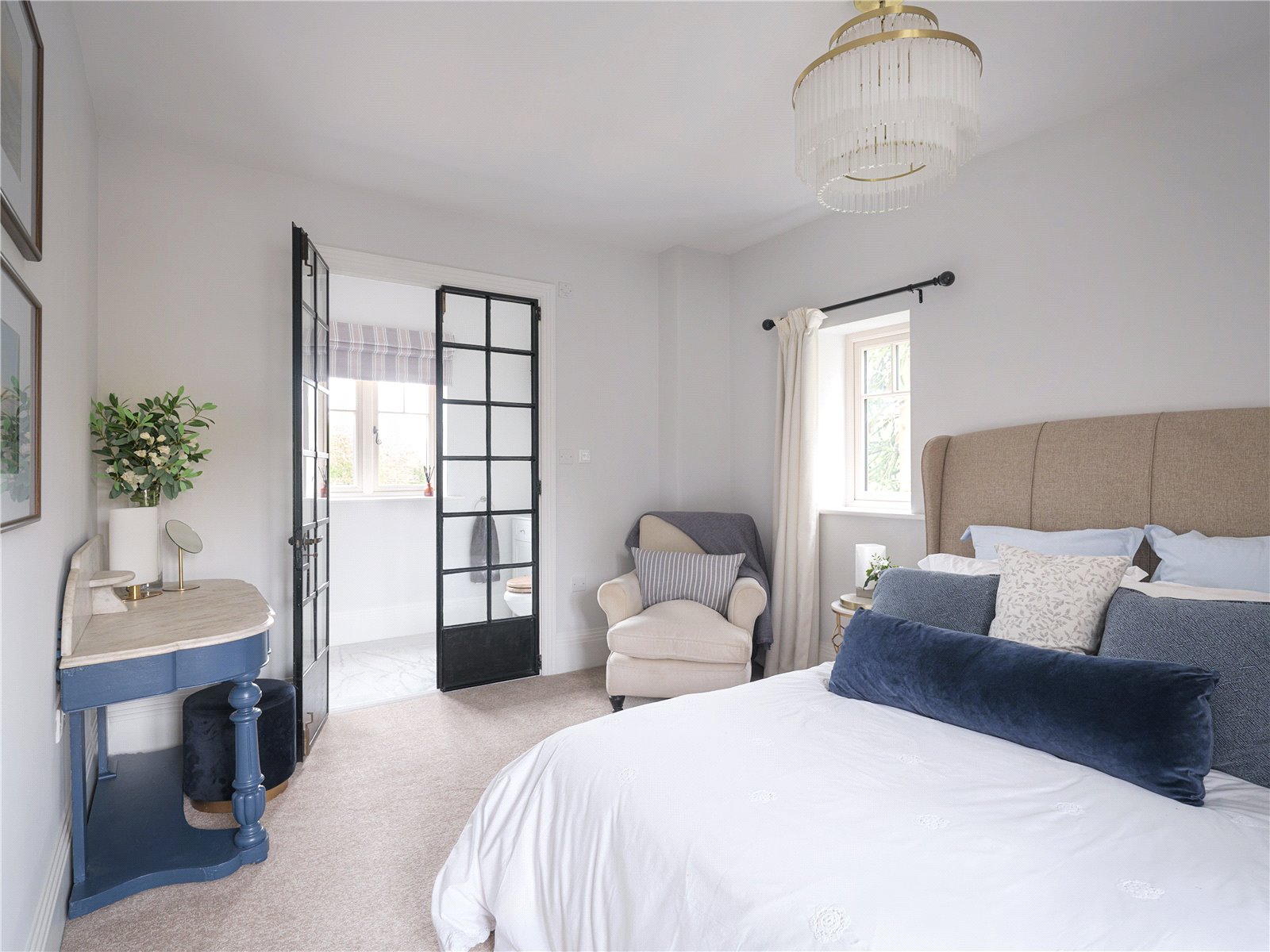 The landing, with high ceilings and a large bow bay window, gives a nod to the original 1930's architectural design. The master suite is dual aspect and filled with natural light with sliding double doors leading out onto the private east-facing balcony. There is a separate dressing area and luxury en-suite. Three further bedrooms, including the principal guest room with en-suite, and the family bathroom complete the first floor accommodation.