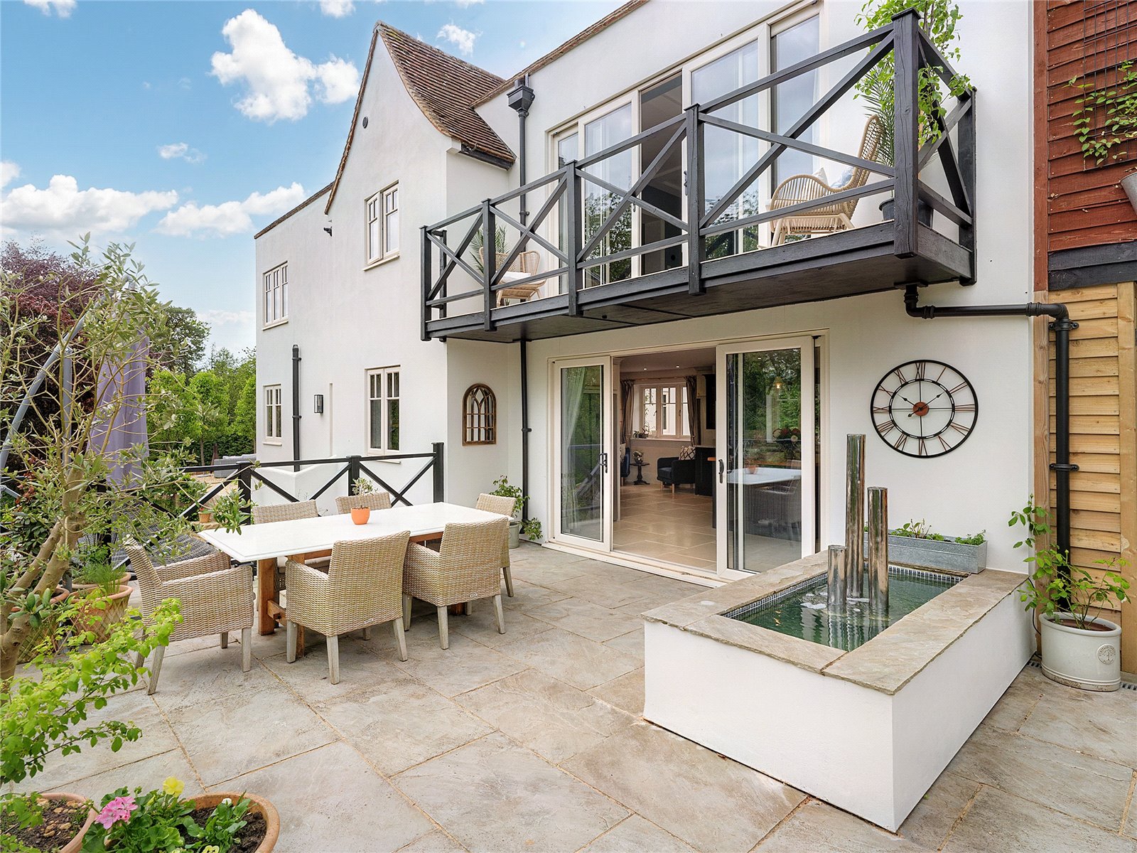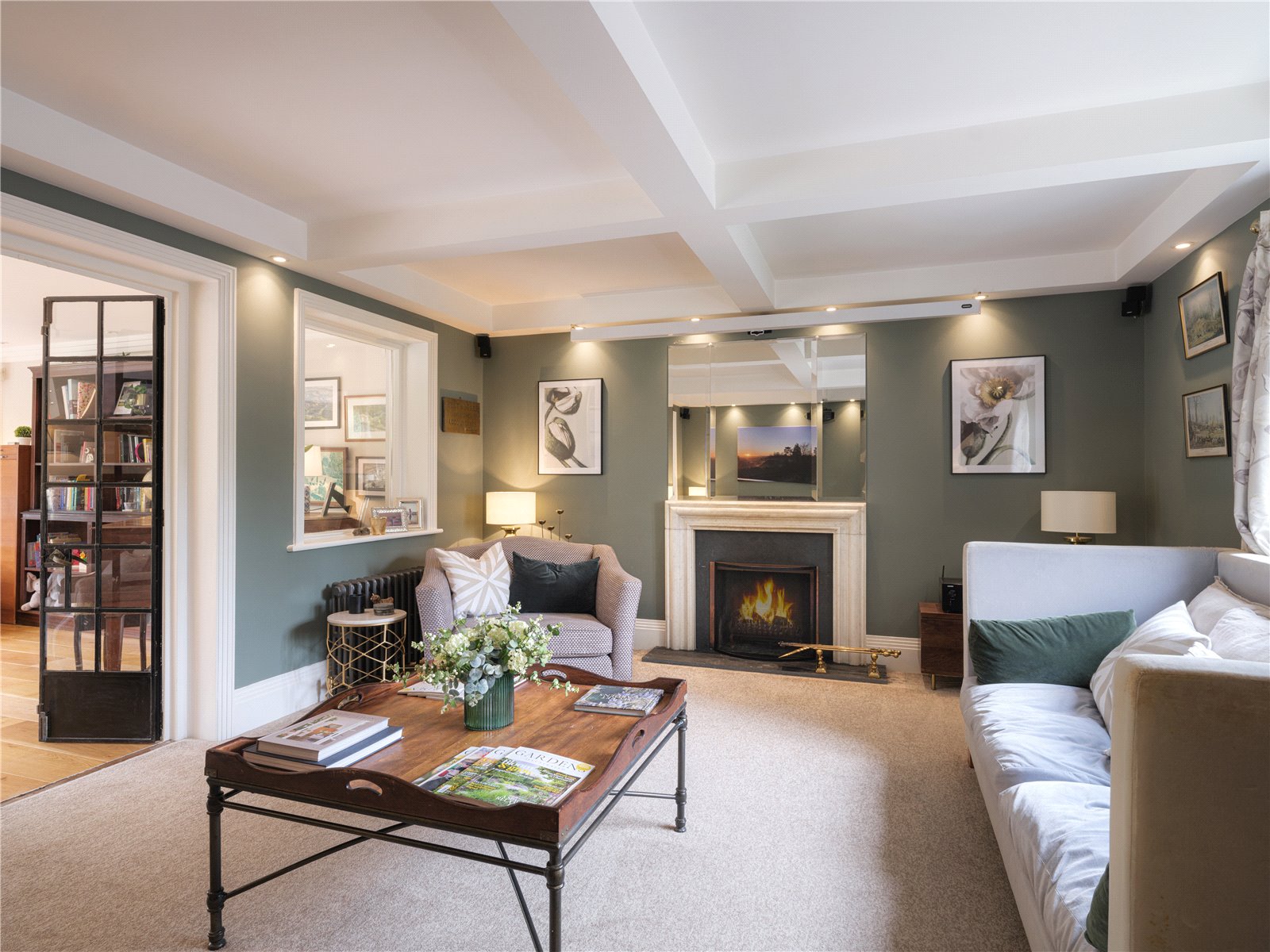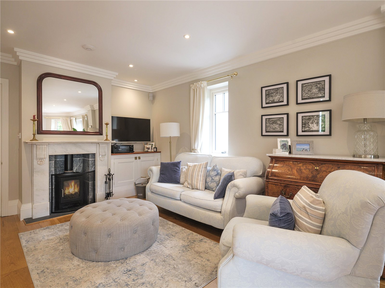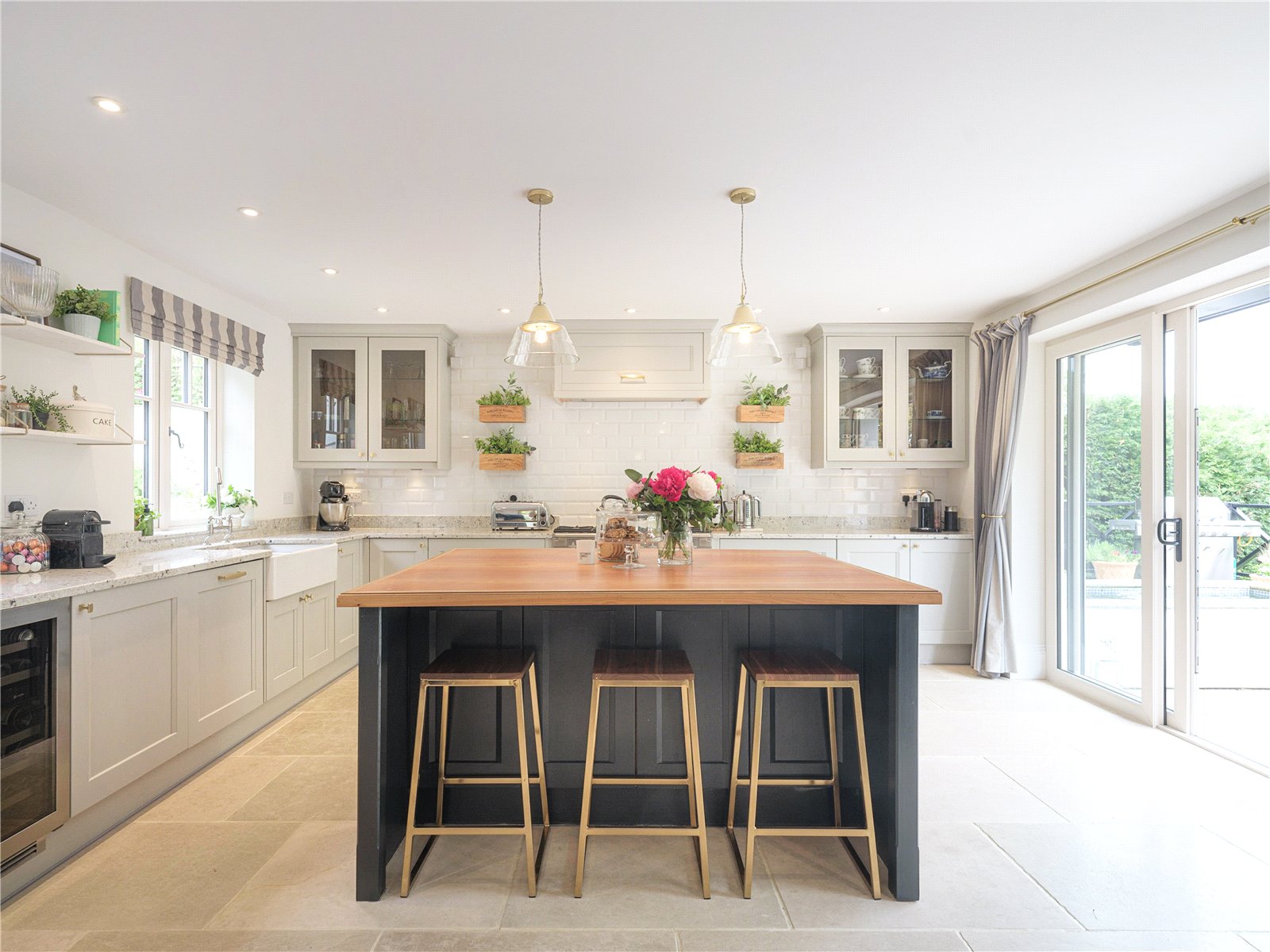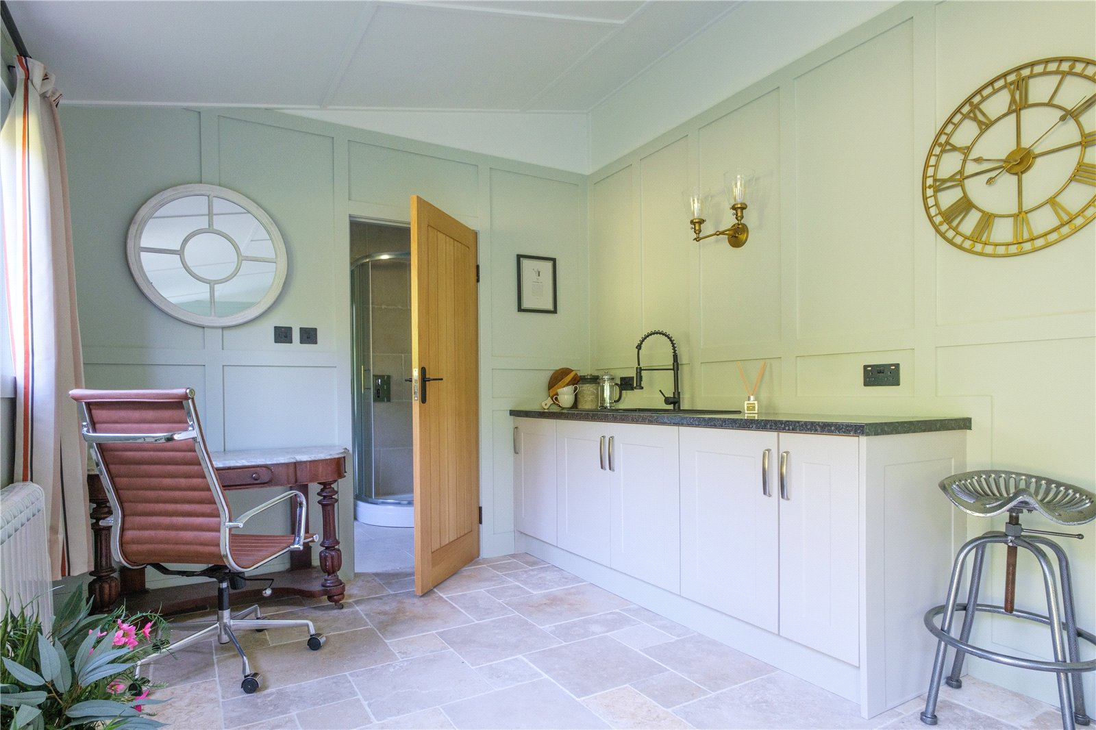 Every element of the internal design of Secret Valley showcases a seamless blend of high-quality craftsmanship alongside excellent room proportions, emphasizing space and light. There is a wonderful flow to the ground floor: a separate sitting room with a feature open fire can be separated off from the remaining ground floor for the cosy winter evenings, or alternatively, the original Crittall doors open out onto the versatile, dual aspect, L-shaped reception area with large sliding doors leading out onto the lawned, formal gardens. The impressive kitchen offers the perfect space for entertaining guests with a large central island, bar area and access straight onto the east-facing terrace. French Limestone flooring from the highly regarded Artisans of Devizes runs through the kitchen, with underfloor heating, leading from the entrance hall. The utility room and guest cloakroom are also located on the ground floor.
