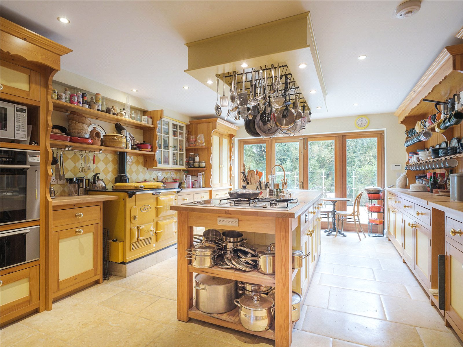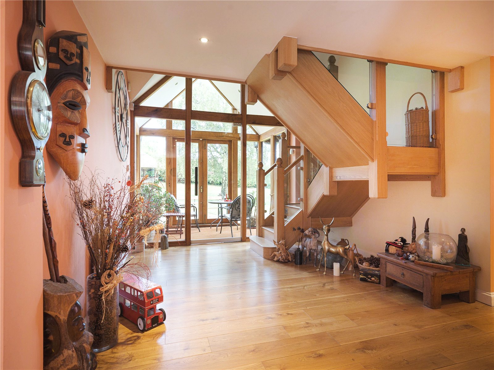 The interior is designed around the central spine of this impressive home, opening into open plan spaces and offshoots alike. Facing the Eastern side of the property is the large bespoke kitchen, designed by a local artisan, which centers around an island; ideal for entertaining families and guests, it includes built-in ovens, Aga, twin induction hob and gas hobs, two separately located sinks to help preparation for everyday cooking or hosting dinner parties. With views over the garden, the patio lines the whole eastern-exterior, an invitation to outdoor dining or relaxation and providing a natural link with the spacious dining room, flooded with light through the full width opening glazed doors adorning the entire eastern elevation. A fully functioning open fireplace is ready-made to create a gas fire feature in the dining room with views to the adjacent room and central reception hall, itself with vaulted ceilings and feature oak open-plan glazed stairway to the first floor. The triple aspect living room features to the rear of the property with views of the expansive garden on each side and a log-burning stove. The west-facing rooms include a study, also with working fireplace, a TV snug with working fireplace and utility/boot room with space for washer/dryers and additional storage.