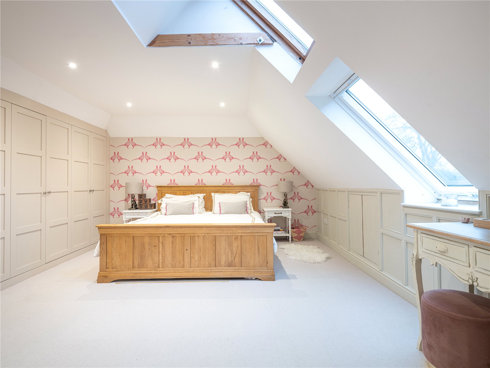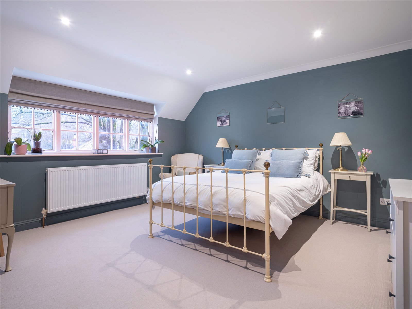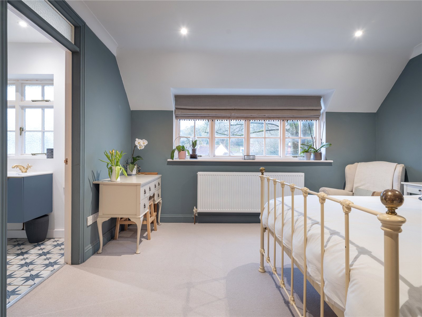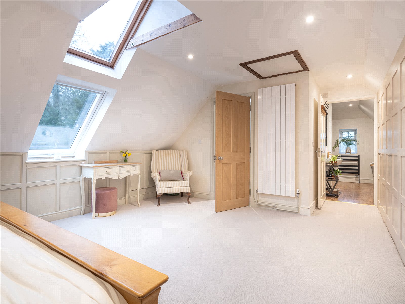 The large double guest suite bedroom features built-in wardrobes, generous en-suite bathroom with underfloor heating, walk in shower, large window flooding the room with natural light, with views over the front garden and village. All has been beautifully decorated and finished. There are a further 3 bedrooms on this level with a family bathroom and conveniently positioned laundry room.