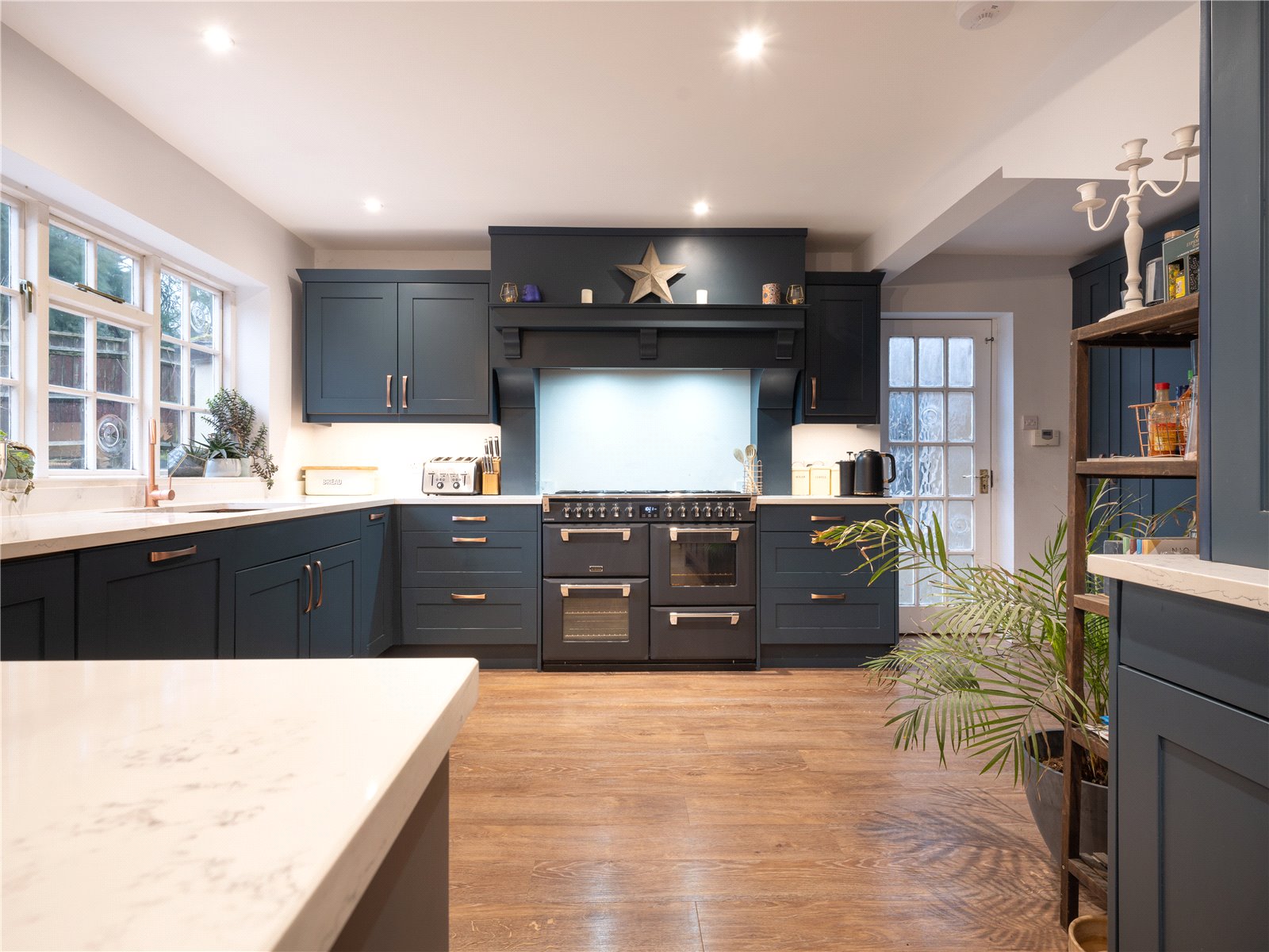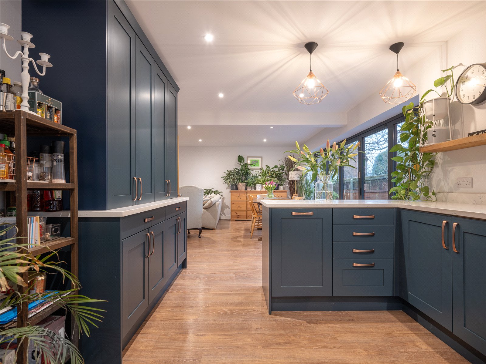 The spacious hallway welcomes you into this gorgeous family home, taking you through to the expansive open-plan kitchen living room. The heart of the home is the beautifully bespoke shaker-style kitchen, where elegance meets functionality. The open layout flows effortlessly into the dining area, creating a bright and inviting atmosphere, enhanced by large bi-fold doors that open onto the garden, bringing the outdoors in. The meticulous design and attention to detail has been well planned throughout, giving alluring aesthetics, and practical living solutions with plenty of storage. The living room is a spacious yet cosy room to unwind, enjoying the views through the bi-folding doors out into the garden. The ground floor has underfloor heating throughout. Off the hallway is the downstairs WC and a large practical boot room / utility with side door access, complete butlers sink and further storage.