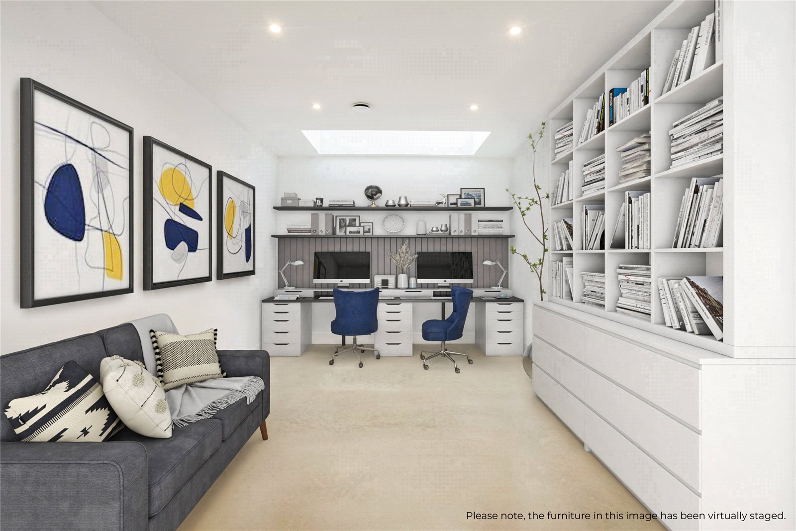 The open flow of the ground floor allows great flexibility in the way in which the space is used. The wonderful modern kitchen is adjoined by light-flooded dining area. An asymmetrical vaulted ceiling above the kitchen is reminiscent of a barn conversion, and the light-reflecting polished concrete floors throughout the ground floor give continuity and a delightful contemporary feel. It's not hard to imagine this space filled with people, the layout being ideal for entertaining guests. A sitting room with log burner provides a cosier space, and a study room/playroom and additional reception room can be found further down the hall. The utility room features a side entrance, making it perfect as a boot room, and a plant room and downstairs WC complete the ground floor.