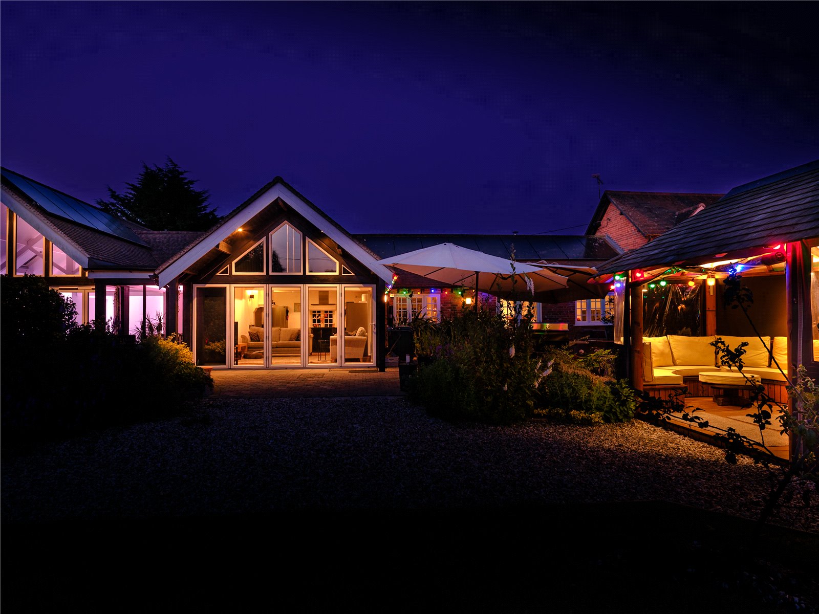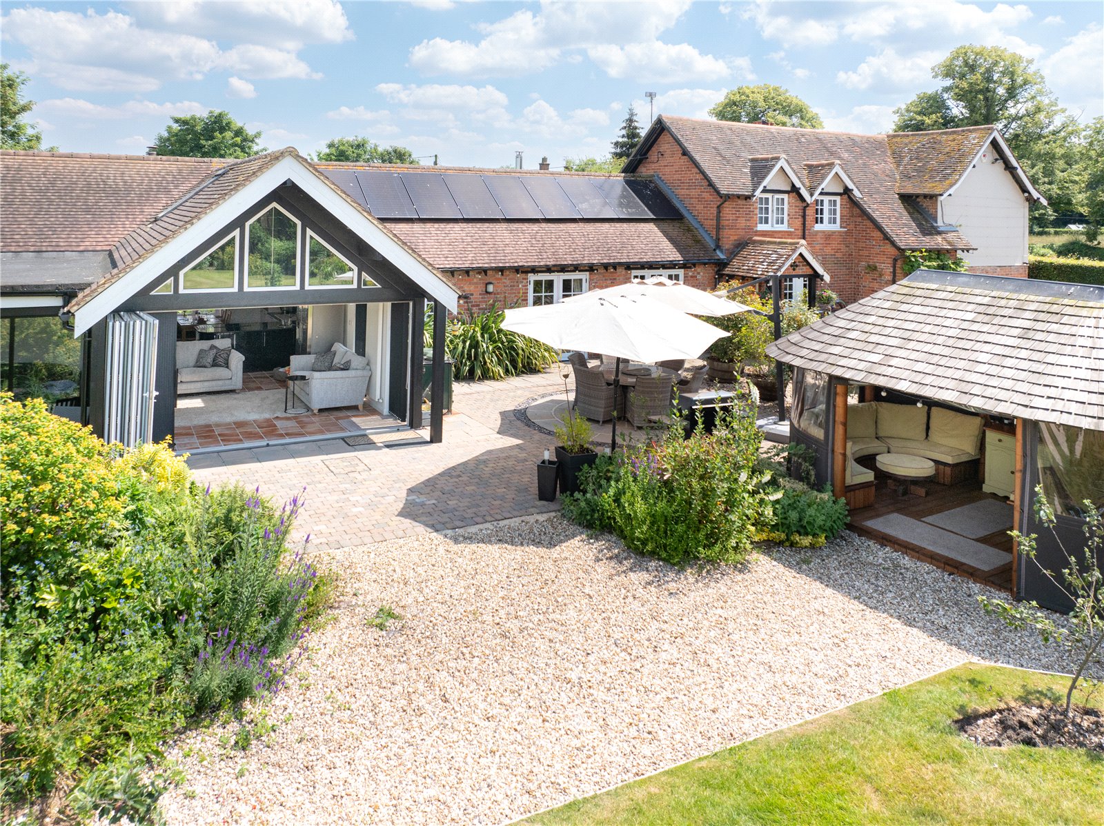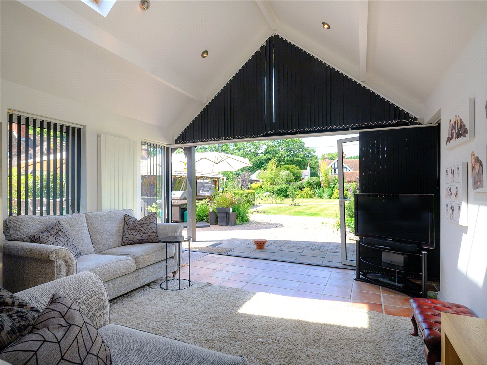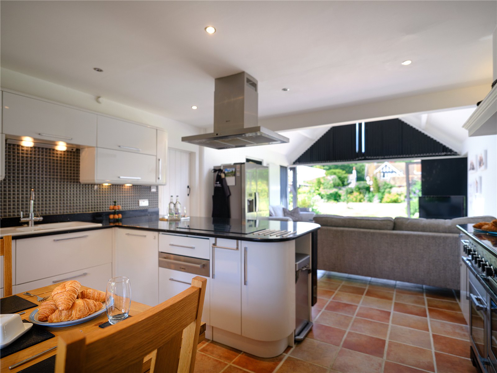 - Bright and Airy Kitchen/Family Room: Contemporary design with granite countertops, vaulted ceilings, and bi-fold doors opening to the garden.