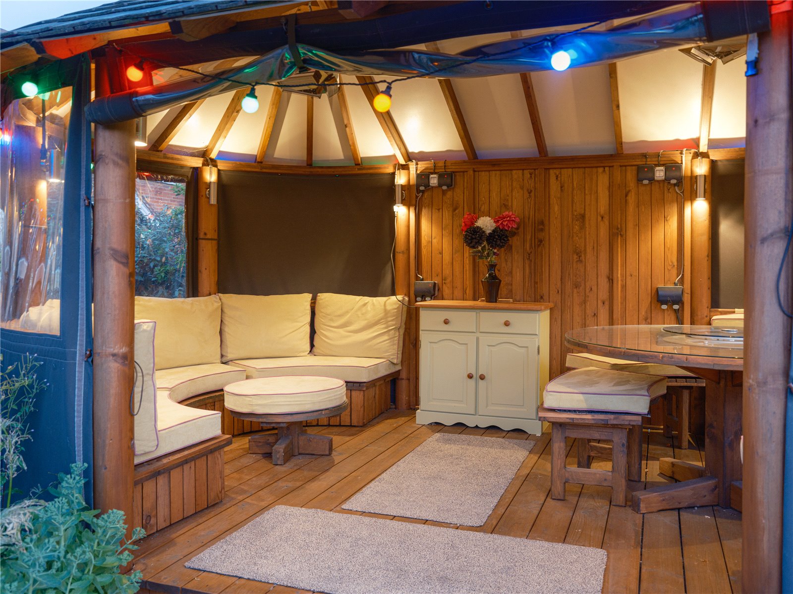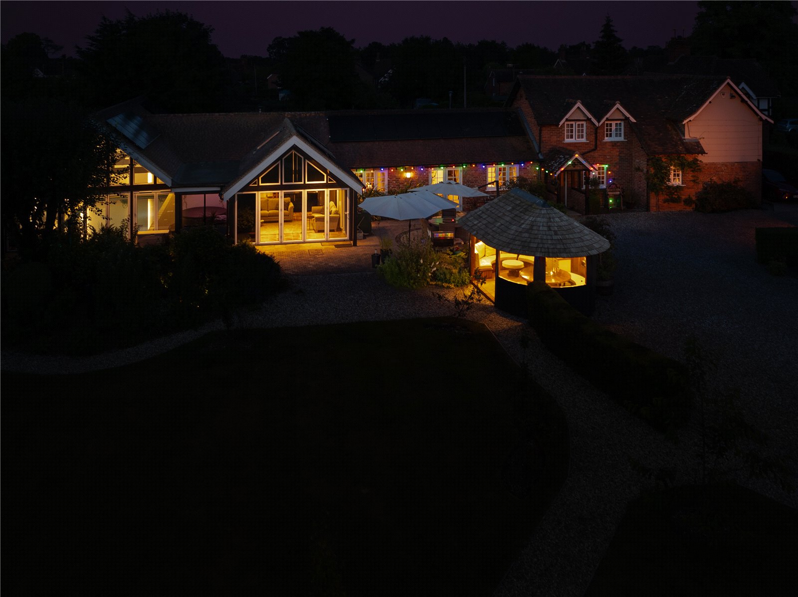 Entertainment Ready: Includes a raised terrace and a sophisticated garden gazebo equipped with seating, dining areas, power, and heaters.