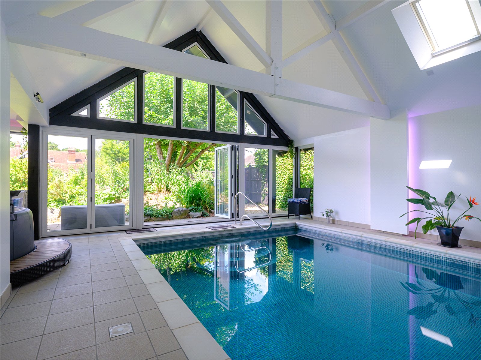 Safety and Convenience: Features a retractable safety cover and bi-fold doors for seamless indoor-outdoor living.