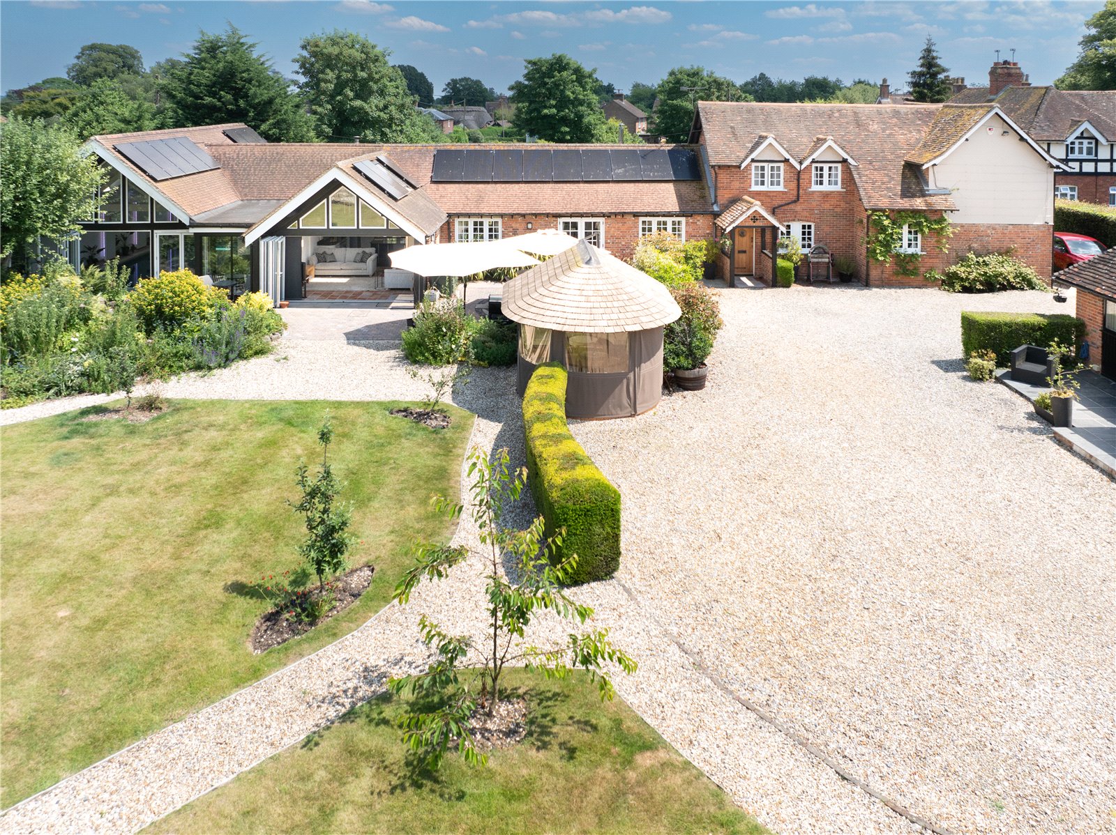 Private and Secure: Accessed via a long gravel drive with electric gates, leading to a courtyard with ample off-road parking and an electric charging point.