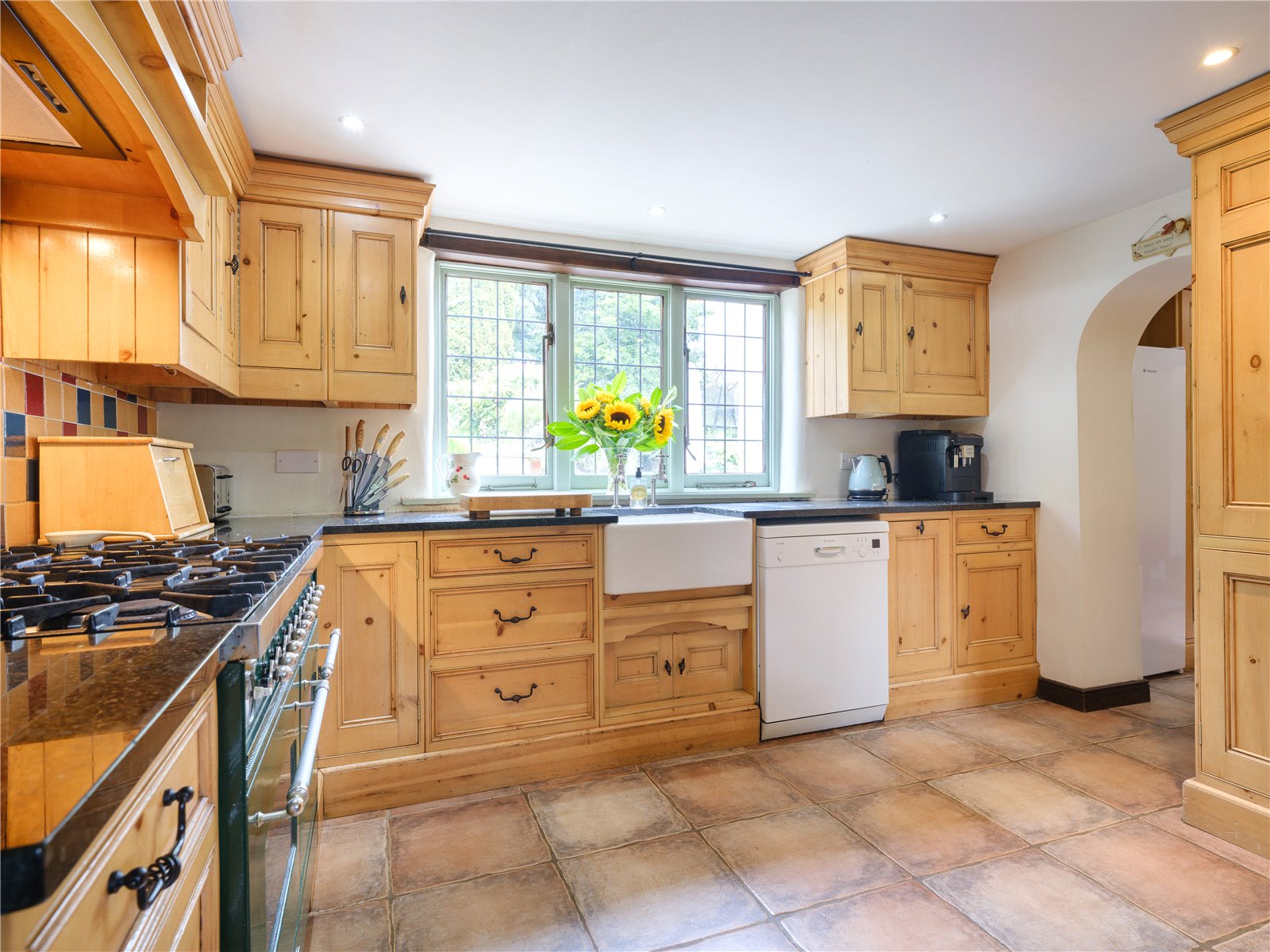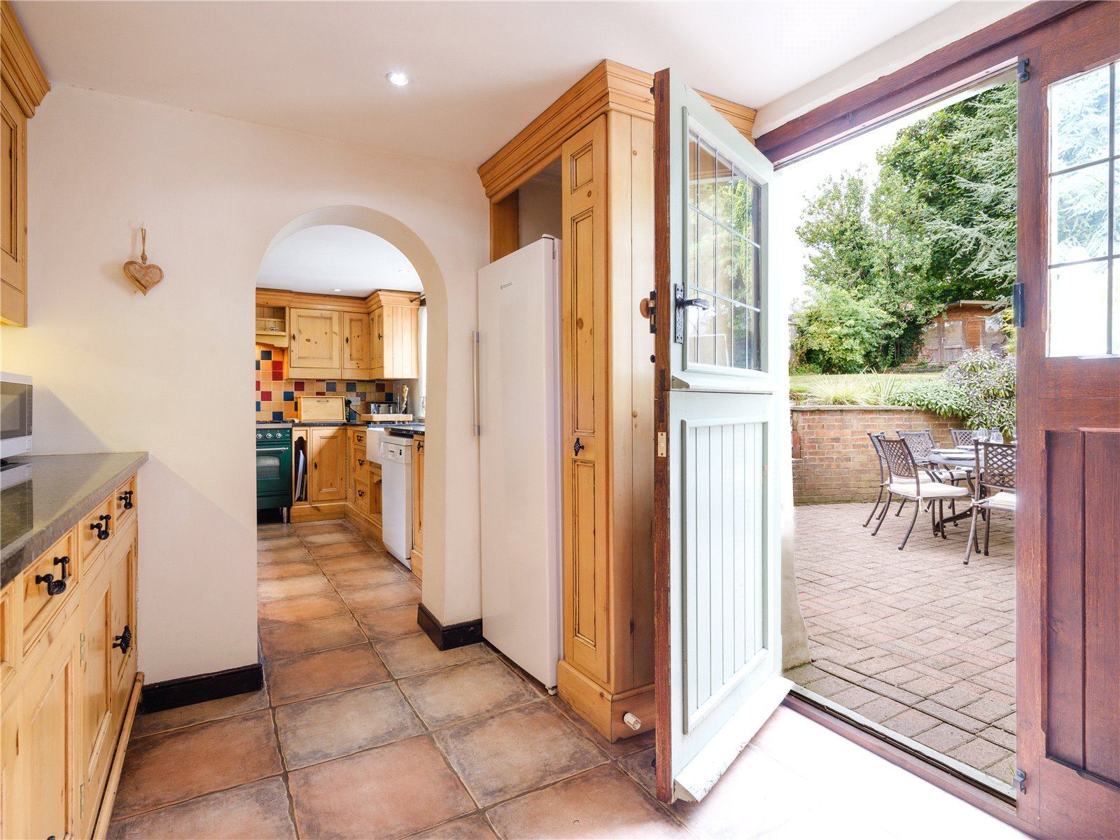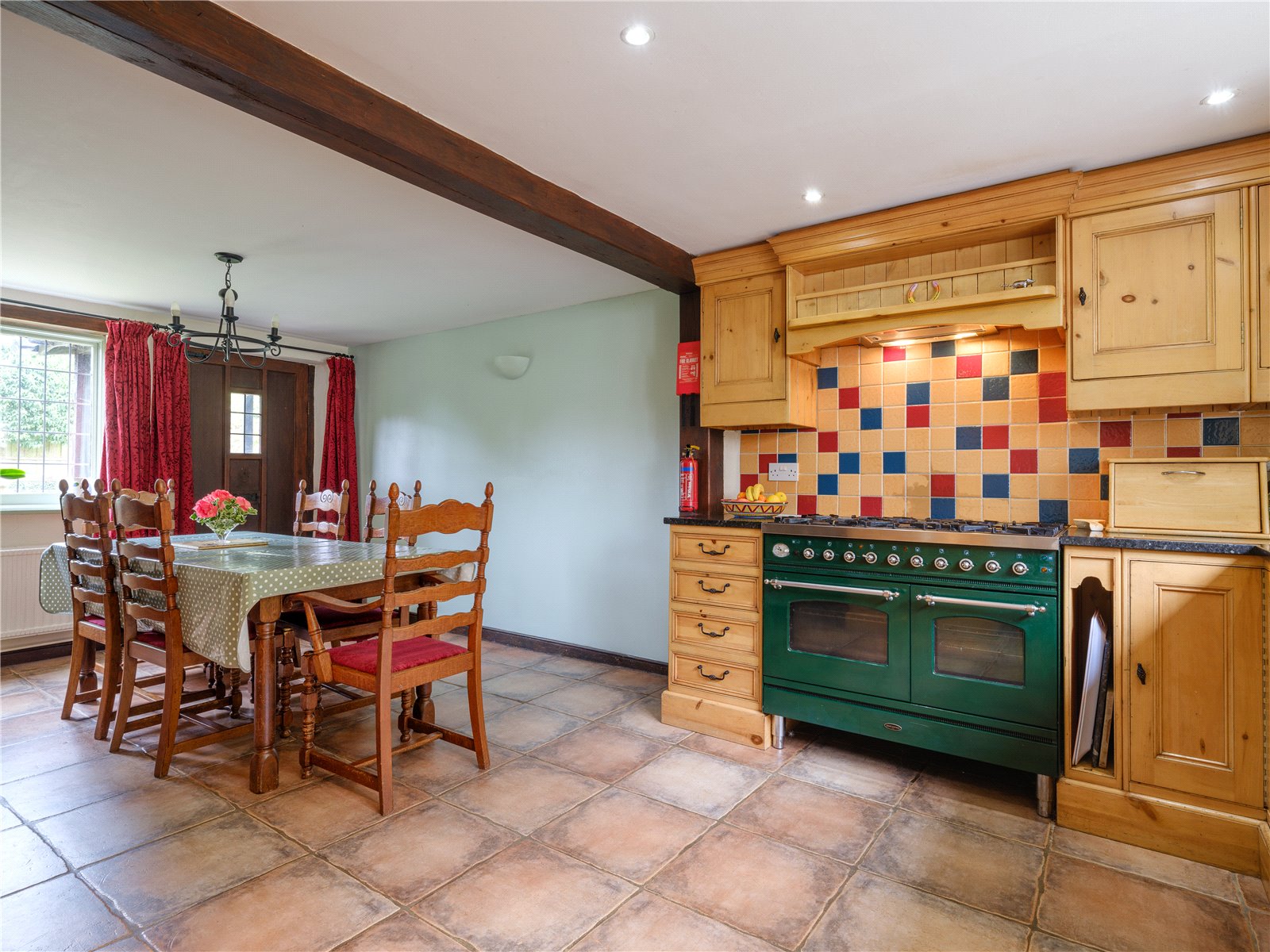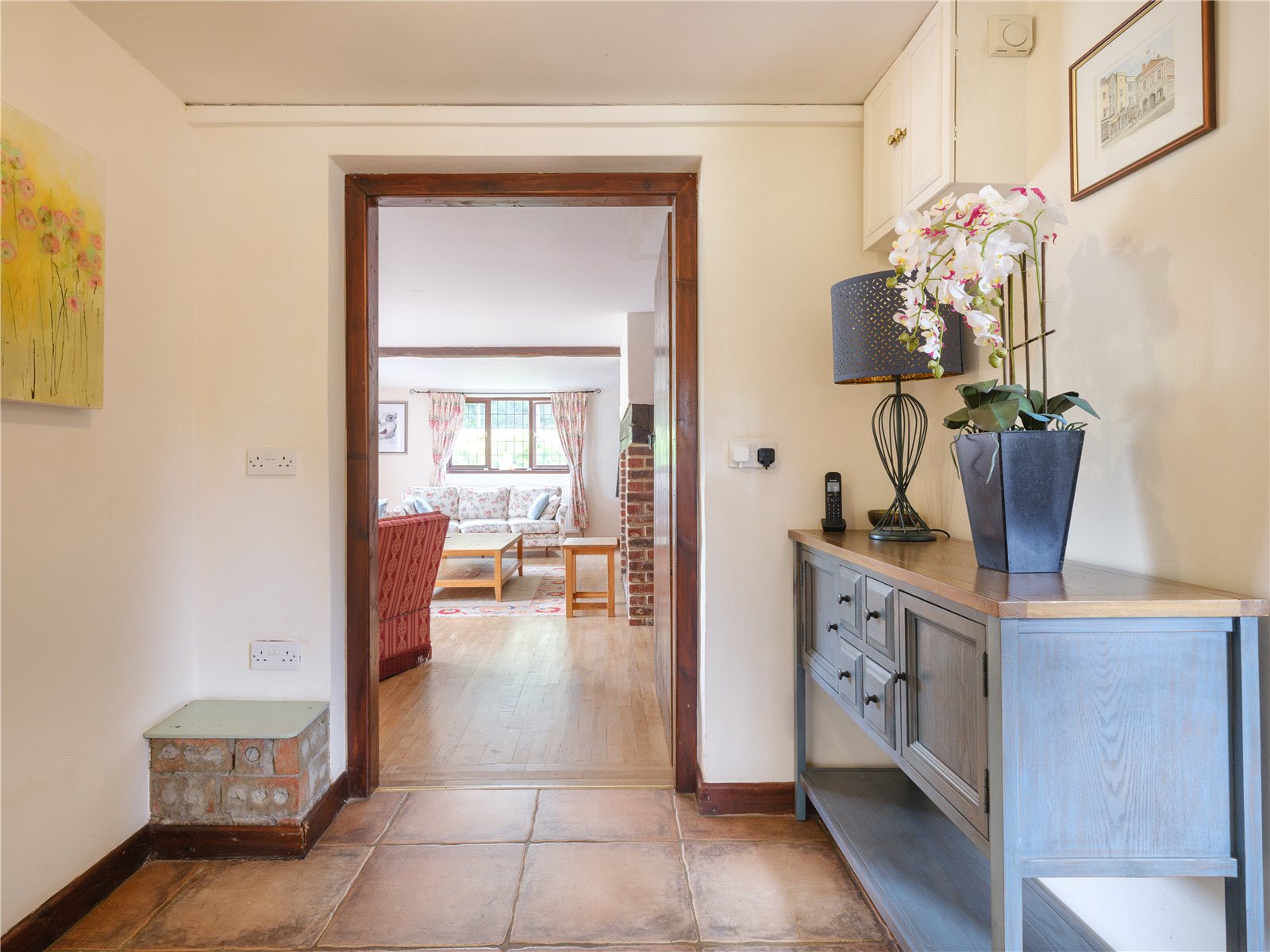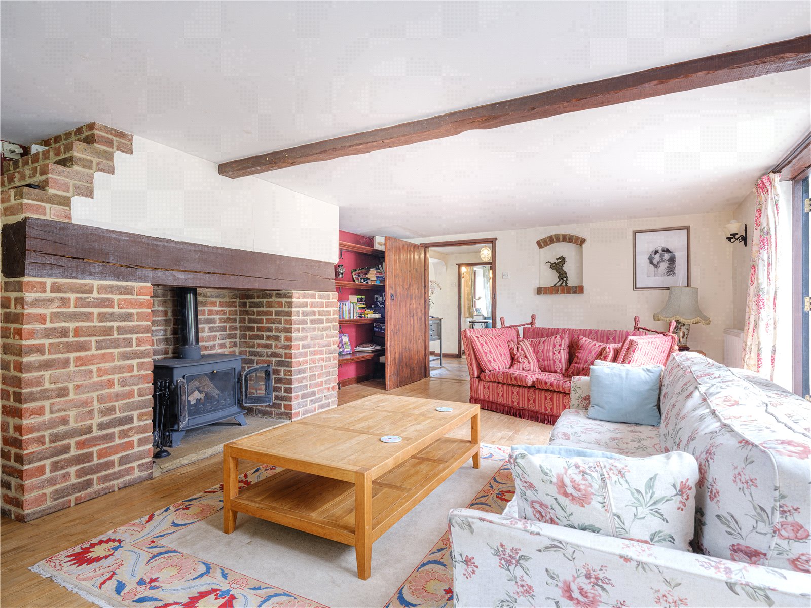 A spacious entrance hall leads off the driveway, from which the boot room/utility can be accessed, and from there also the double garage. The generous sitting room offers lovely views over the terrace and garden beyond through double doors. The attractive brick built inglenook fireplace with solid timber lintel is fitted with a log burning stove which helps to create a cosy space and delightful ambience throughout the colder months.