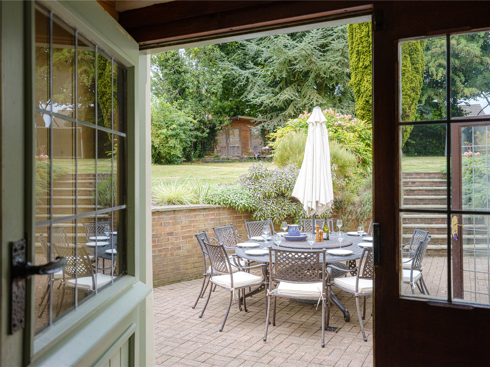Hedging to the front of the property provides excellent privacy from the street and the front garden offers an area of lawn, mature flower beds and shrubs. The gated driveway parking to the front of the double garage. A superb terrace leads off the rear of the property offering the ideal space for outdoor dining and entertaining. The rear garden is an excellent size predominately laid to lawn with mature trees and shrubs. The summer house/office has electric power, and in addition there is a shed and a greenhouse.