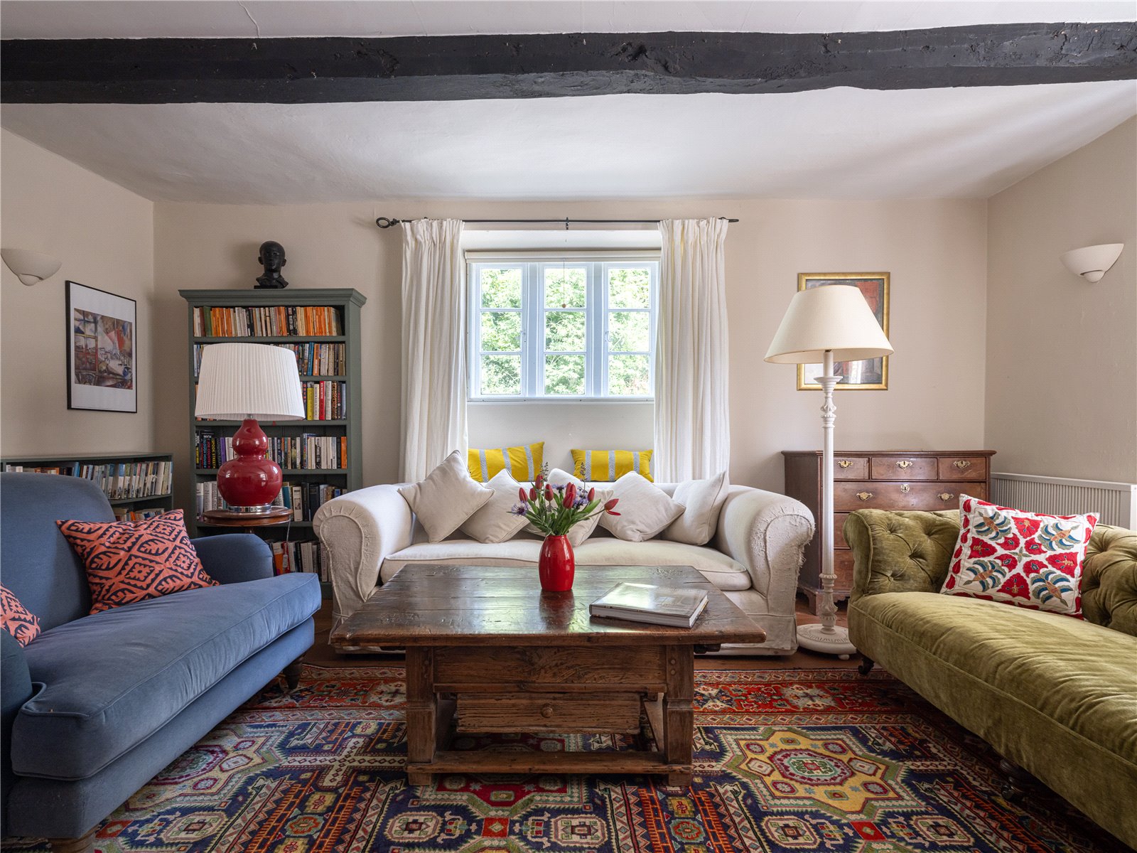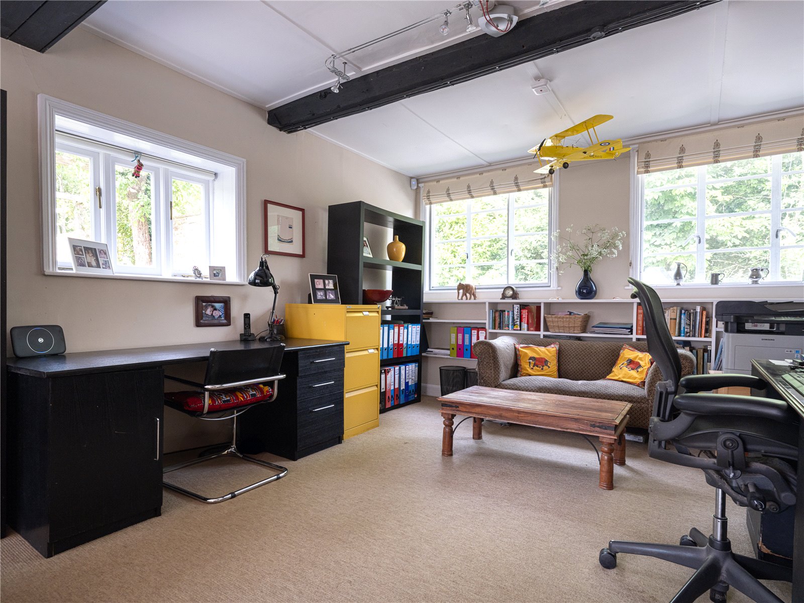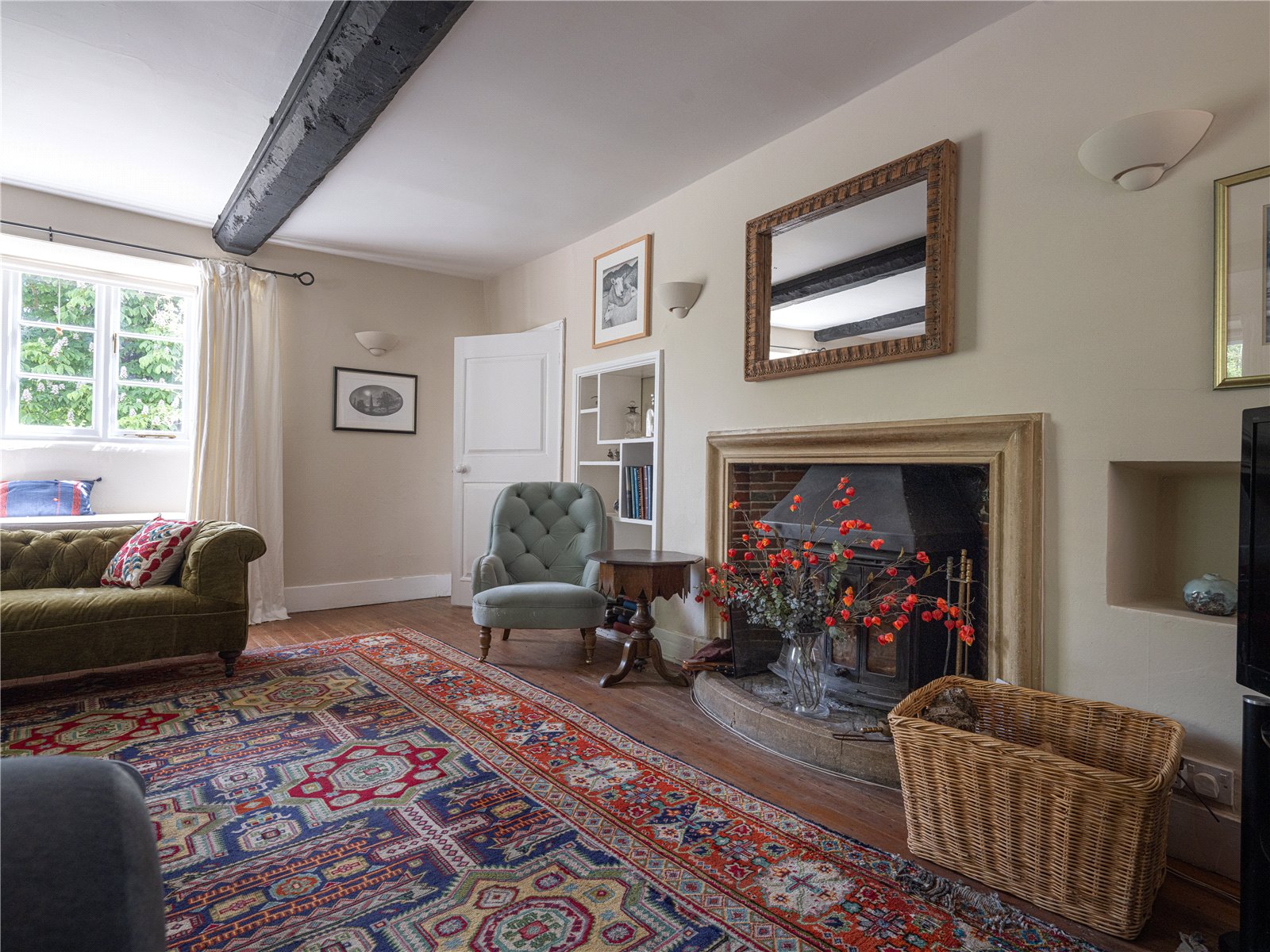 There's a pleasing symmetry to the layout of March House's ground floor. On entering the large hall, the farmhouse kitchen/diner, family room and utilities are to the left; go right to 2 spacious interconnected reception rooms (one currently used as a study). Both wings have doors to the back garden. The hall itself is a great space for more formal entertaining, with its wood burner and French doors with a view onto the terrace and pond. Off the hall are also doors to a WC/boot room and to the cellar.